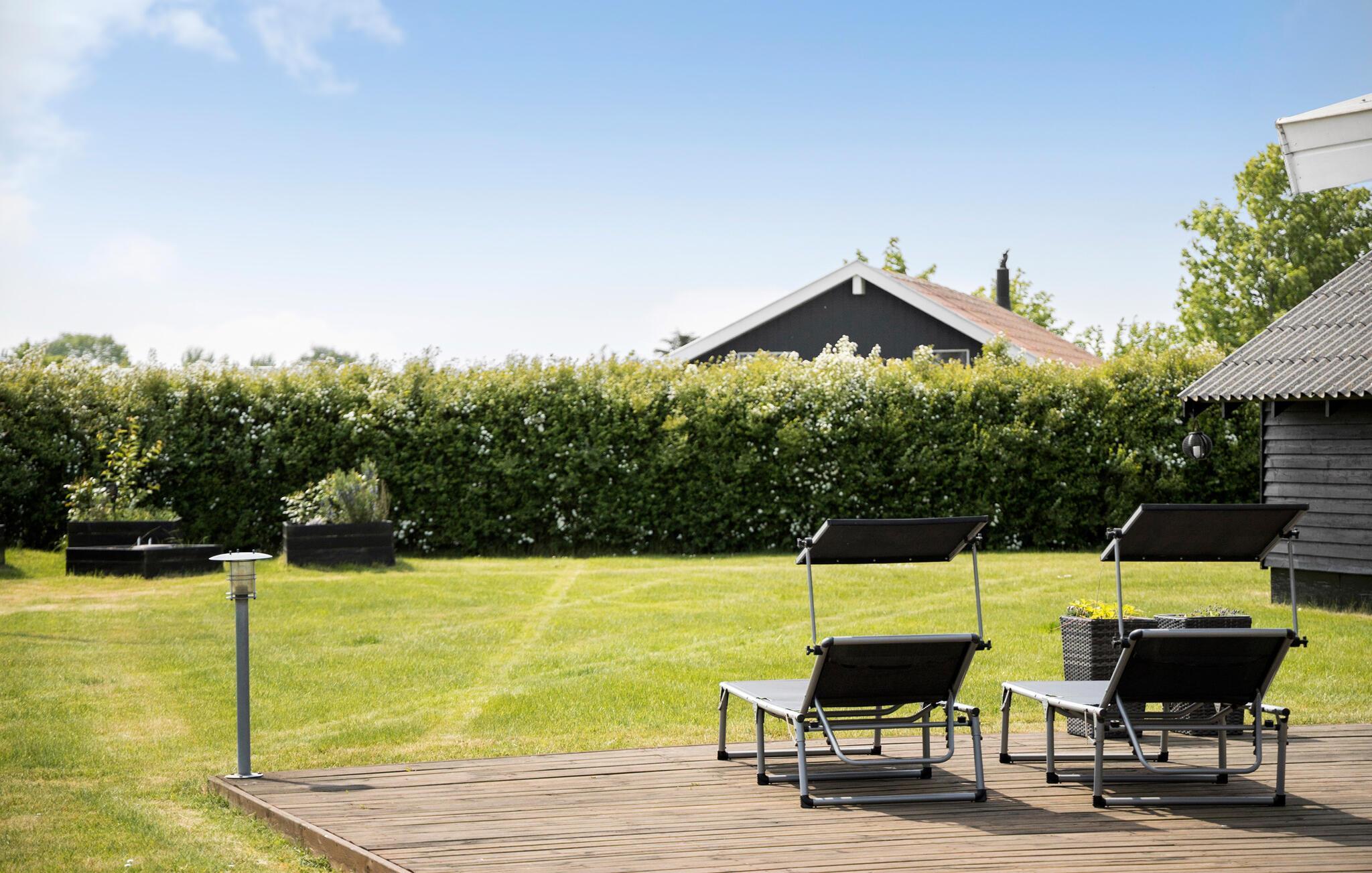 Strandnært sommerhus med stor terrasse og have