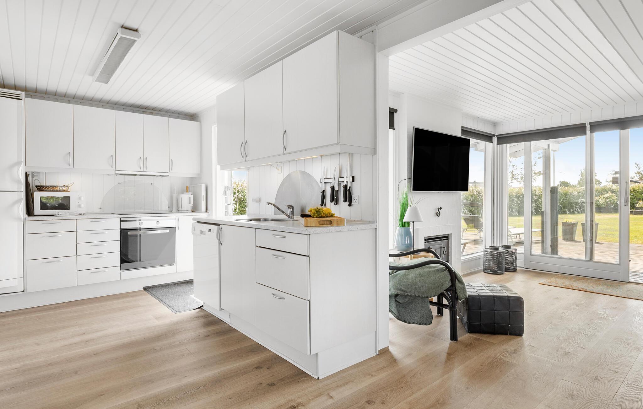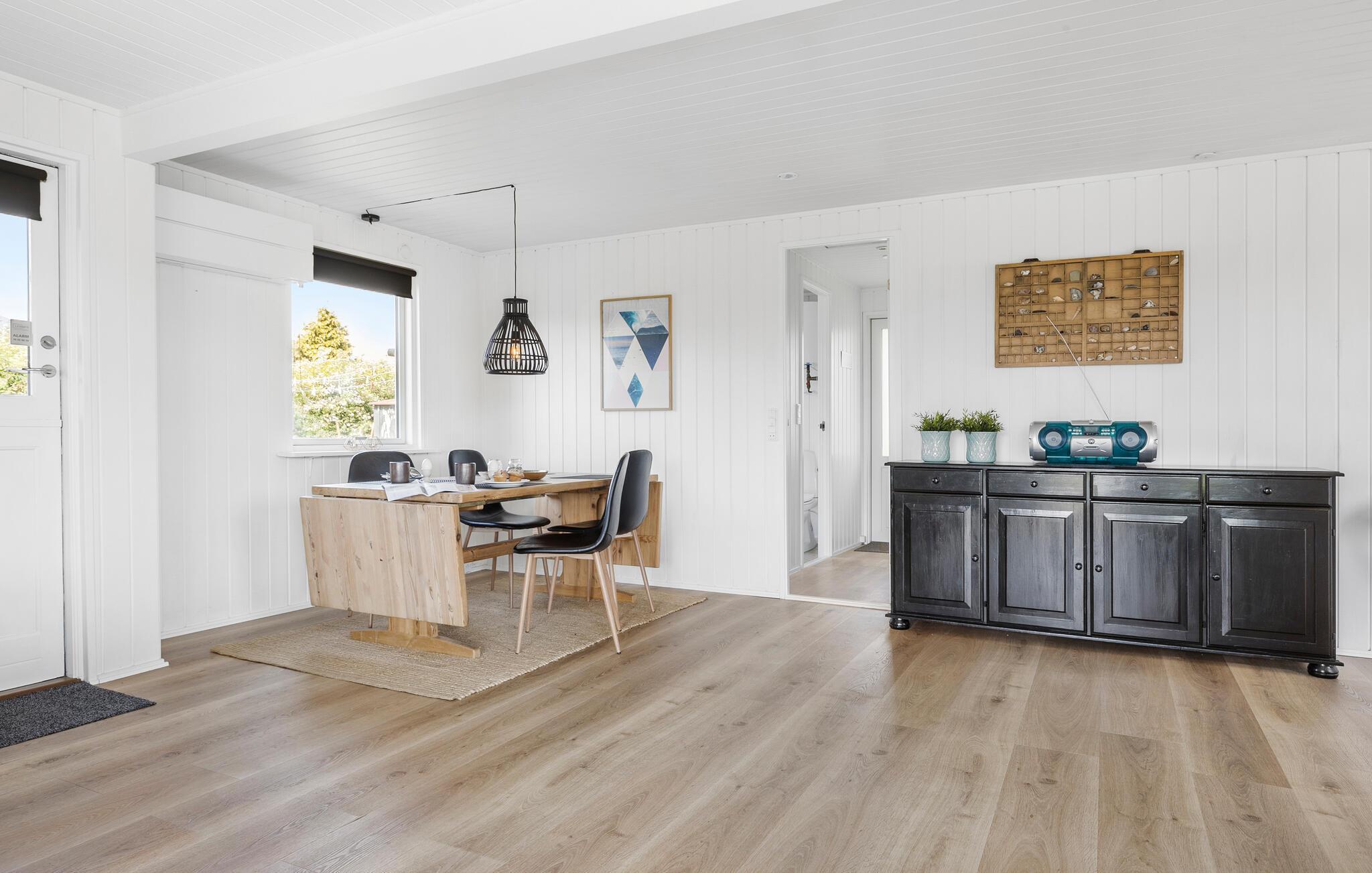 Forkæl jer selv med en pause i dette stilfuldt indrettede feriehus, som ligger kun 150 m fra den lange sandstrand. Nyd afslappende timer på den komfortable sofa, mens I læser en god bog, spiller brætspil eller lytter til pejsens knitren på køligere dage. Lad det udstyrede køkken friste jer til at tilberede jeres livretter sammen.