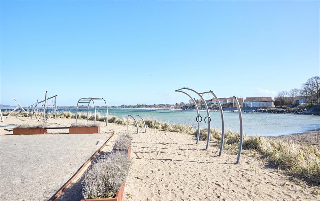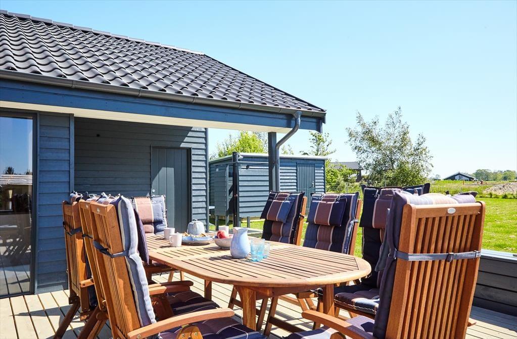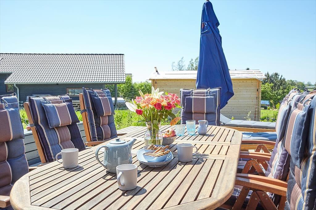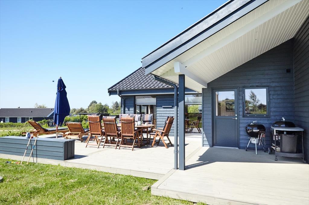 Udendørs kan sommerhusets store træterrasse nydes, Her kan du ligge og slikke sol imens børnene boltrer sig i haven med nogle af husets havespil. Når duggen falder i løbet af aftenen, så er der en god overdækket terrasse at sidde under. I haven er der et bål sted, hvor en god aftenstund kan nydes med snobrødsbagning eller måske skumfiduser.