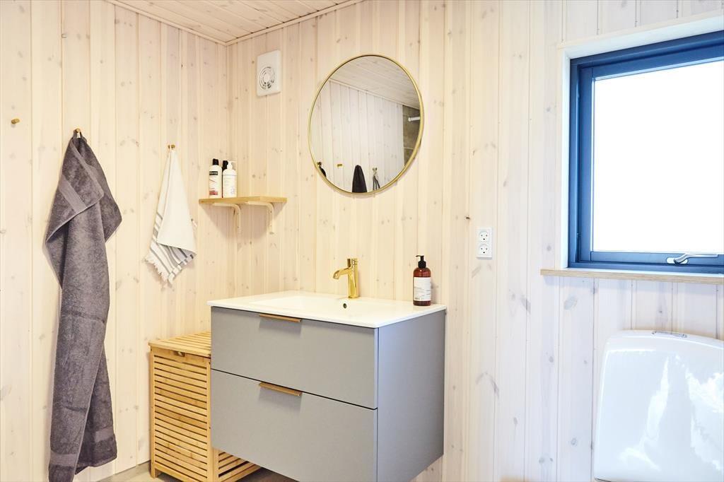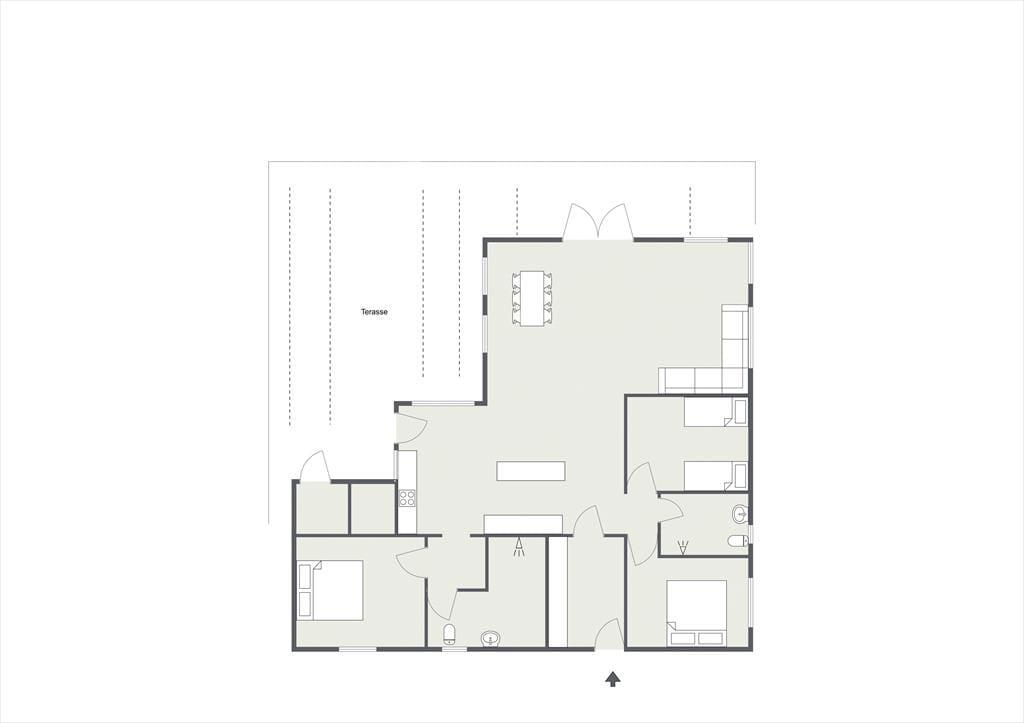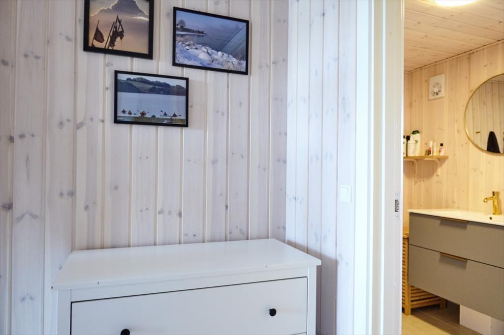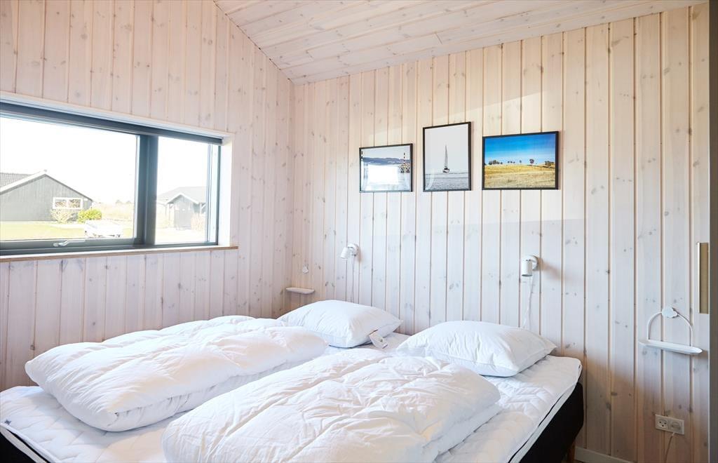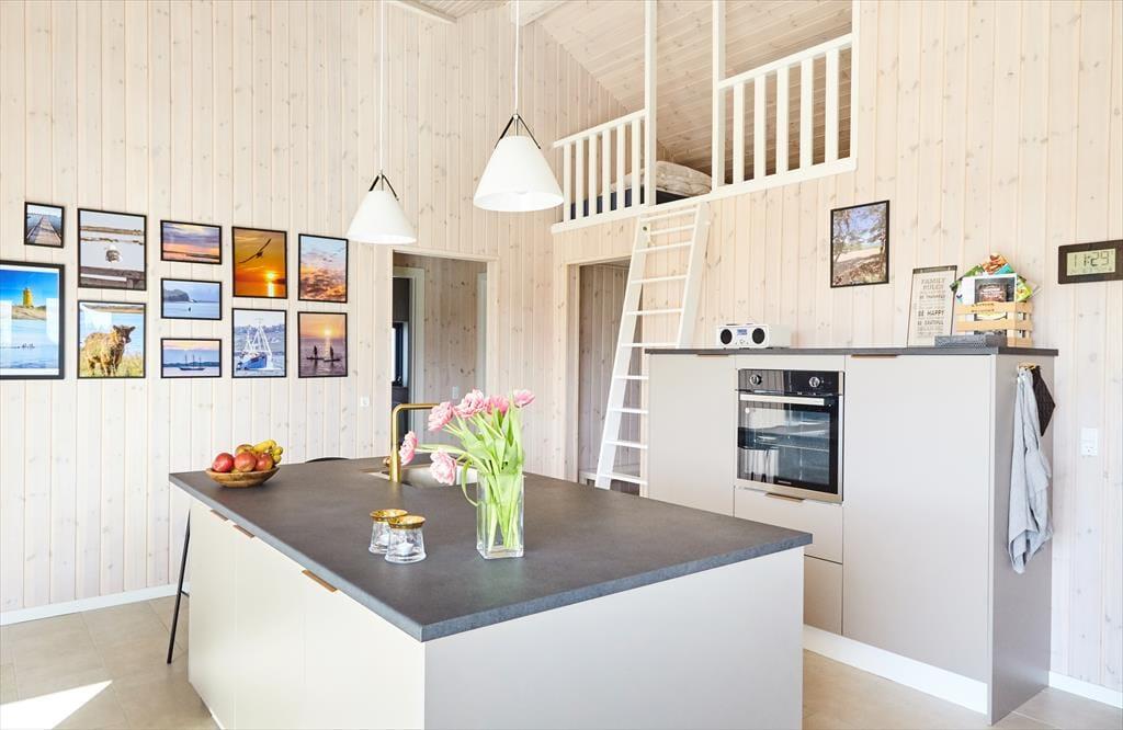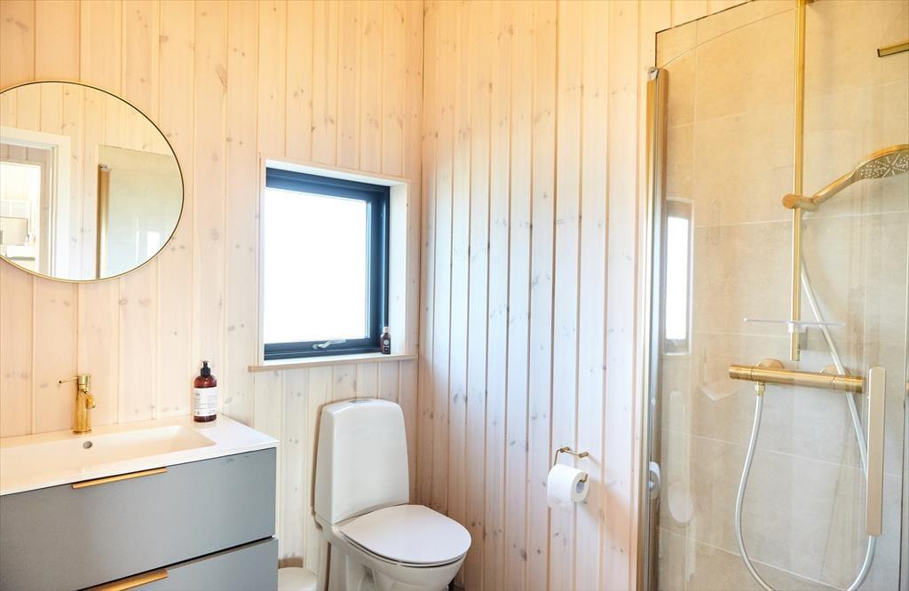 Sommerhuset fremstår lyst, indbydende og moderne. De store vinduespartier giver masser af lys inde i sommerhuset, og da huset ligger højt, så er der endda kig ud til den skønne natur. Sommerhusets planløsning er ideelt for 2 familier. Huset har et stort køkken med masser af udstyr så der kan både bages pandekager eller varmes cacao. Helt ideelt til både et sommer eller et vinterophold. I den store stue er der plads til alle når der skal hygges i sofaen om aftenen. Husets store hems vil helt sikkert glæde børnene, her kan de hygge sig i deres egen lille ”hule” og spille spil. Til de varme sommerdage er der ventilatorer på værelserne og på hemsen.