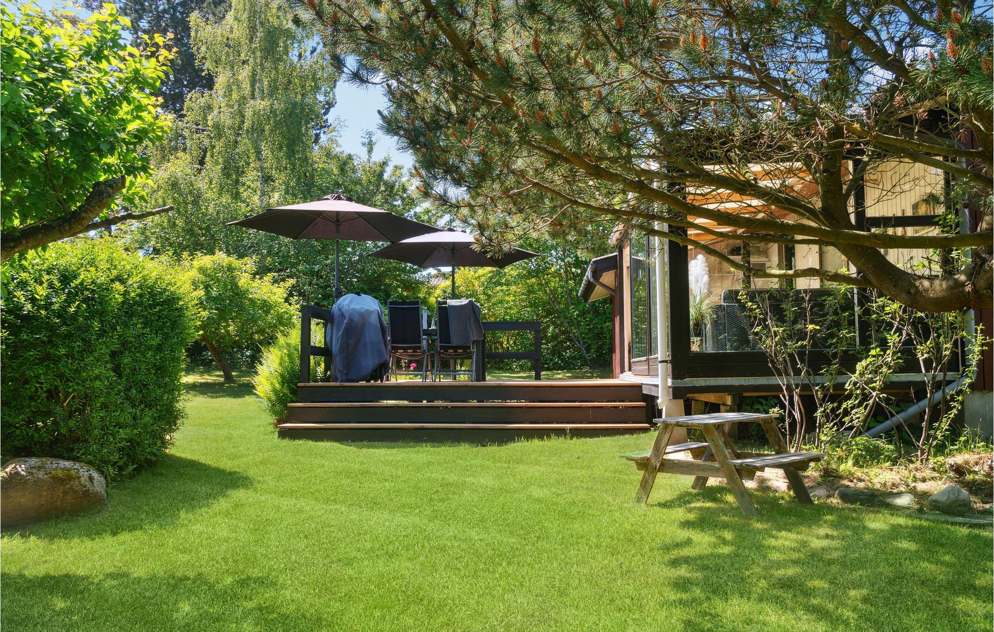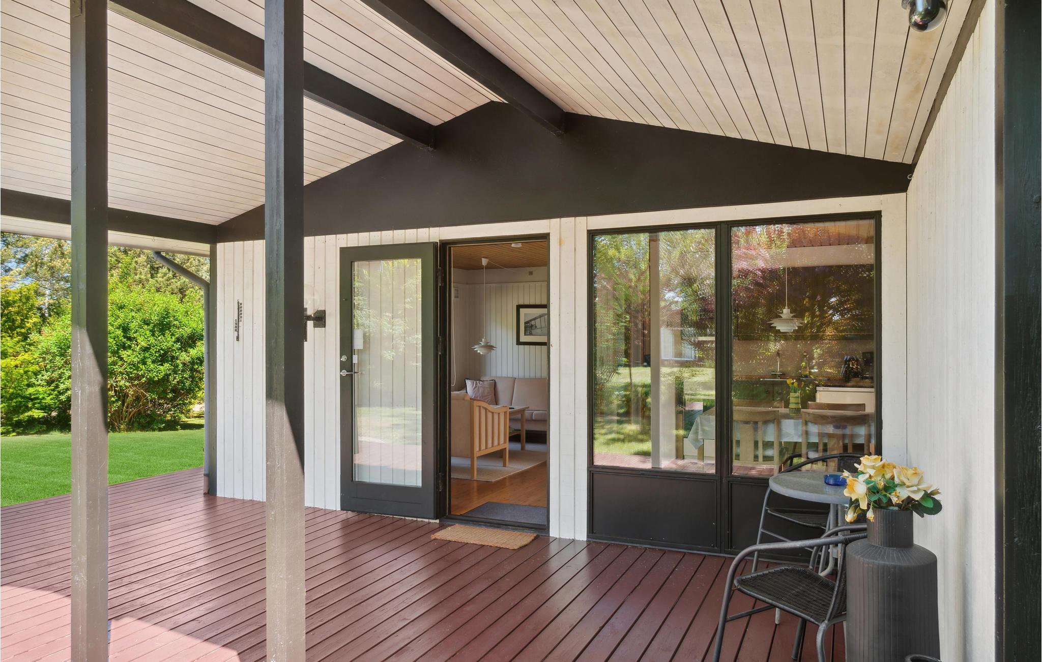 Udendørs venter en åben terrasse med havemøbler. På kølige dage kan I sætte jer i udestuen og nyde solens varme gennem vinduesvæggen, der kan trækkes til side.