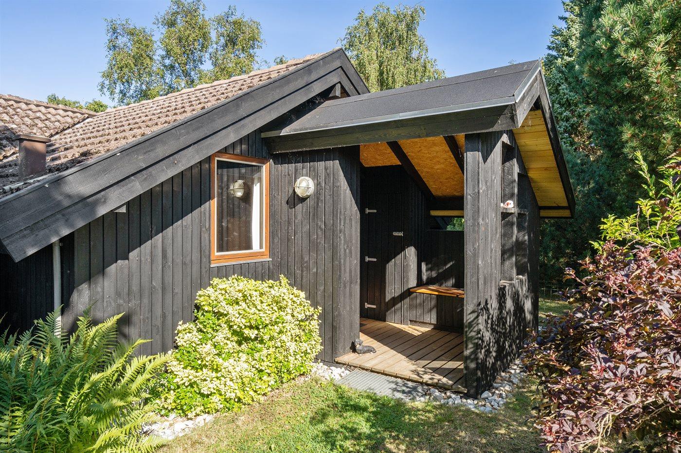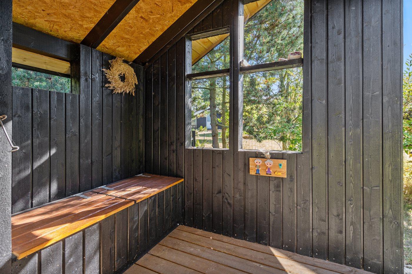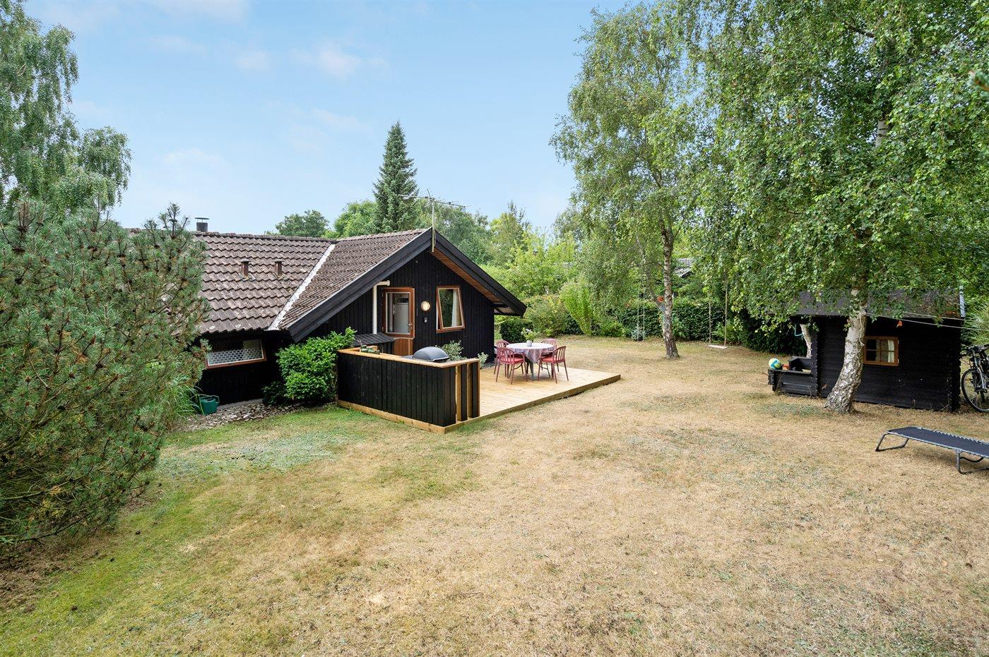 Ferieboligen er beliggende på en 1200 m² stor naturgrund. Der er 200 m til havet. Nærmeste forretning er beliggende i en afstand af 2000 m. Til ferieboligen hører 25 m² terrasseareal. Desuden er der 9 m² overdækket terrasse. Gynge. Legehus. Grill til rådighed. Der er installeret stik til opladning af elbil. Type 2 stik. Parkering ved ferieboligen.