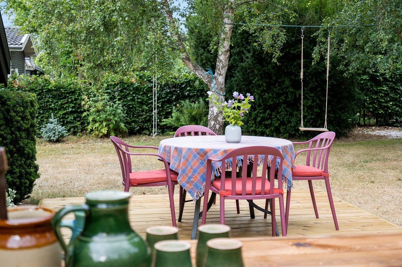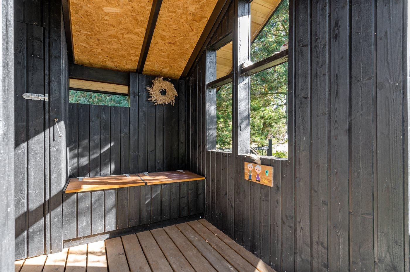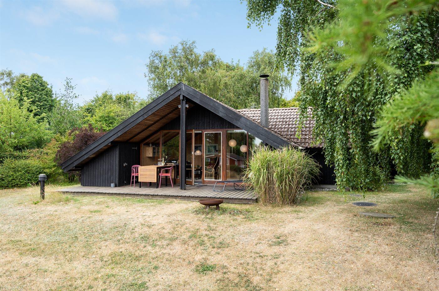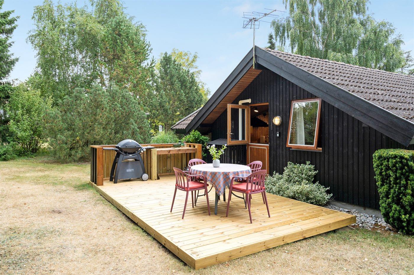 Ferieboligen er beliggende på en 1200 m² stor naturgrund. Der er 200 m til havet. Nærmeste forretning er beliggende i en afstand af 2000 m. Til ferieboligen hører 25 m² terrasseareal. Desuden er der 9 m² overdækket terrasse. Gynge. Legehus. Grill til rådighed. Der er installeret stik til opladning af elbil. Type 2 stik. Parkering ved ferieboligen.