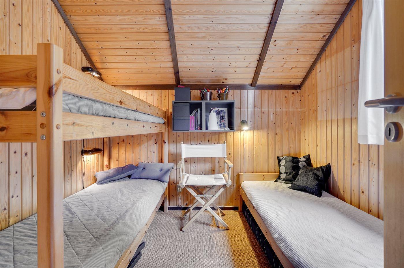 Der er i alt 3 soveværelser. Sovepladserne fordeler sig på: 2 sovepladser i dobbeltseng. 1 soveplads i enkeltseng. 2 sovepladser i køjeseng.