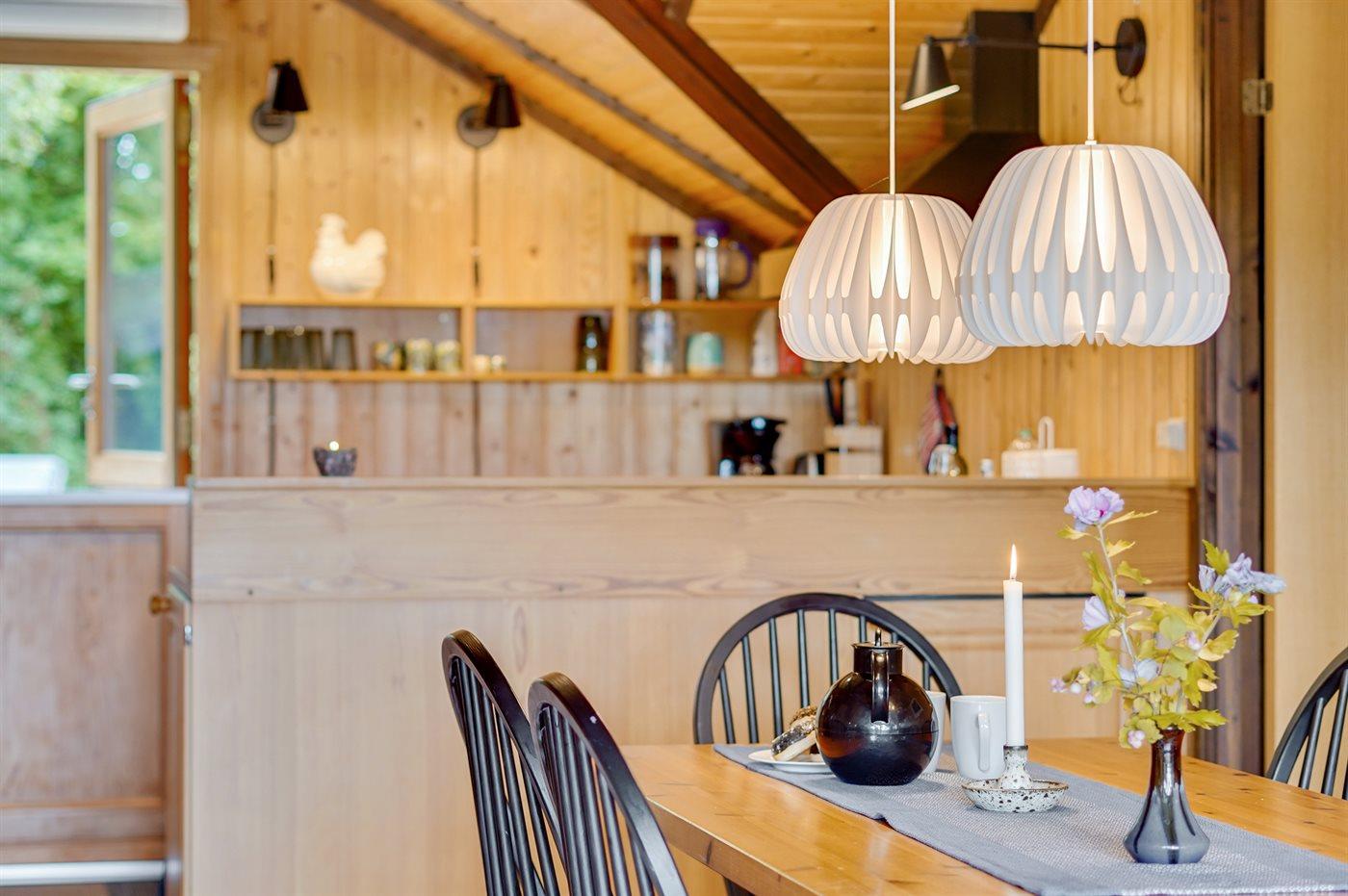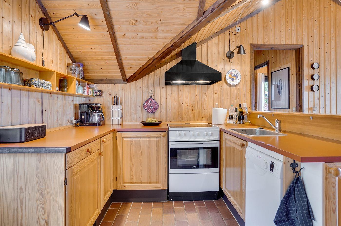 Køkkenet er udstyret med 1 køleskab. Der er 4 keramiske kogeplader, varmluftovn samt opvaskemaskine.