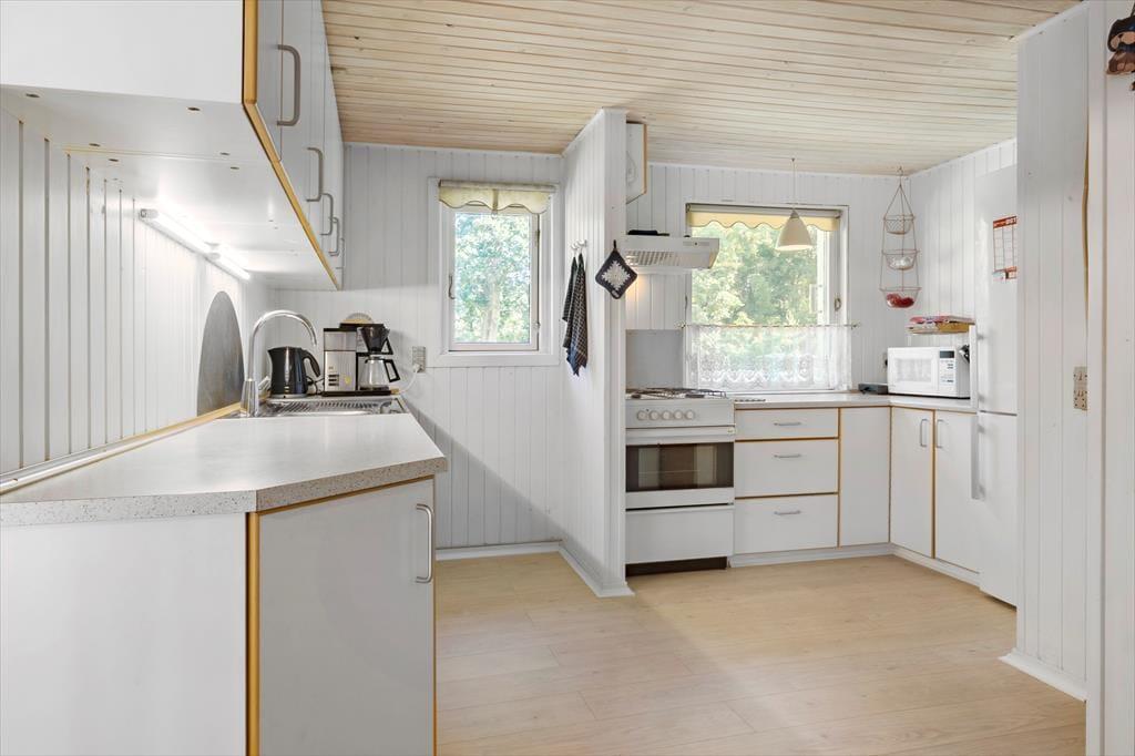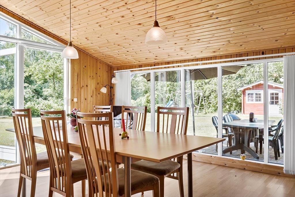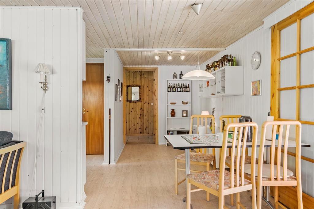 Tre store soveværelser og to lidt mindre ligger godt fordelt i sommerhuset, så I får rig mulighed for at få en god nats søvn – selv hvis dele af selskabet skulle snorke eller gerne vil blive længe oppe. I opholdsafdelingen har I masser af plads til at hygge jer: Der er flere spiseborde, hvor I kan samles til et lækkert måltid eller finde jeres medbragte brætspil frem, og det komfortable sofaarrangement indbyder til total afslapning, for eksempel med ild i brændeovnen og en spændende film i tv. Et rummeligt køkken med opvaskemaskine ligger som del af opholdsafdelingen, og fra entréen har I adgang til et stort badeværelse med bruser, vaskemaskine og tørretumbler.
