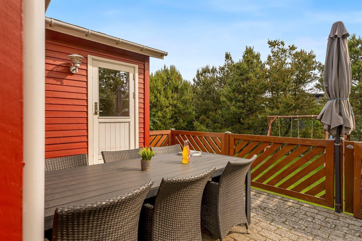 Ferieboligen er beliggende på en 1114 m² stor naturgrund. Der er 400 m til havet. Nærmeste forretning er beliggende i en afstand af 2000 m. Der er en golfbane i en afstand af 20000 m. Til ferieboligen hører 14 m² terrasseareal. Desuden er der 14 m² overdækket terrasse. Der er redskabsrum. Gynge. Sandkasse. Parkering ved ferieboligen.