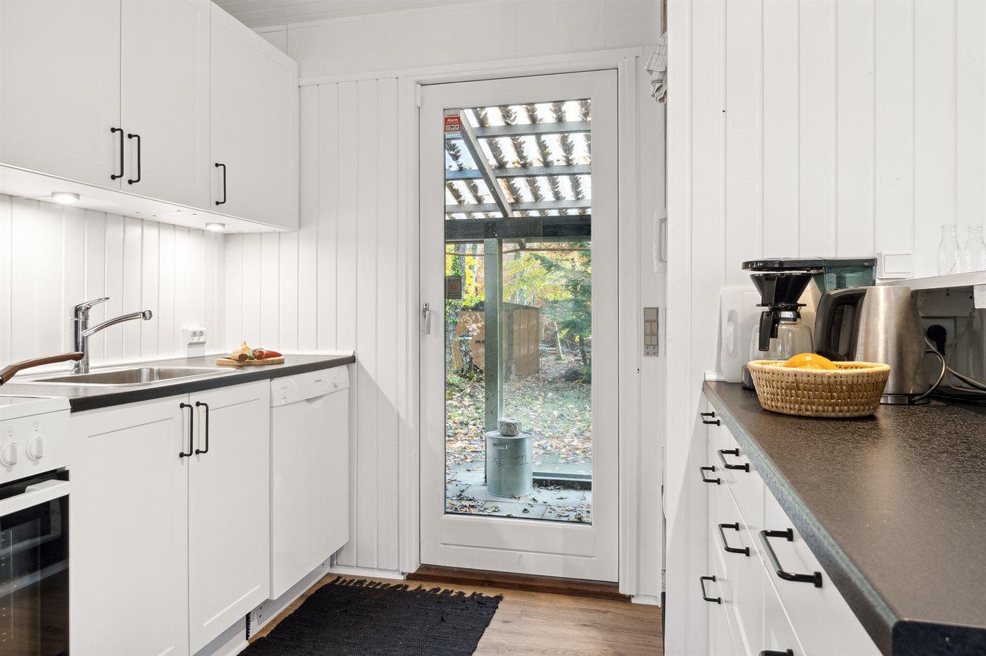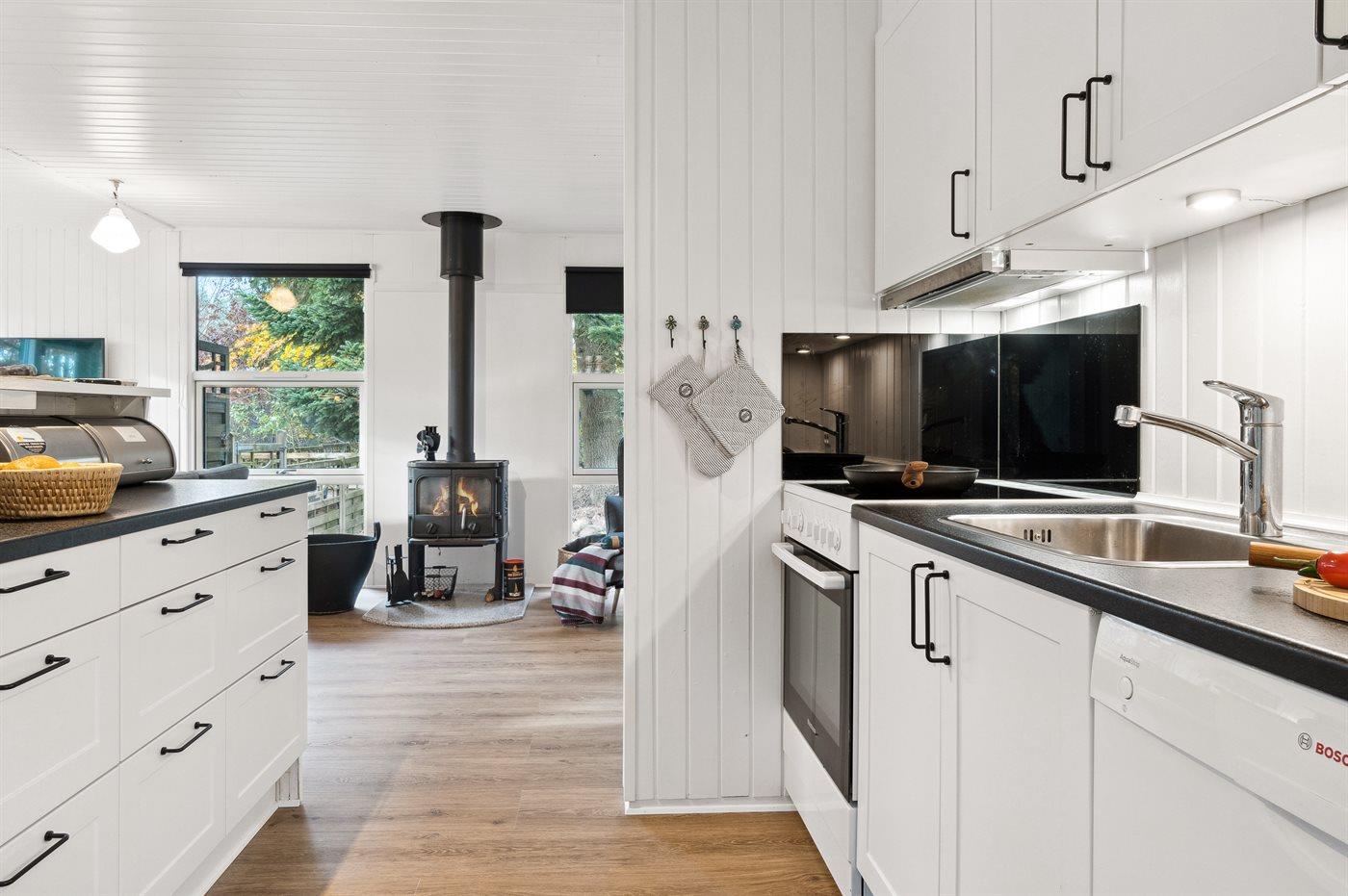 Køkkenet er udstyret med 1 køleskab. Der er 4 keramiske kogeplader, varmluftovn, mikrobølgeovn samt opvaskemaskine.