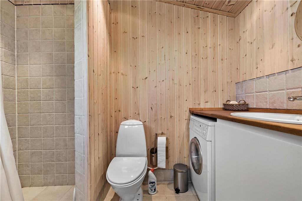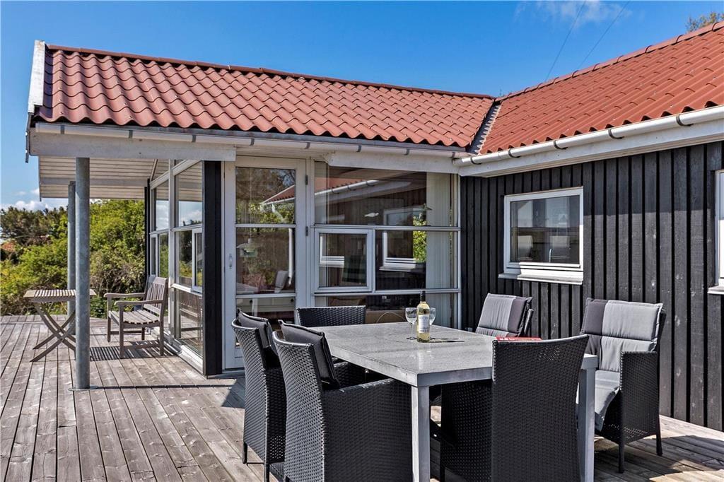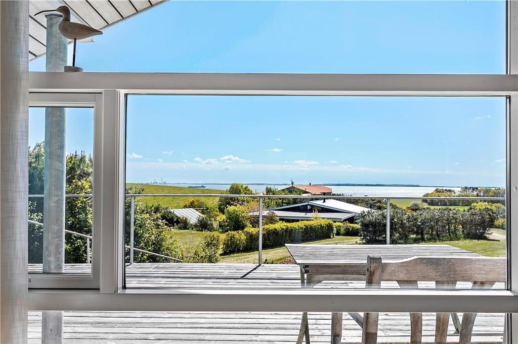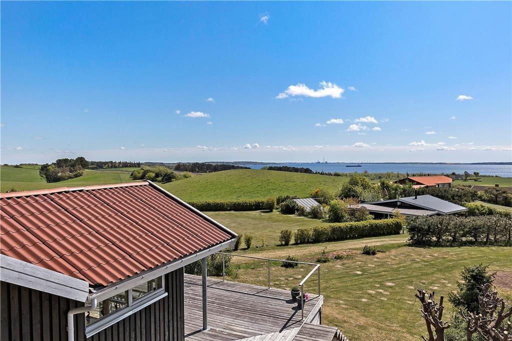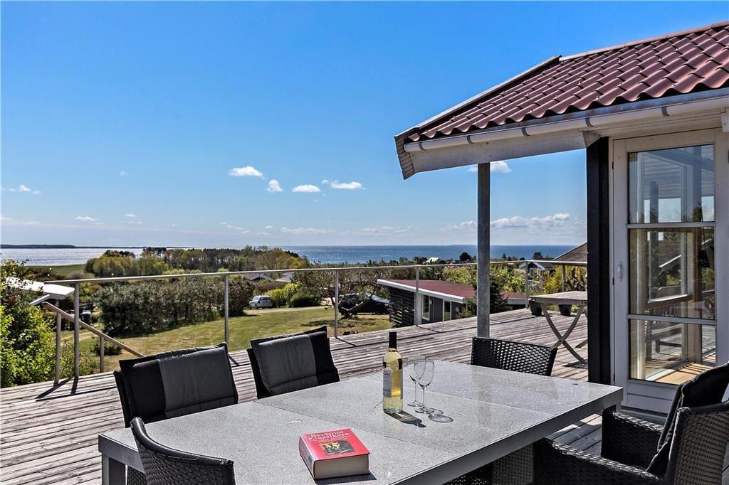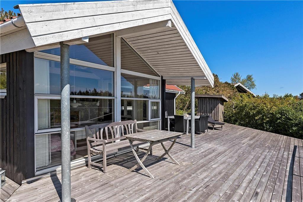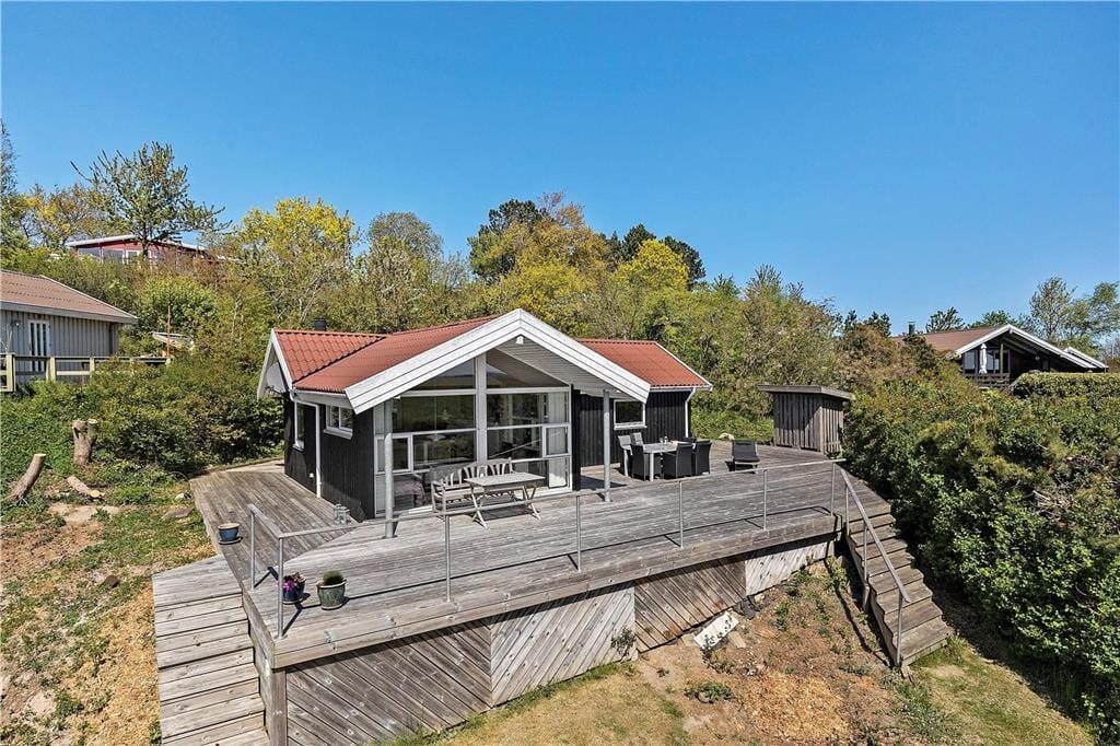 Huset er beliggende på en 1221 m2 stor grund med en stor træterrasse. Nyd solen og freden fra terrassen mens I falder i svime over udsigten Ved feriehuset er der havemøbler, liggestol og grill