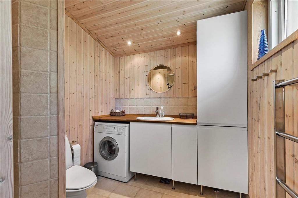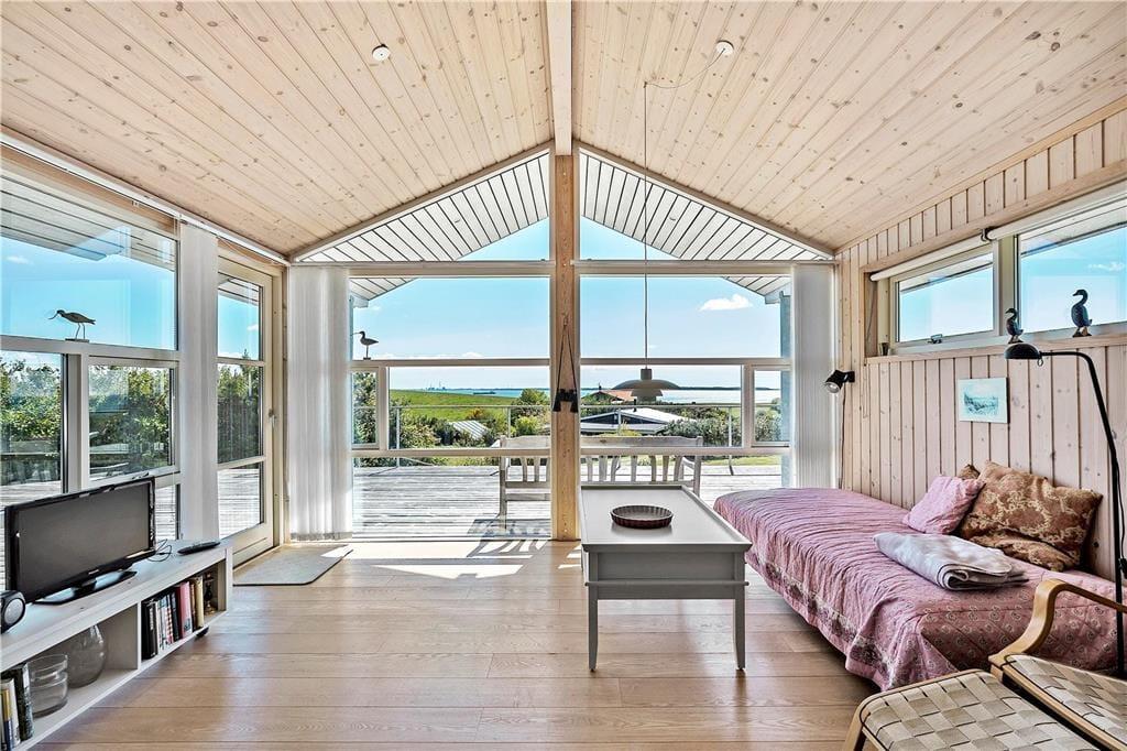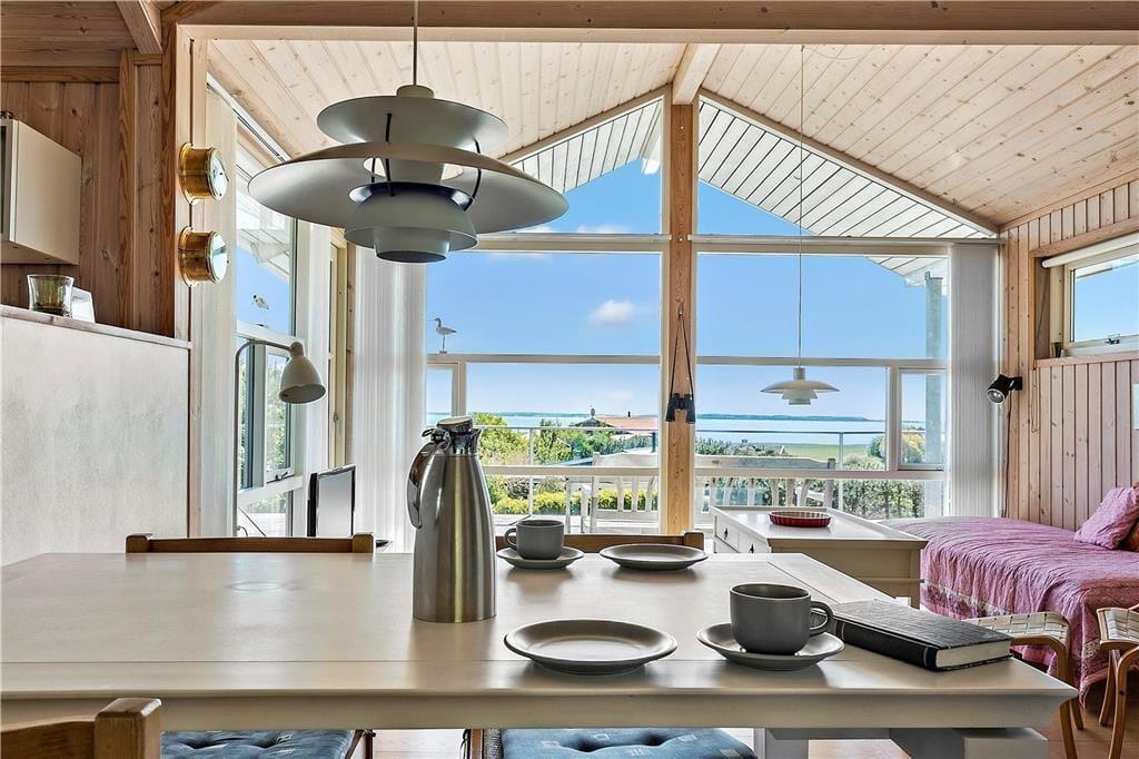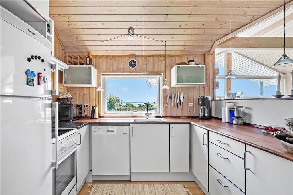 Feriehuset er indrettet med kombineret køkken og opholdsstue. Lyst og velindrettet køkken med keramisk komfur, opvaskemaskine, mikroovn og køleskab med fryser, Lys opholdsstue med store vinduespartier, hvorfra udsigten rigtig kan nydes, udgang til delvis overdækket terrasse, sofa, brændeovn, god spiseplads, TV (kan kun benyttes med Chromecast, og kræver eget abonnement til streamingtjenester) Badeværelse med flisegulv, bruseniche og vaskemaskine. To soveværelser, et med dobbeltseng (to enkeltsenge som er sat sammen), et med to enkeltsenge. Huset opvarmes med varmepumpe, brændeovn og elvarme