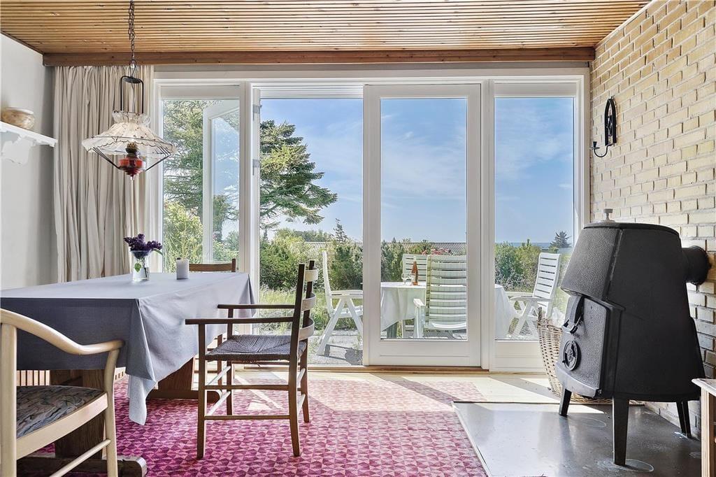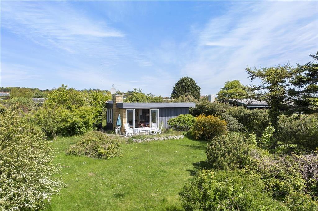 Huset har en 1200 m2 stor naturgrund og en 50 m2 fliseterrasse med havkig og god sol- og lækrog. Ved feriehuset er der havemøbler, liggestole og parasol.