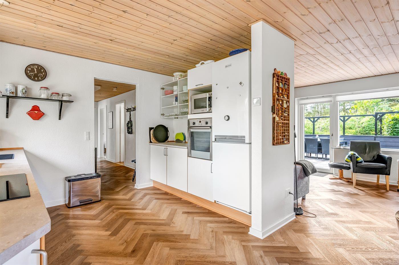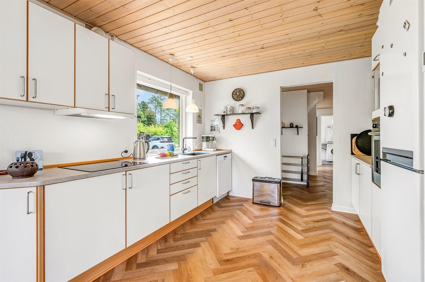 Køkkenet er udstyret med 1 køleskab. Der er 4 keramiske kogeplader, varmluftovn, mikrobølgeovn samt opvaskemaskine.