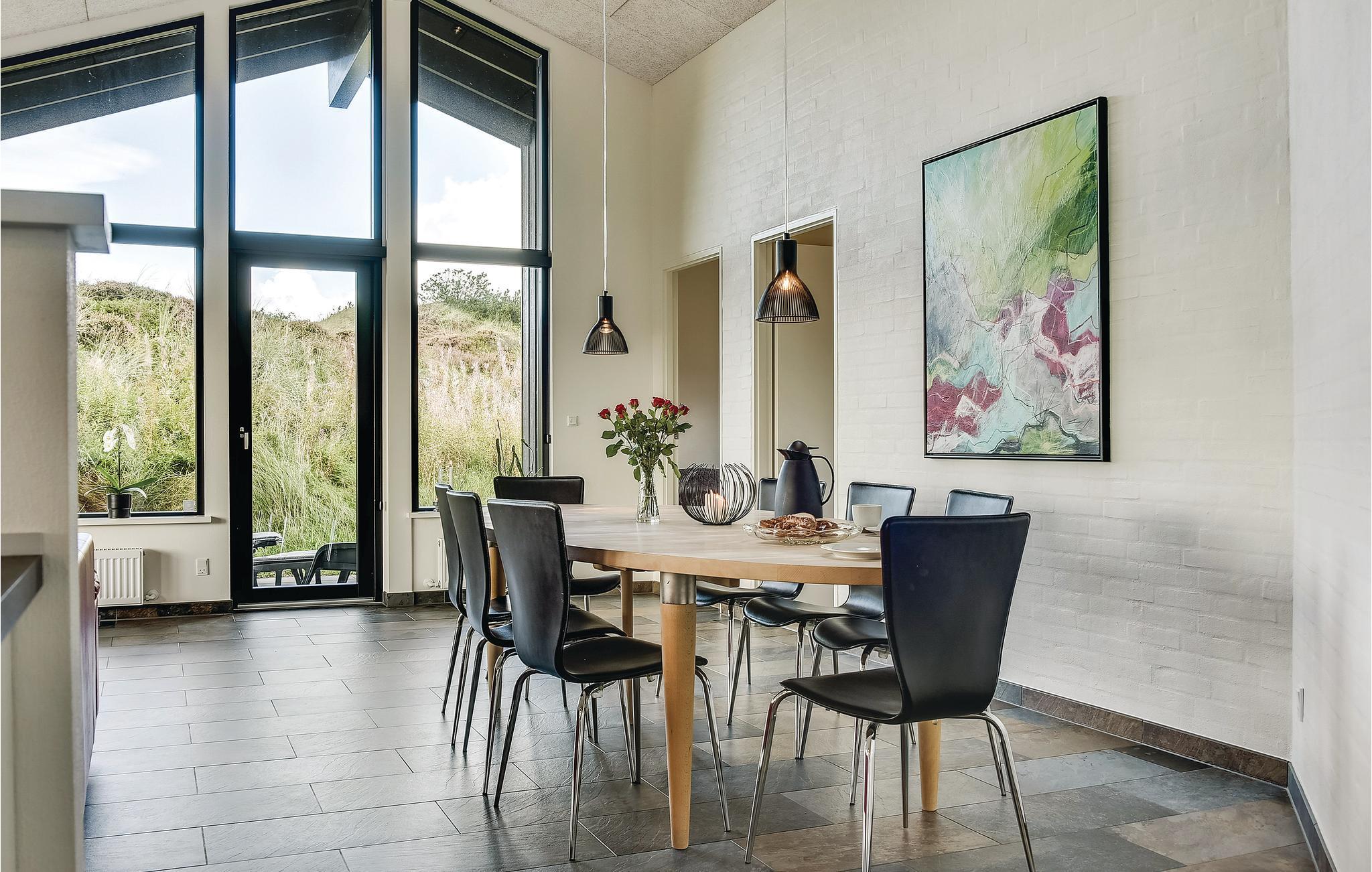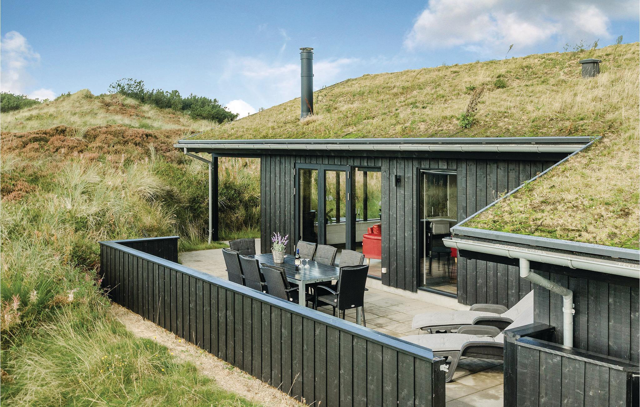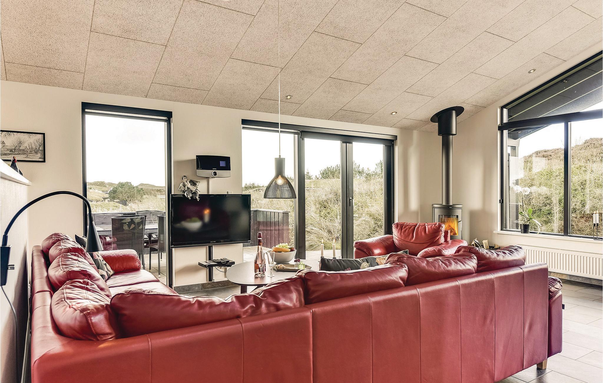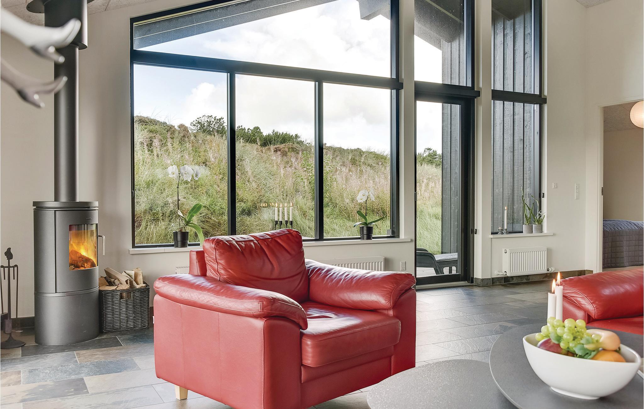 Super flot og meget indbydende kvalitets sommerhus med alt hvad der kræves for et god og minderig ferie. Sommerhuset ligger på skøn, helt ugeneret og klitgrund med læ i gå-cykelafstand af Henne Mølle Å, Henne Golfklub, Henne Strand by samt vestkystens bedste og hvideste badestrand. Fra huset er der panoramaudsigt over det flotte område. Huset indeholder stort og yderst veludstyret køkken i åben forbindelse med stuen der er dejligt indrettet med bl.a. brændeovn og tv. Herfra går I ud på de delvist overdækkede terrasser, hvor I kan slappe af i de bekvemme solsenge og gode havemøbler. I huset er der også tre gode soveværelser med dobbeltsenge og TV. I sommerhuset er der klinkegulve med gulvarme i en del af huset, der kommer fra et yderst energivenligt jordvarmeanlæg, samt trægulve i soverummene. Der er to flotte badeværelser også med gulvvarme og fra det store badeværelser med spa, er der direkte indgang til skøn sauna. Flere gode og ugenerte terrasser omkring huset og hvor der altid kan findes læ og et legehjørne med stor sandkasse.