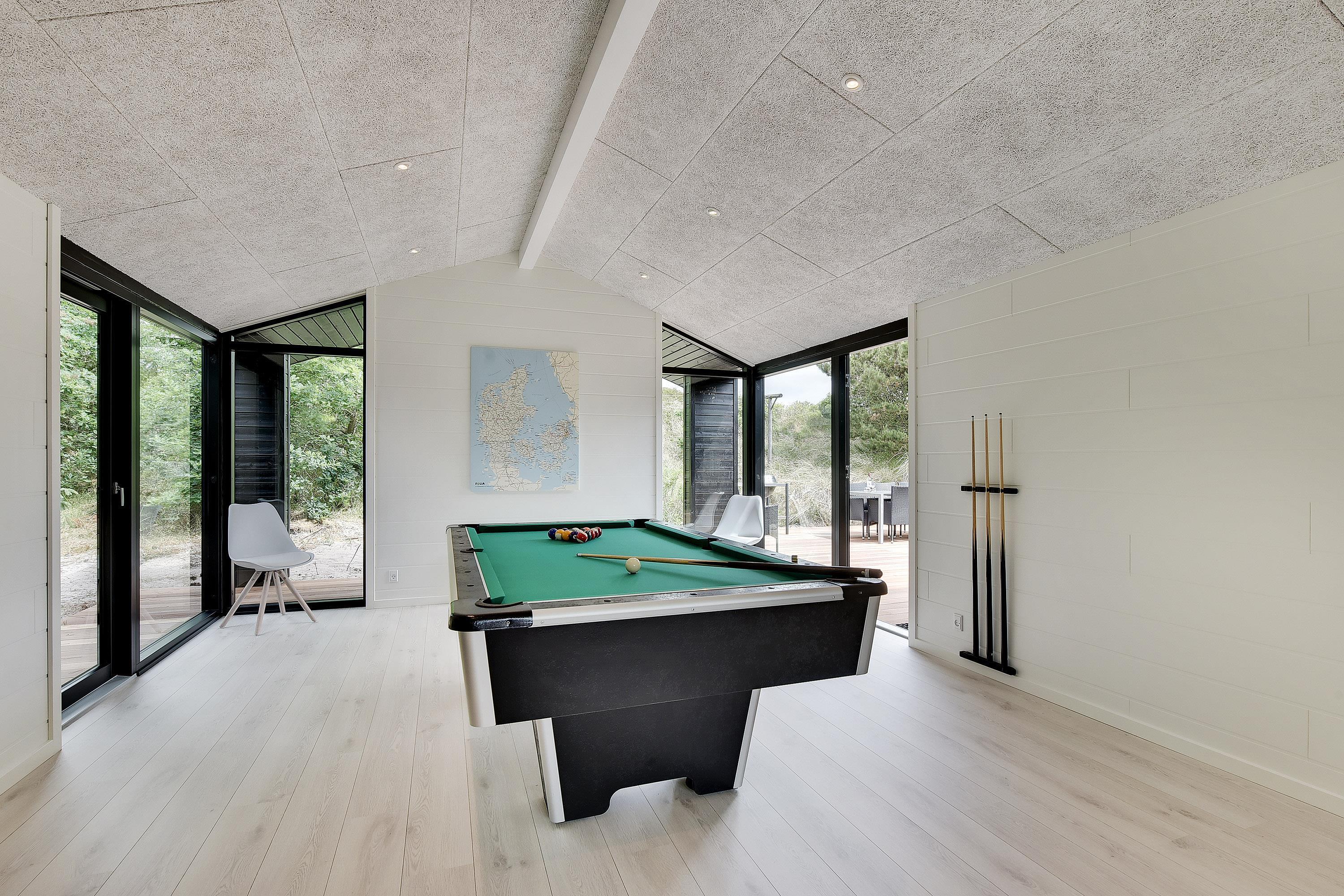 Fra såvel åben som overdækket terrasse, kan fred og ro nydes. Fremhæves kan først og fremmest aktivitetsrum med bl.a. bordtennis og pool bord. Desuden 2 lækre badeværelser med bruser samt gulvvarme, hvoraf det ene er med spa og sauna. Huset råder over 4 velindrettede og dejlige soverum. Entre med masse af bord og skabsplads. Flot køkken i åben forbindelse til stue. Køkken og stue er udstyret med næsten alt moderne isenkram eks. opvaskemaskine, køle-fryseskab, ovn ect. , stuen er med brændeovn. Et super aktivitetshus, hvor rammerne er skabt for en god ferie ved Henne Strand.