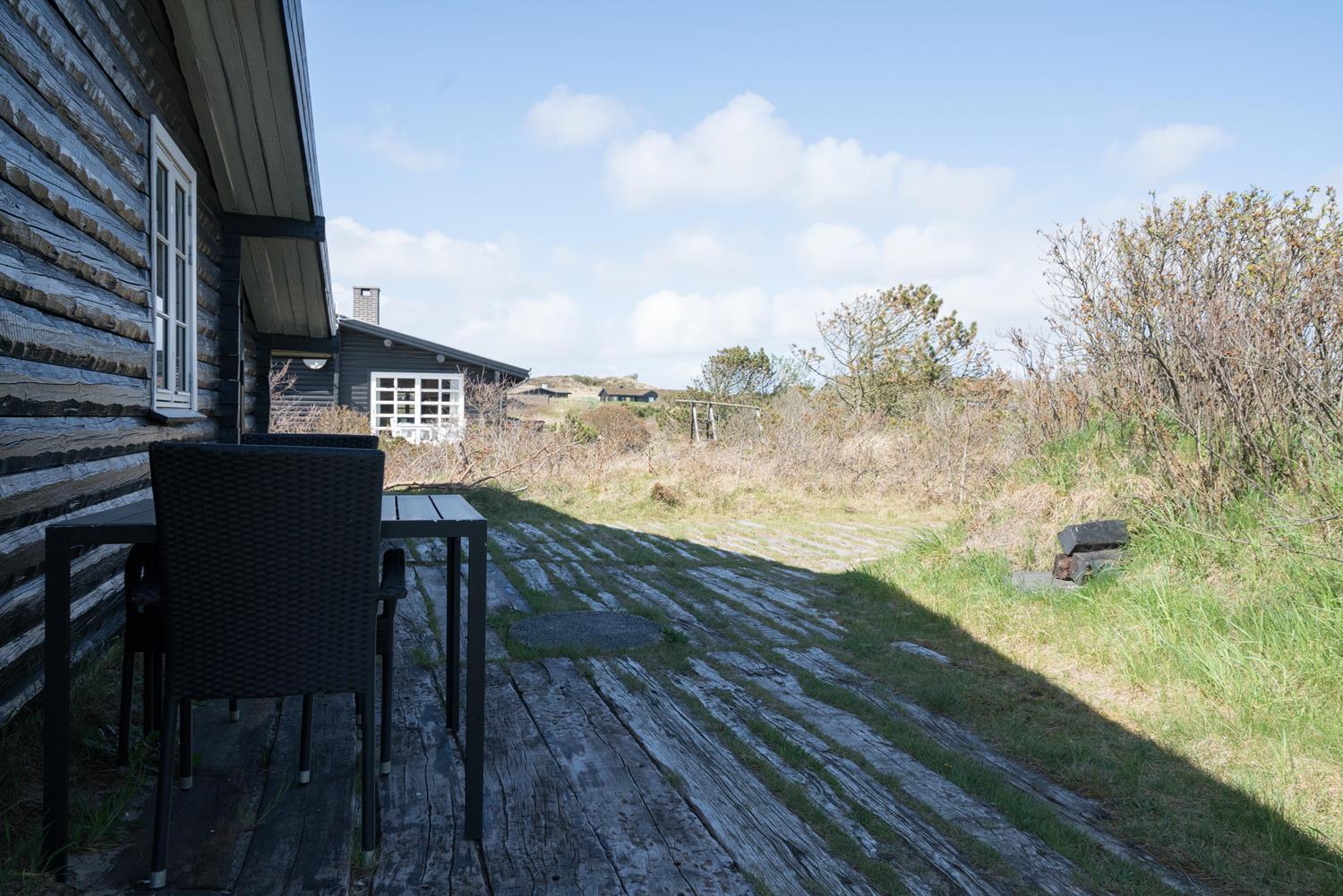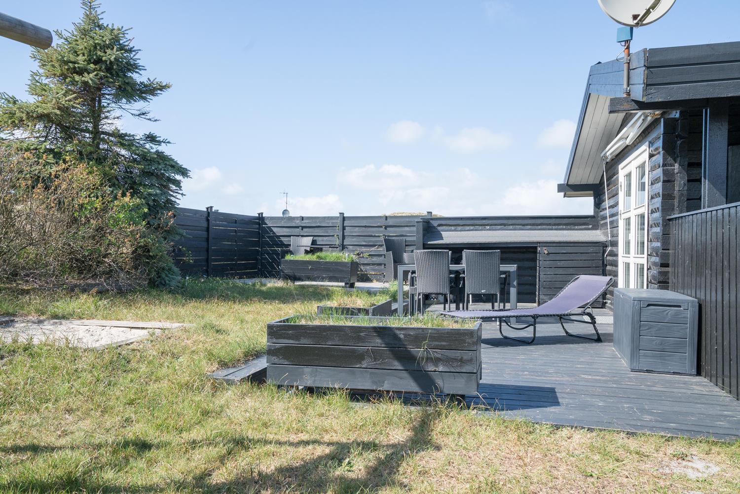Udenfor venter en dejlig naturgrund med fri udsigt over klitterne. På den afskærmede terrasse kan du nyde morgenkaffen, solbade eller afslutte dagen til lyden af Vesterhavets brusen.