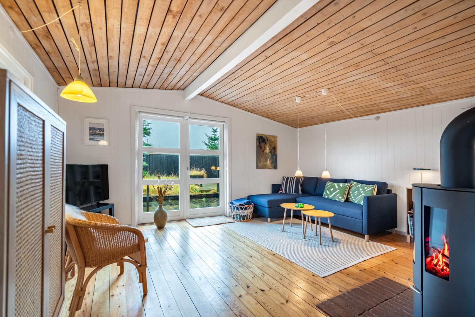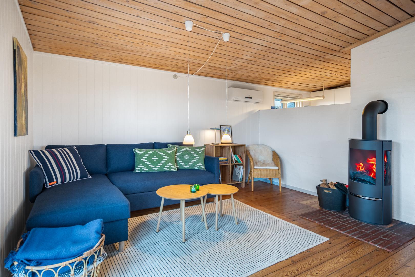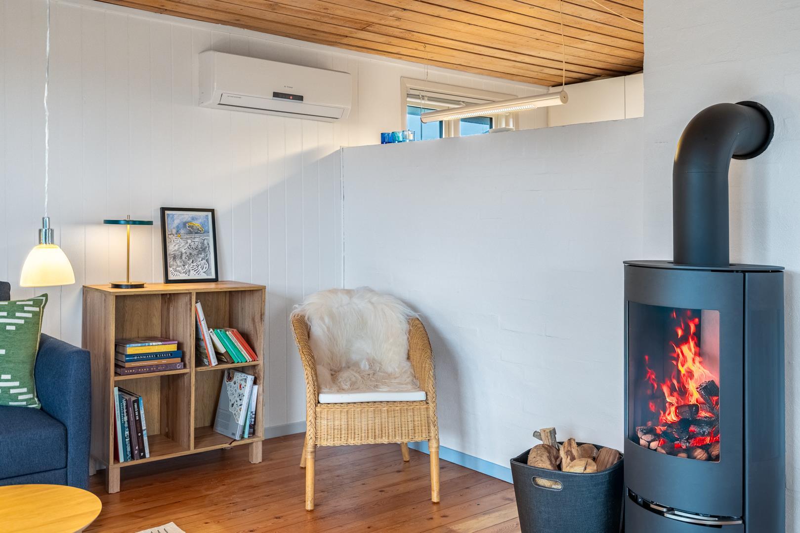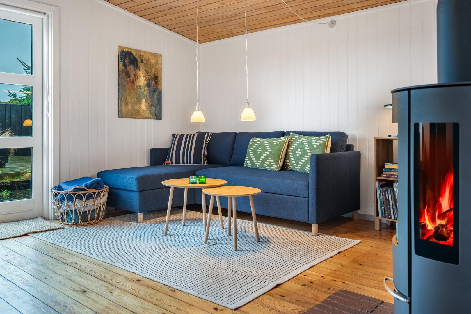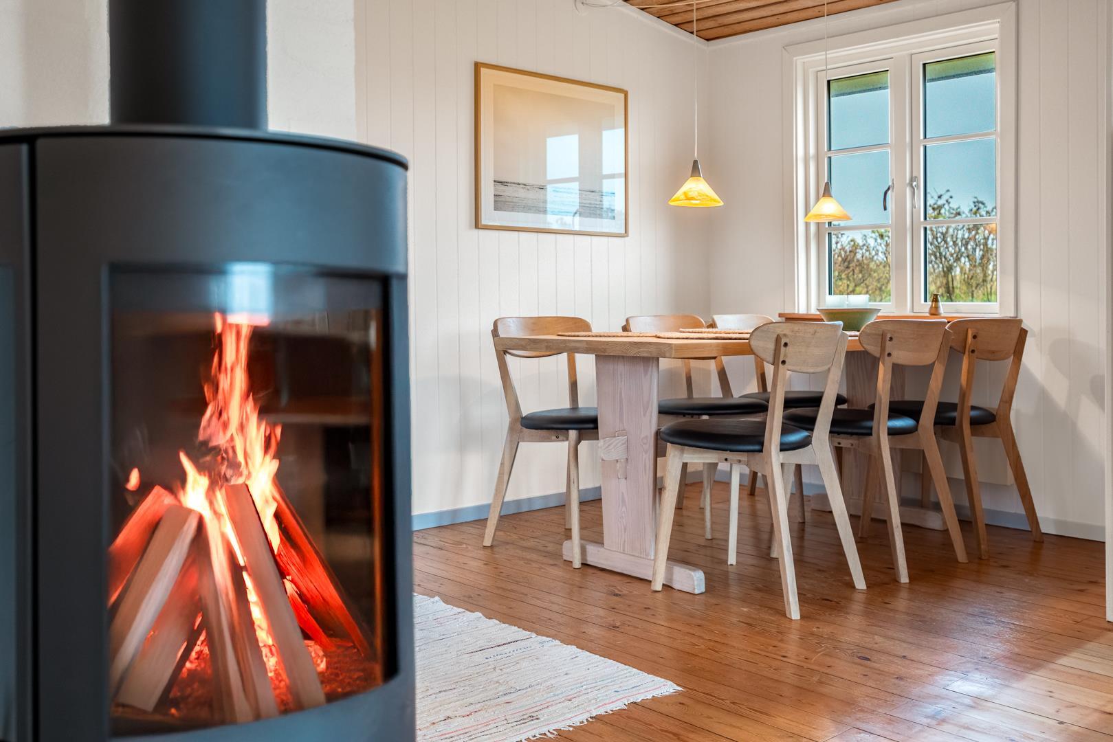 Stuen er husets hjerte – store vinduer lukker lyset ind og giver en dejlig udsigt over klitlandskabet. Her kan du nyde varmen fra brændeovnen på kølige dage, mens varmepumpen sørger for et behageligt indeklima året rundt.