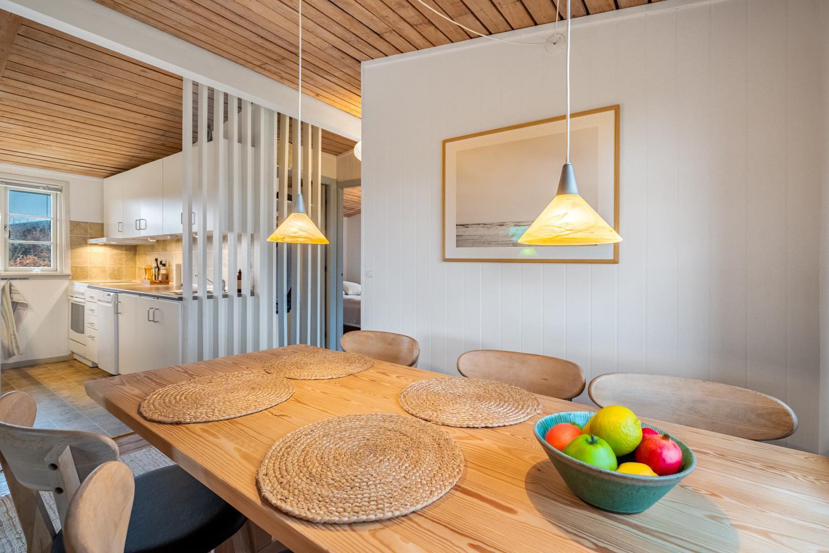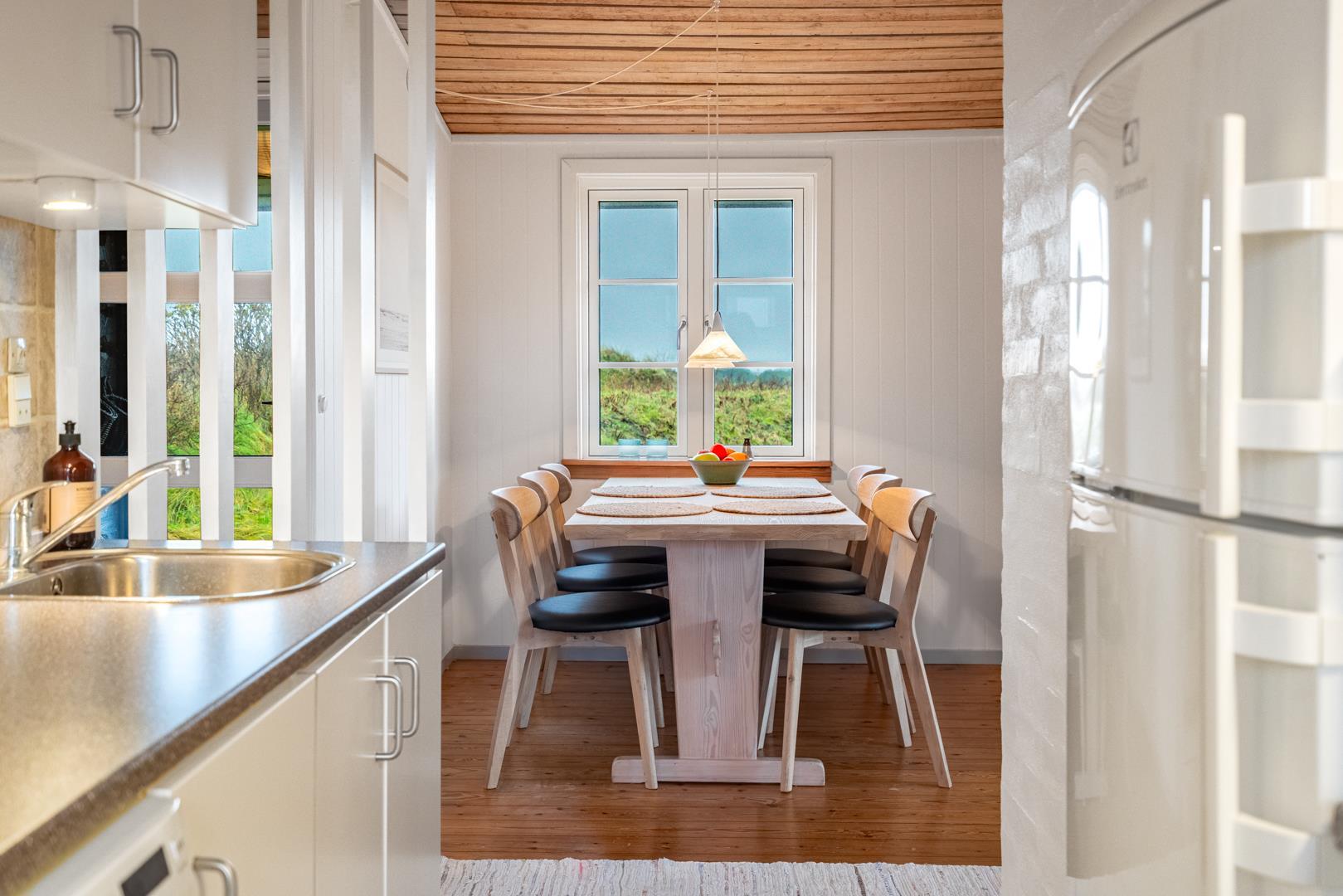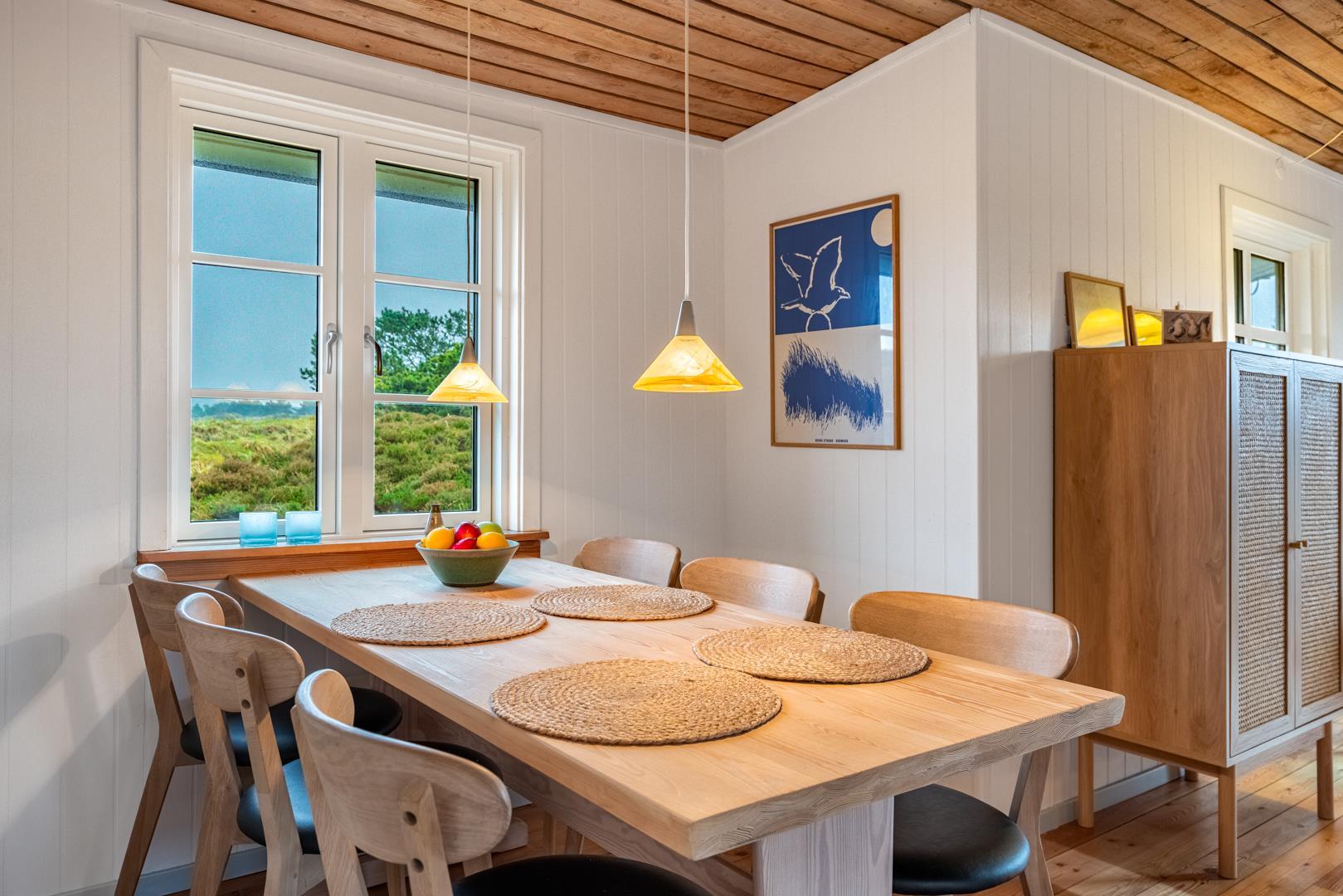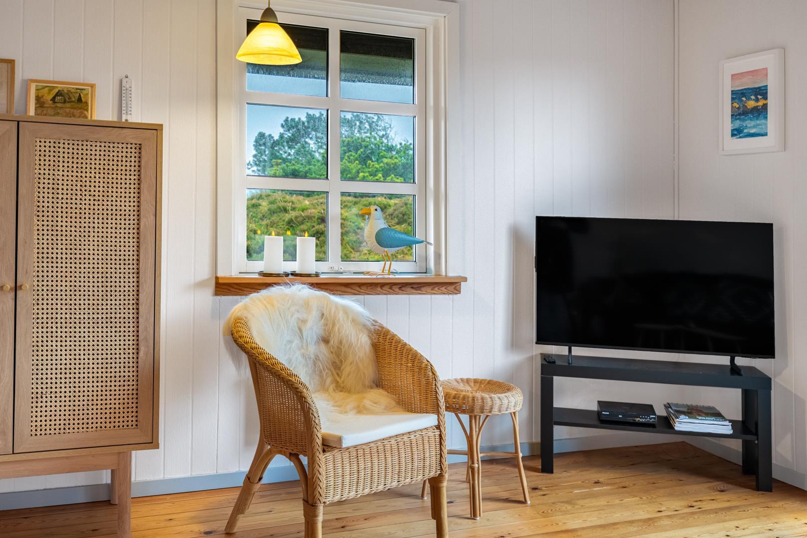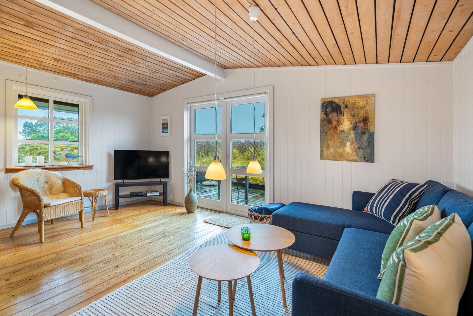 Stuen er husets hjerte – store vinduer lukker lyset ind og giver en dejlig udsigt over klitlandskabet. Her kan du nyde varmen fra brændeovnen på kølige dage, mens varmepumpen sørger for et behageligt indeklima året rundt.
