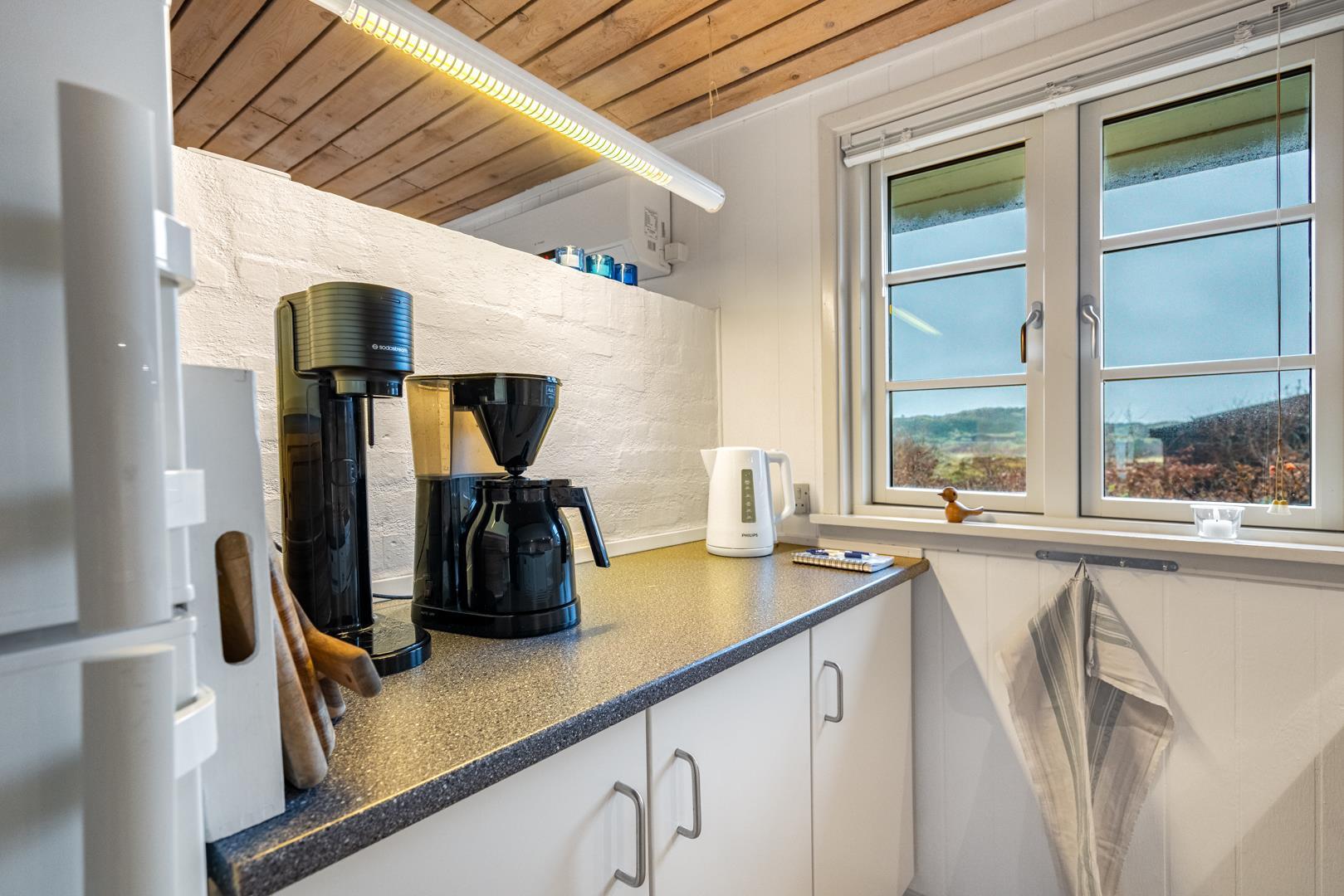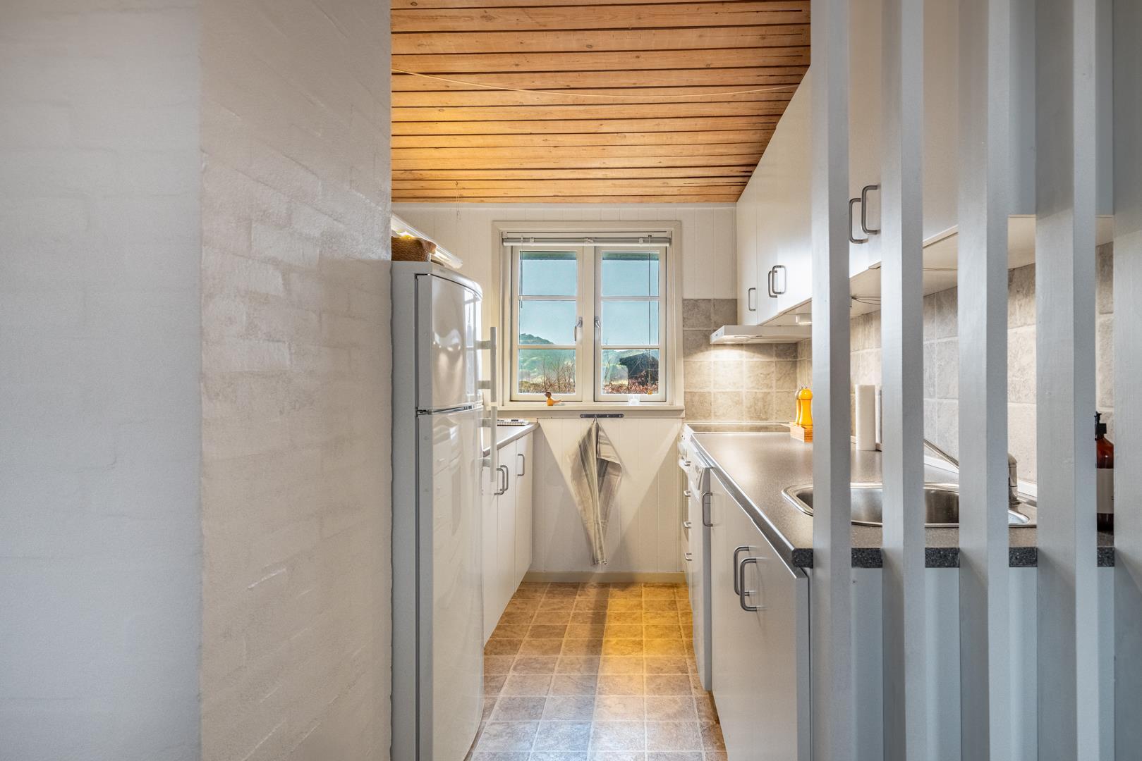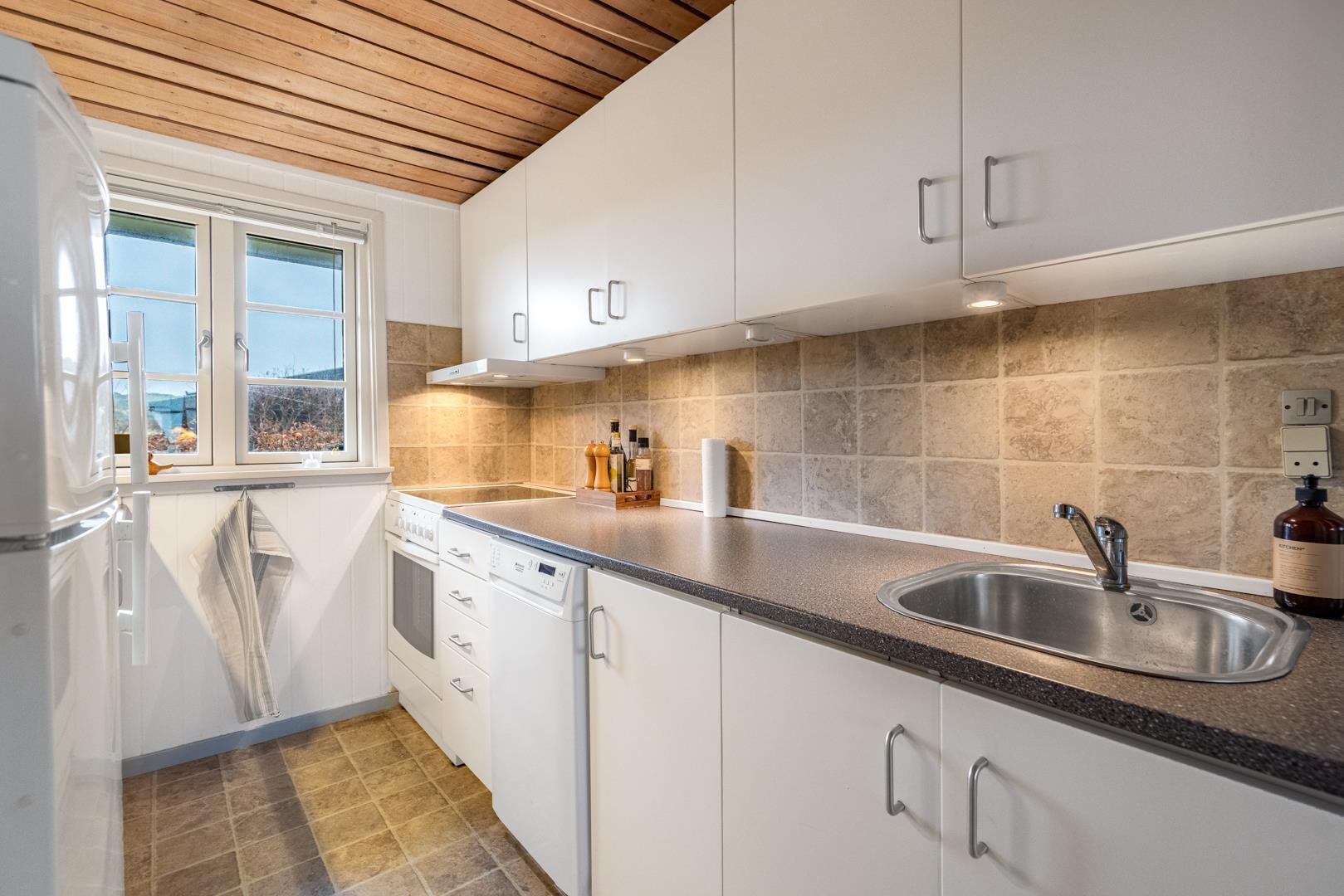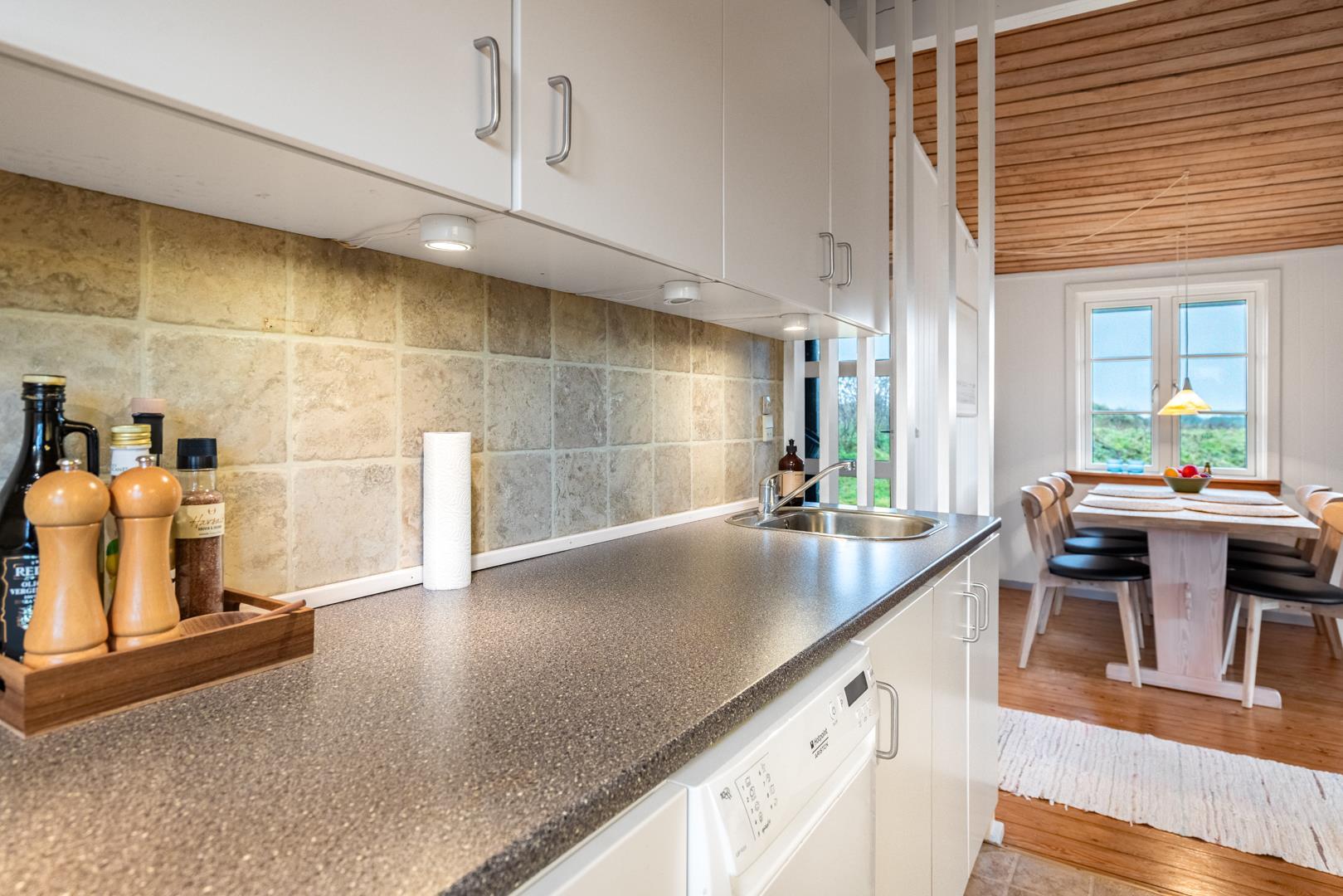 Det åbne køkken er praktisk og veludstyret – perfekt til hyggelige måltider med familien.