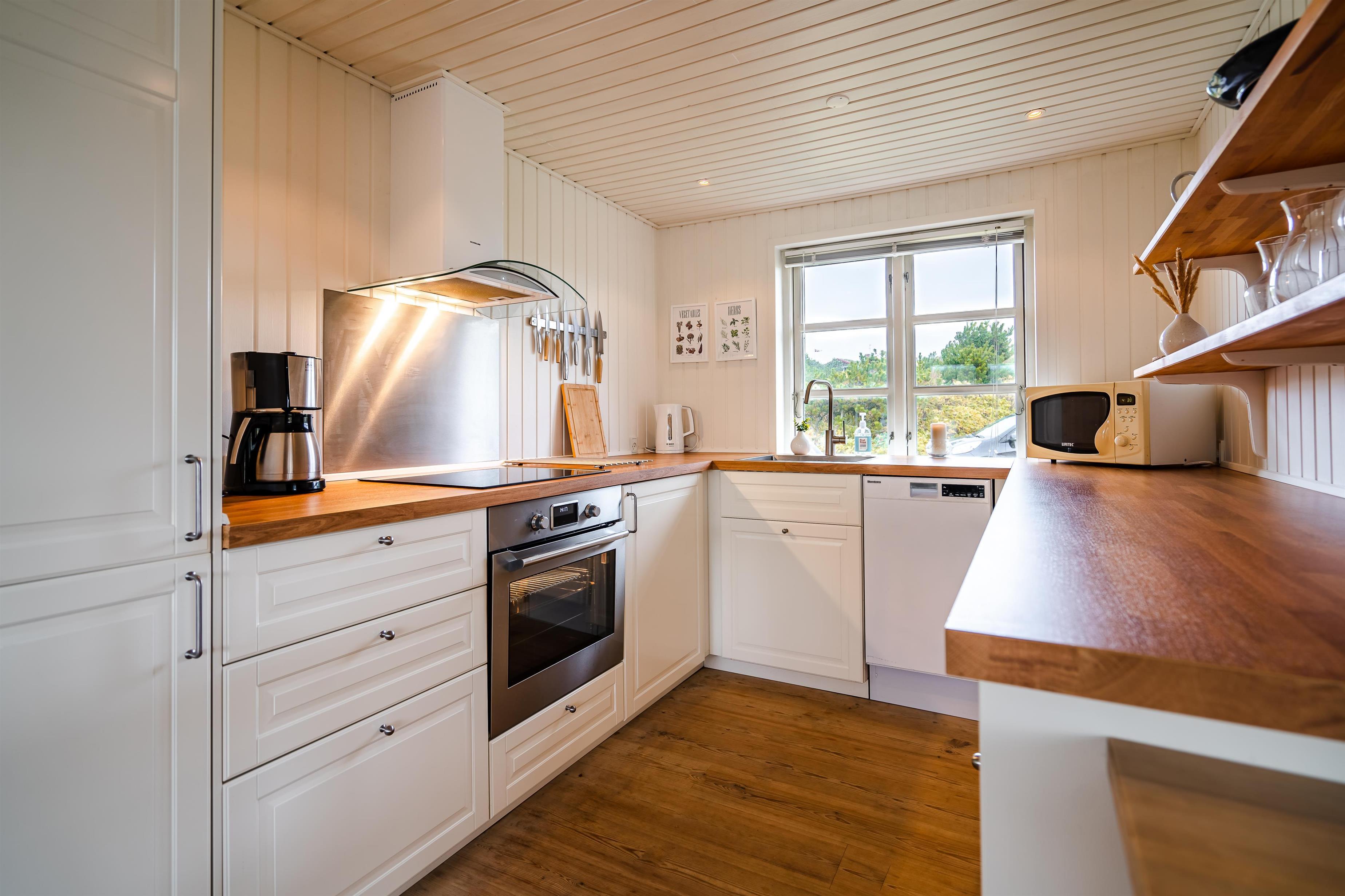 Dejligt, lyst og venligt indrettet feriehus beliggende på en pragtfuld kuperet naturgrund i rolige omgivelser. Huset er hyggeligt indrettet og med trægulve i stue og køkken. Der er i 2021 lavet nyt køkken.Fra stuen er der udgang til skøn terrasse, der er delvis overdækket. Der er 2 dejlige badeværelse med bruser og i det ene er der 2 pers. spa og sauna. IKKE RYGERHUS.