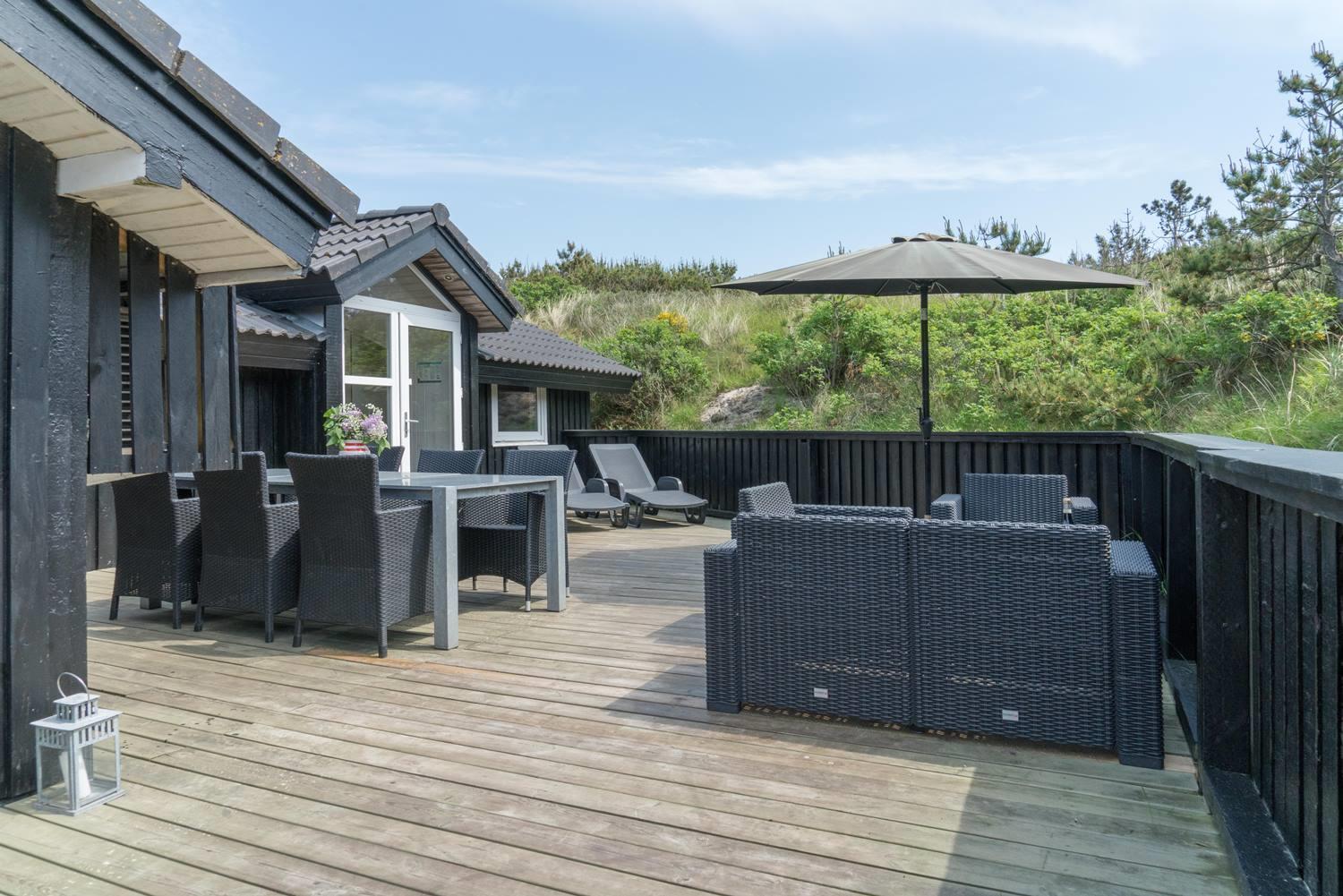 På en pragtfuld højtbeliggende klitgrund tæt ved vandet og for enden af stikvej ligger dette dejlige feriehus. Stor entre hvor man finder husets vaskemaskine og tørretumbler. Huset råder over 2 flotte badeværelse med bruser, i det ene kan en tur i spaen eller saunaen nydes. Husets køkken ligger i åben forbindelse med den rummelige stue, hvor fra der er udgang til ugeneret og indhegnet træ terrasse. Et virkeligt dejligt feriehus til den plads krævende familie. Tag bare din egen PC med da huset råder over gratis internetforbindelse.