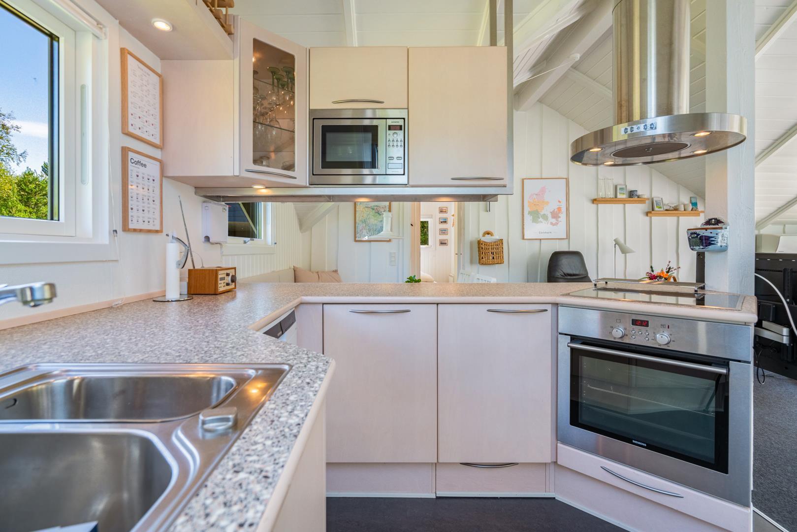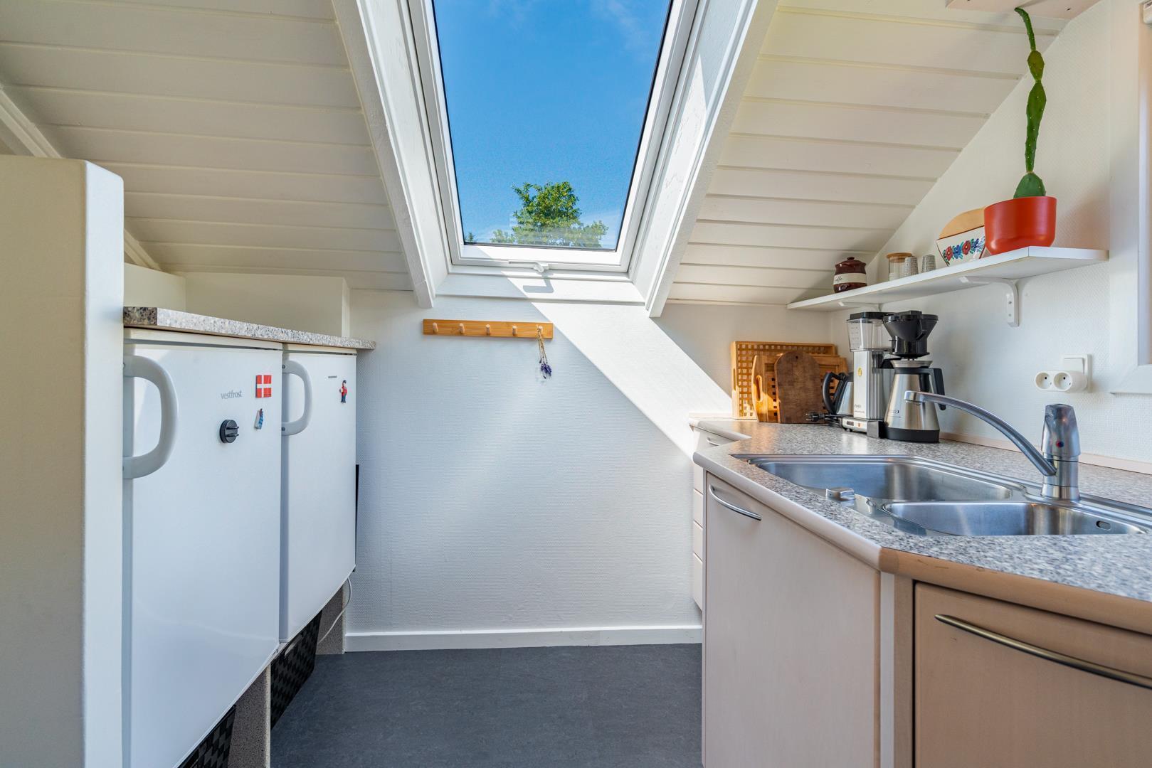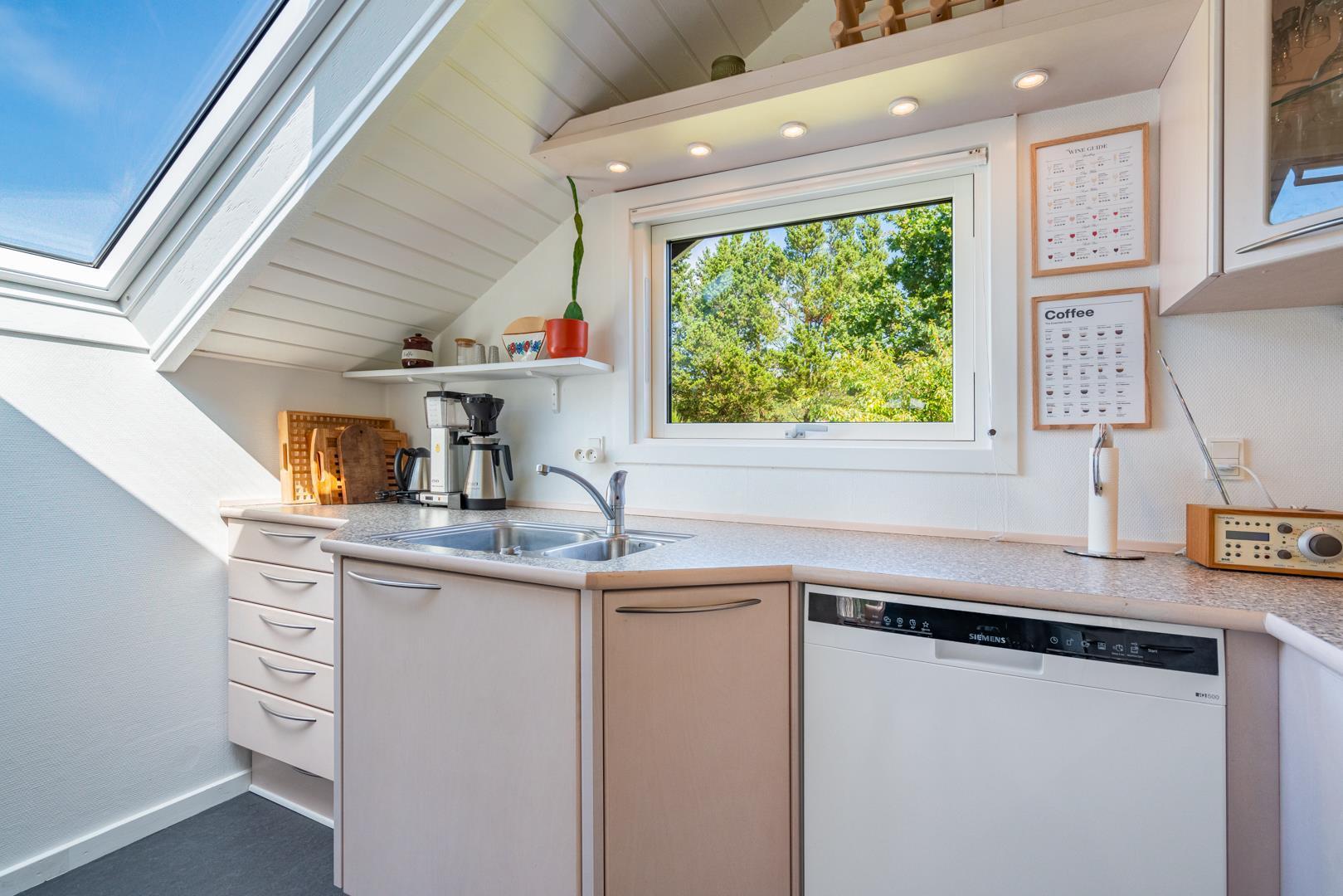 I åben forbindelse med den hyggelig indrettede stue, er der veludstyret køkken. Dejligt badeværelse med gulvvarme og god skabsplads.