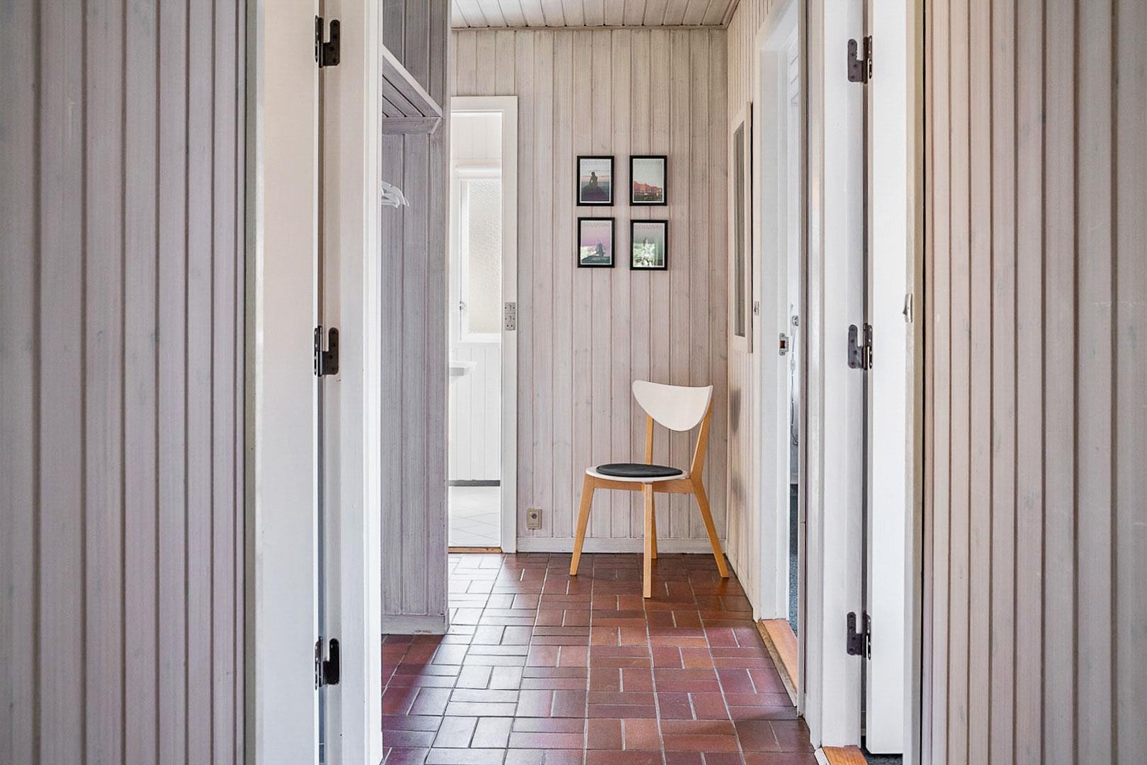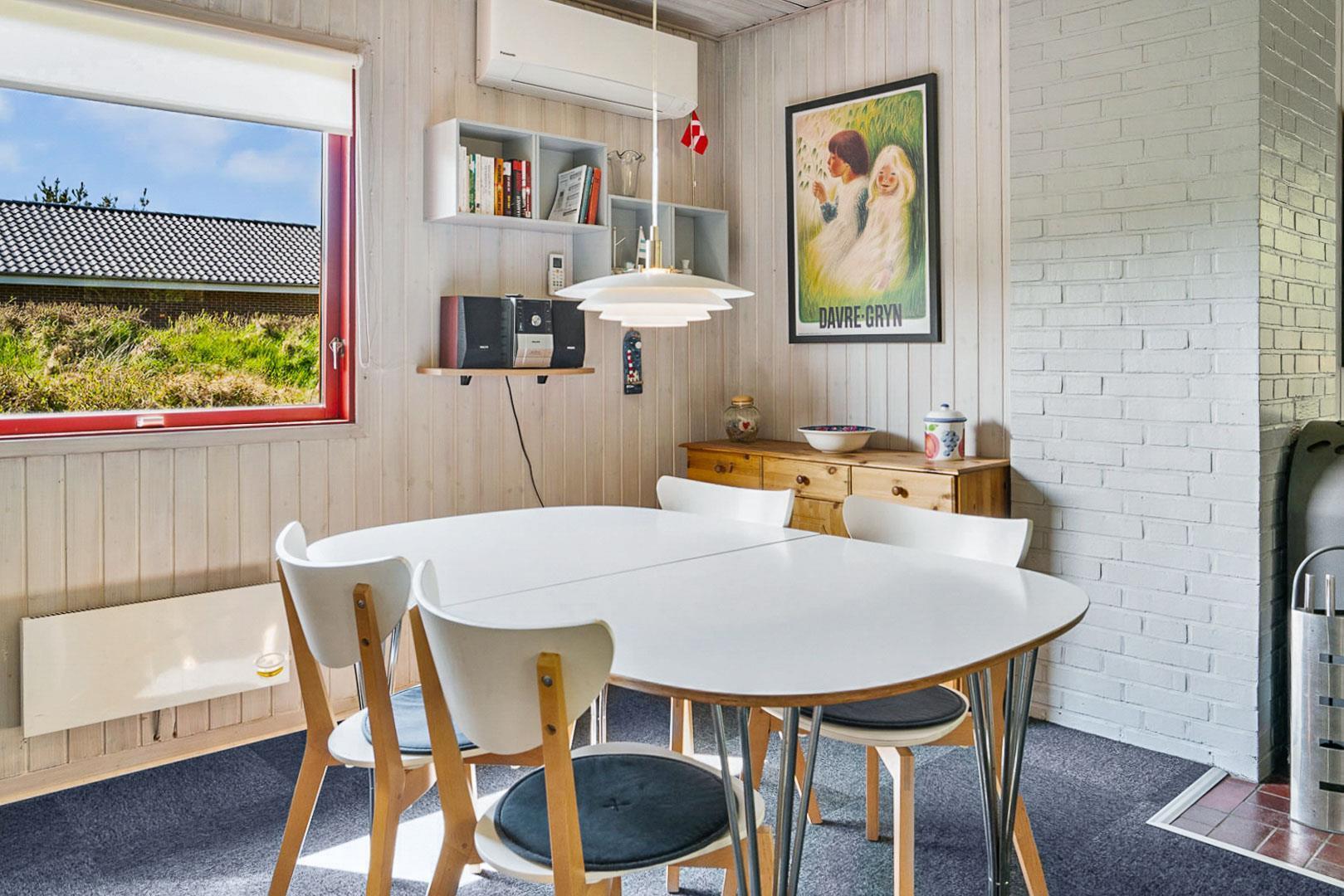 Velholdt feriehus beliggende på en dejlig ugeneret naturgrund for enden af en blind vej. Feriehuset er løbende blevet moderniseret med nye møbler, tæpper og malet i lyser farver. Nyere lyst køkken. Hyggelig stue med brændeovn og varmepumpe. Der er direkte udgang til syd-vest vendt delvis overdækket og ugeneret terrasse. Et meget velpasset og smagfuld indrettet feriehus.