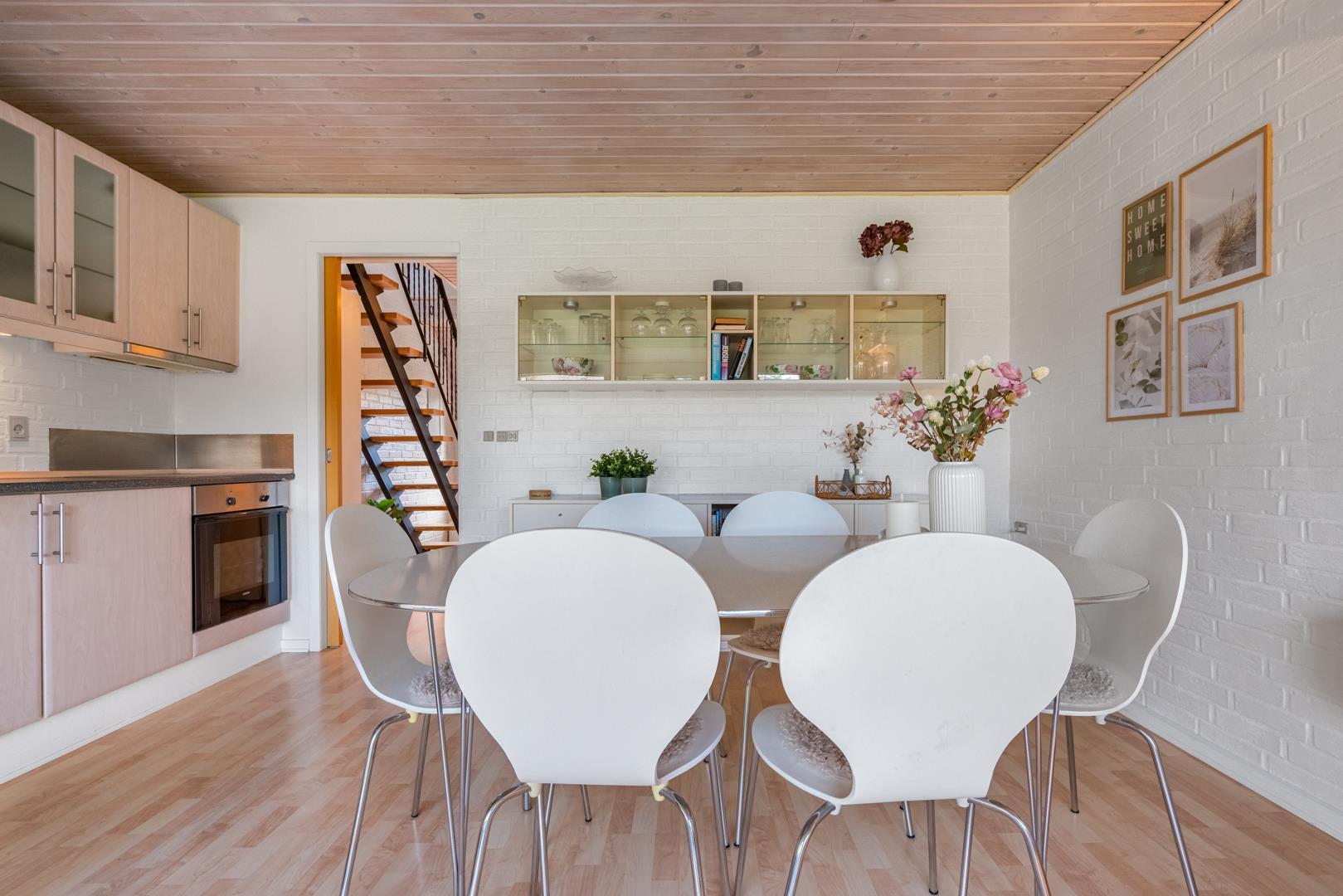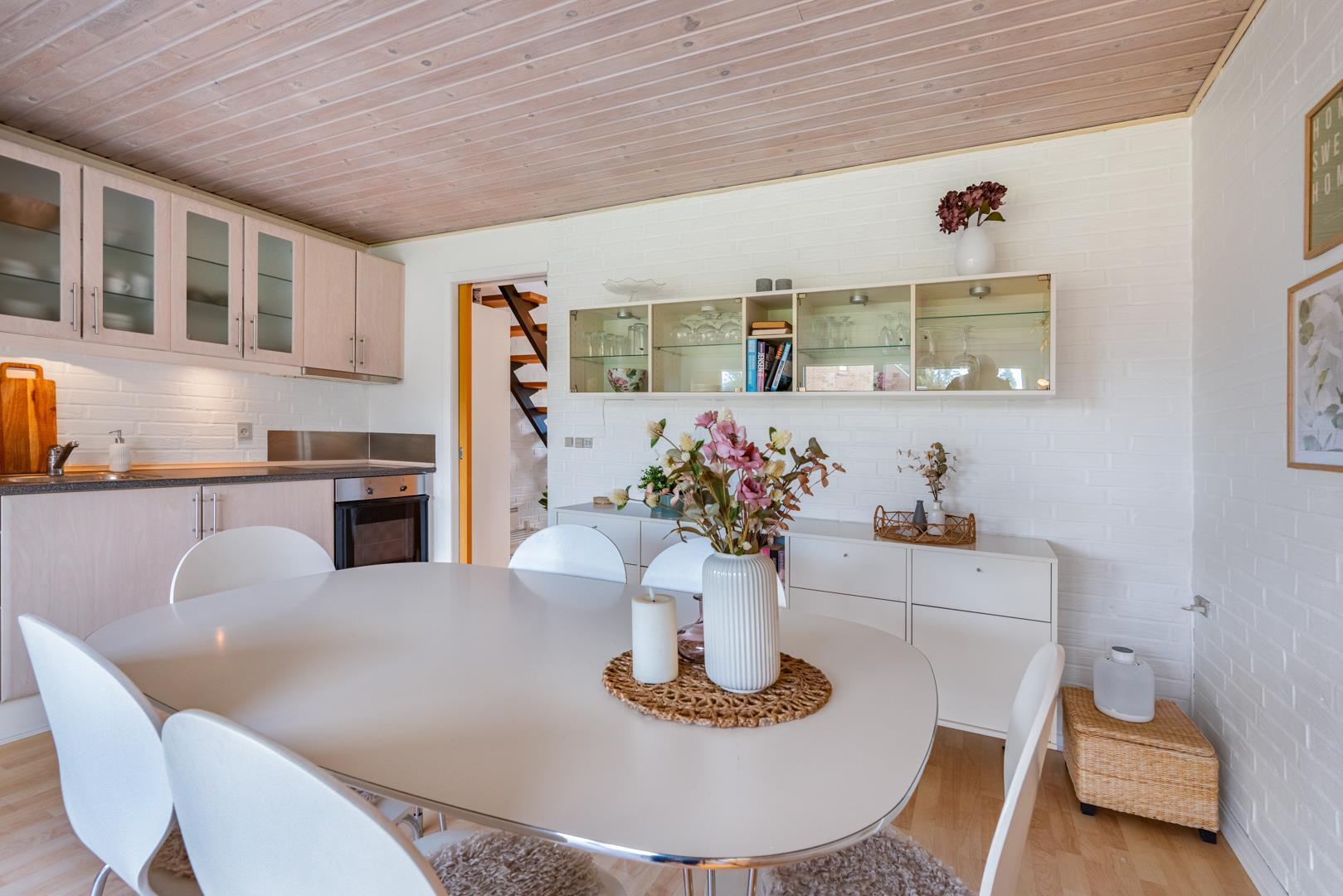 Det åbne køkken-alrum er lejlighedens samlingspunkt. Her kan du slappe af i sofaen, læse en bog eller streame dine yndlingsserier. De store vinduer lukker masser af dagslys ind og skaber en varm og venlig stemning.
