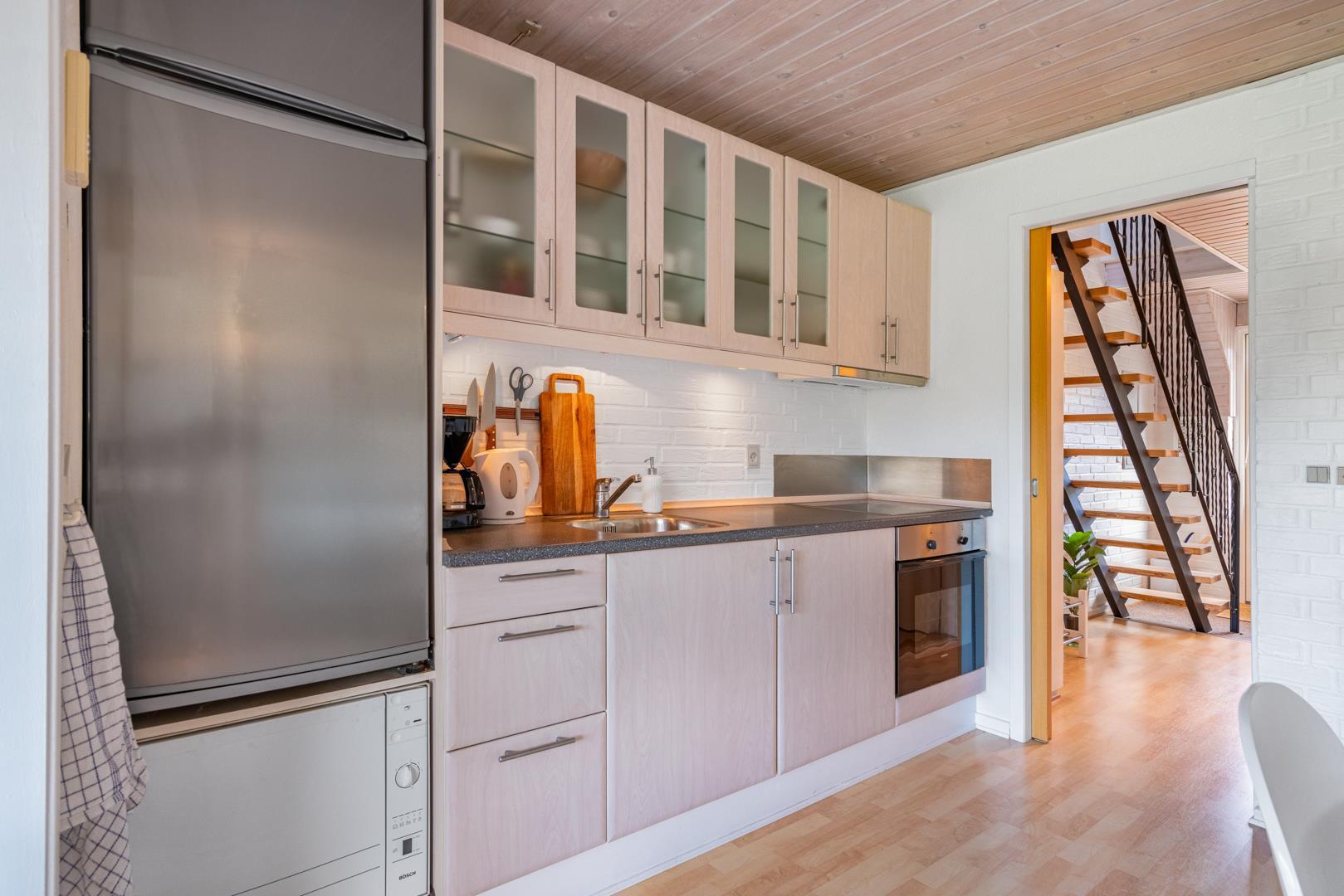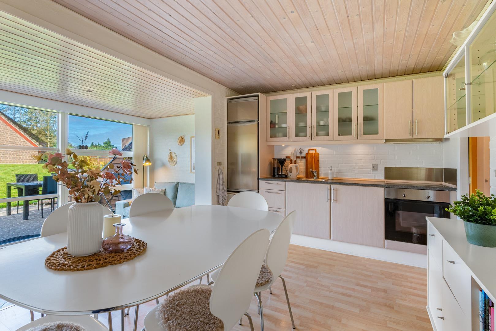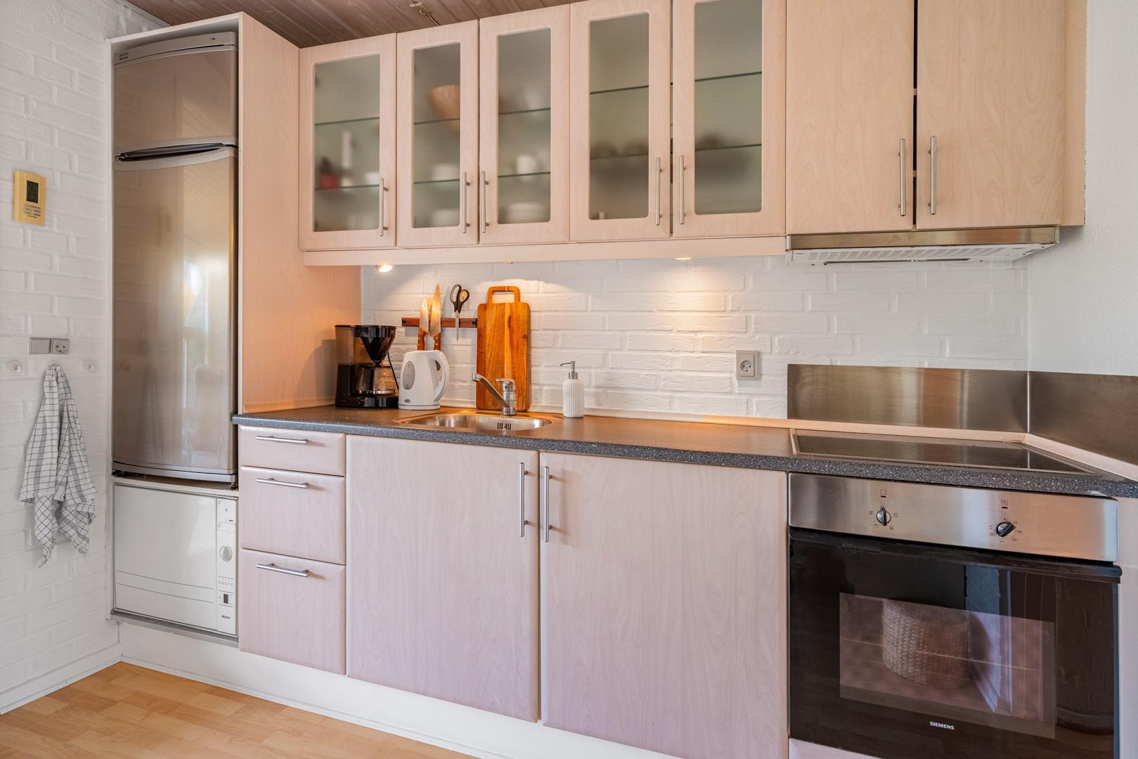 Køkkenet er moderne og veludstyret – med opvaskemaskine, ovn, keramisk kogeplade og alt, hvad du behøver til madlavningen. Uanset om det gælder morgenkaffen eller aftensmaden, bliver madlavningen en hyggelig del af ferien.