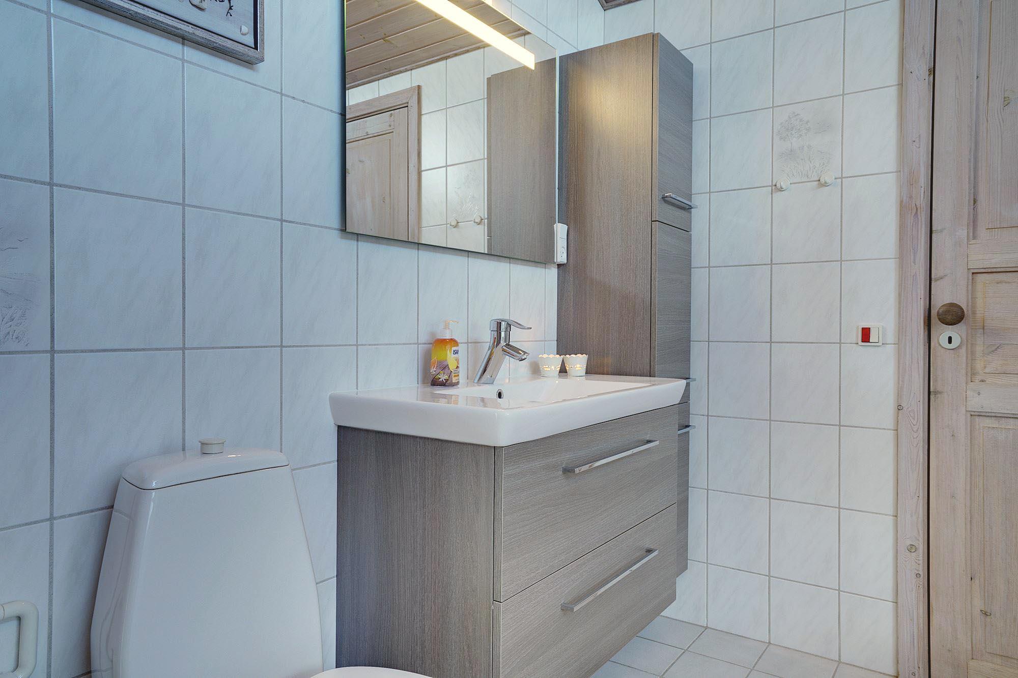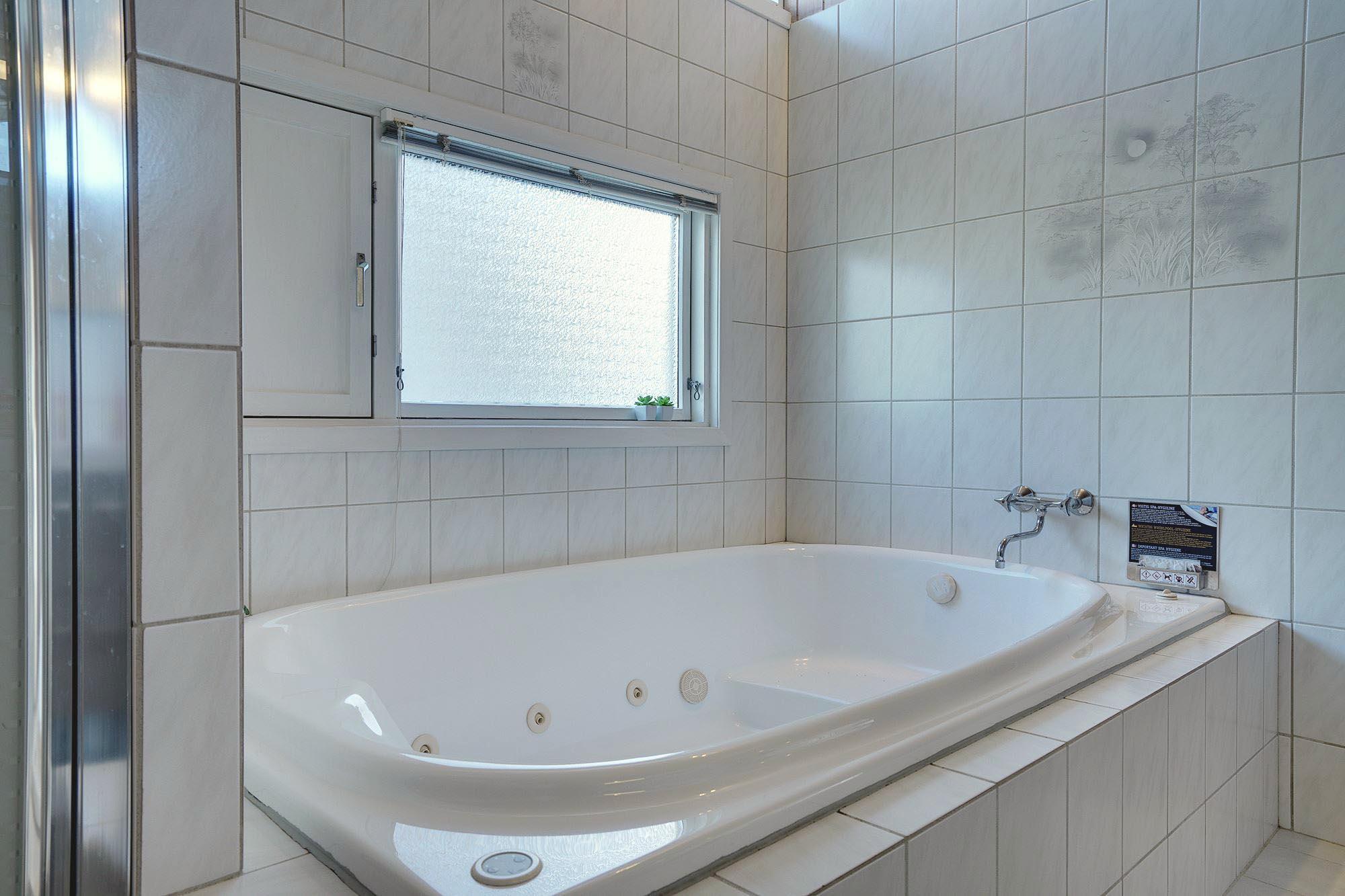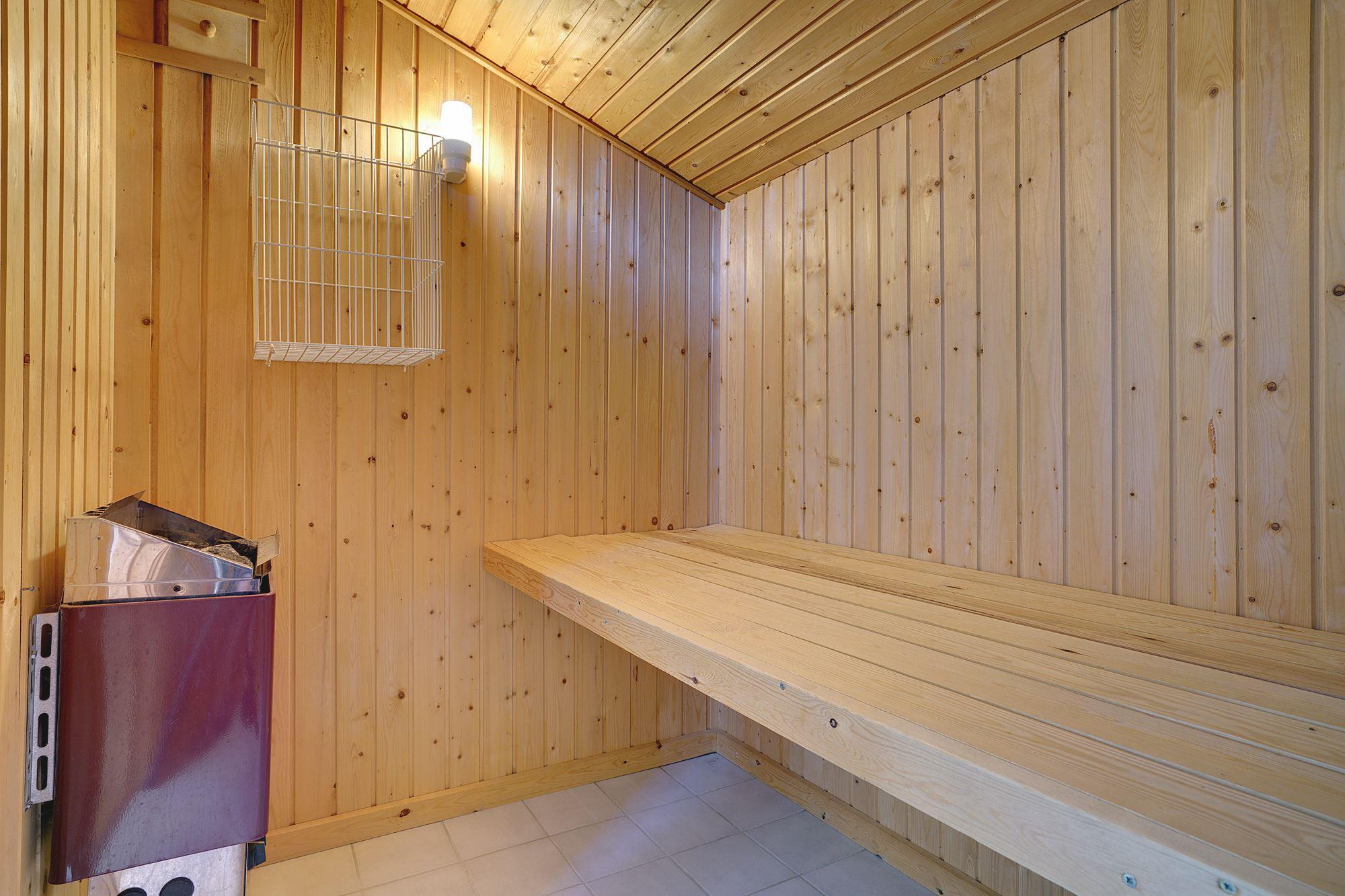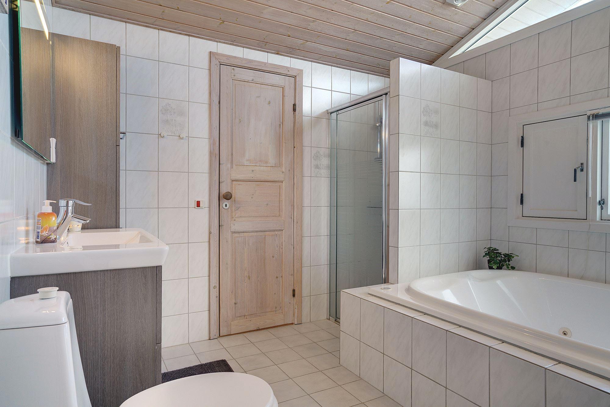 Badeværelset er stort og indbydende med både spa og sauna – perfekte faciliteter til afslapning efter en dag ved stranden eller i klitterne.