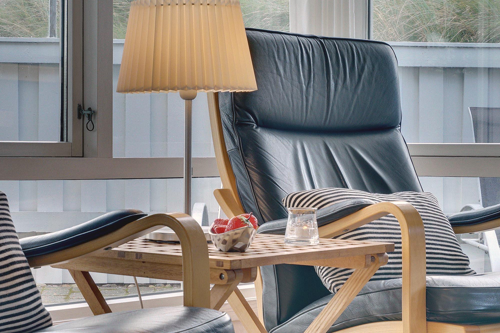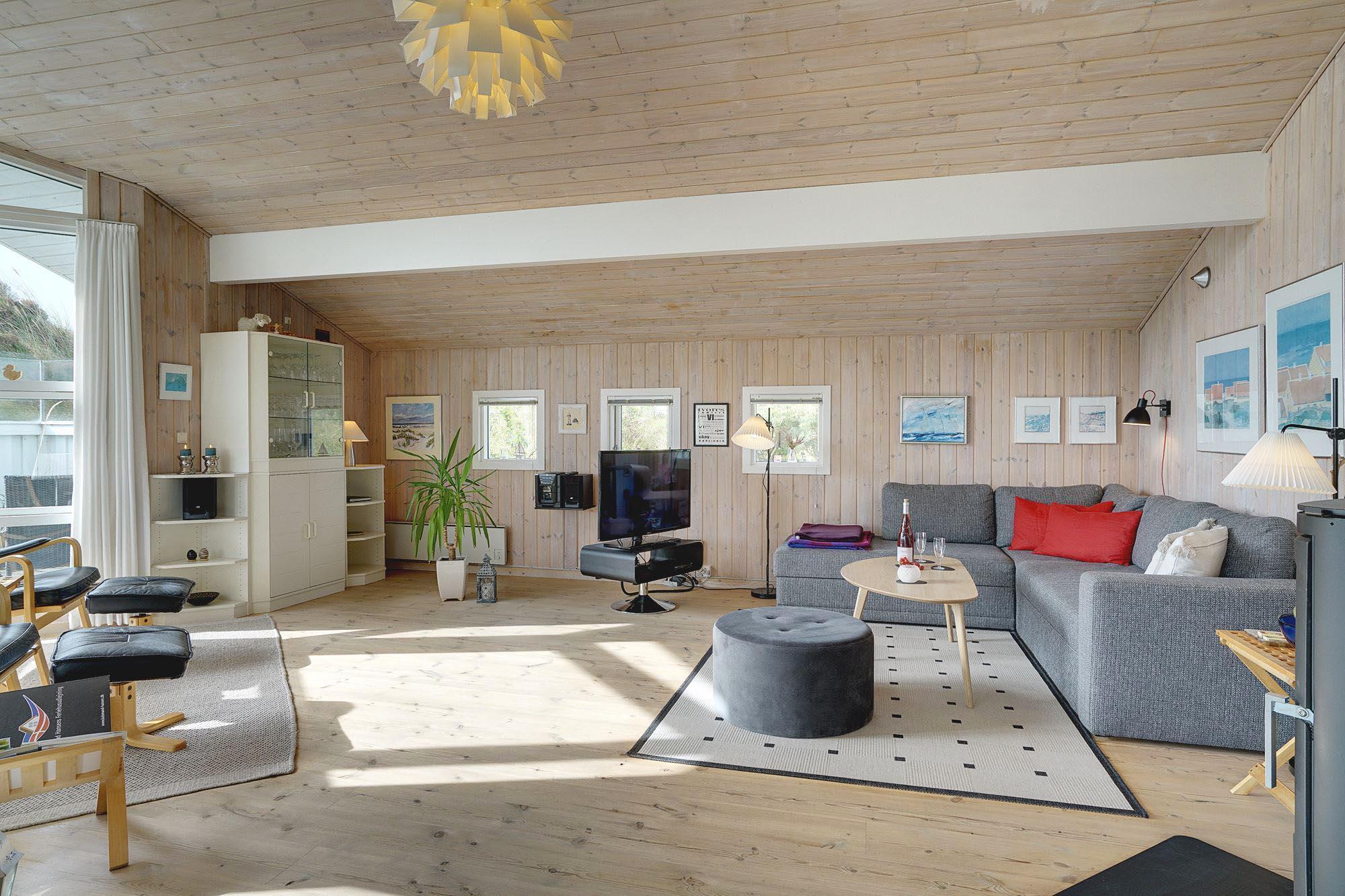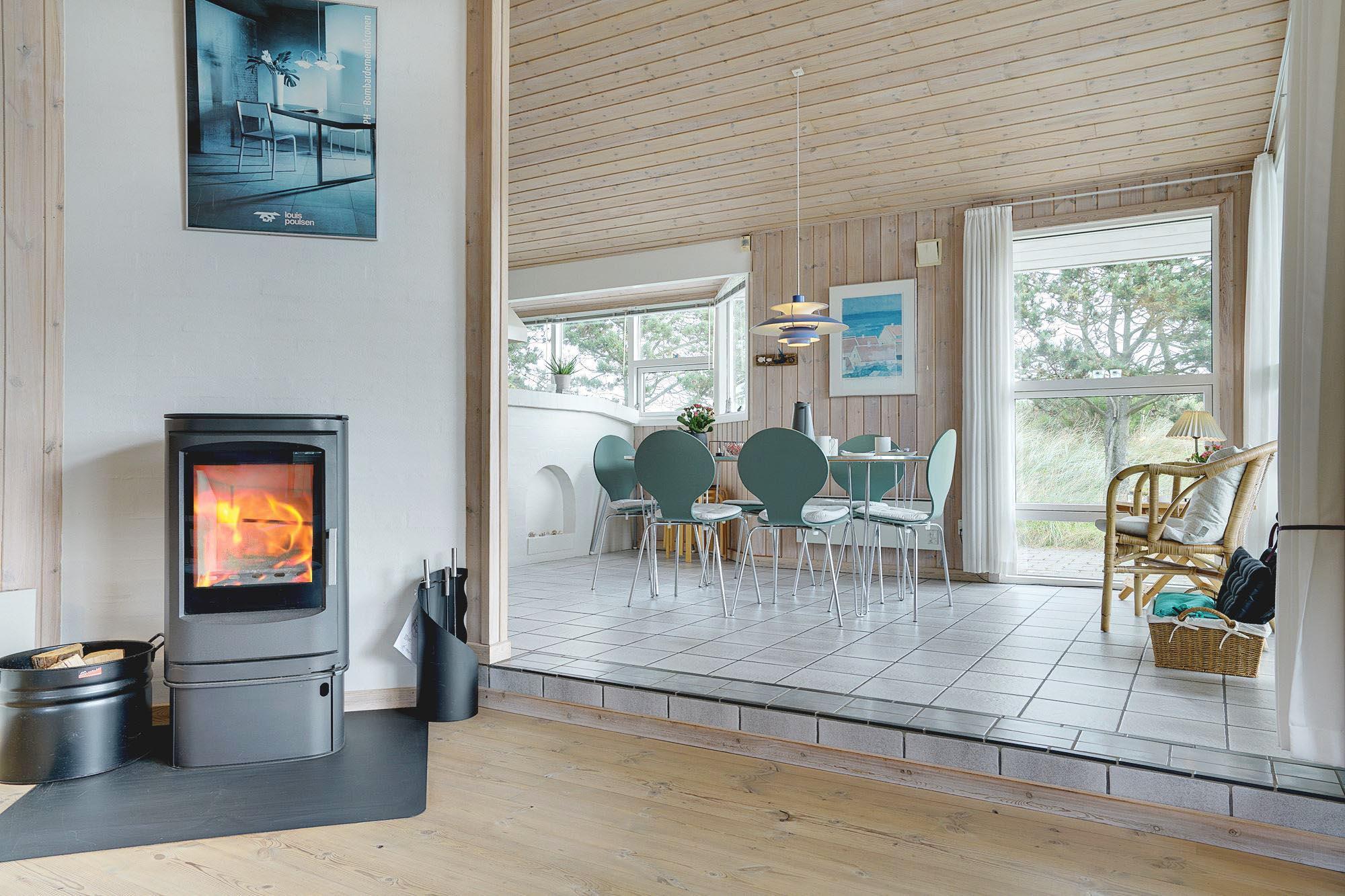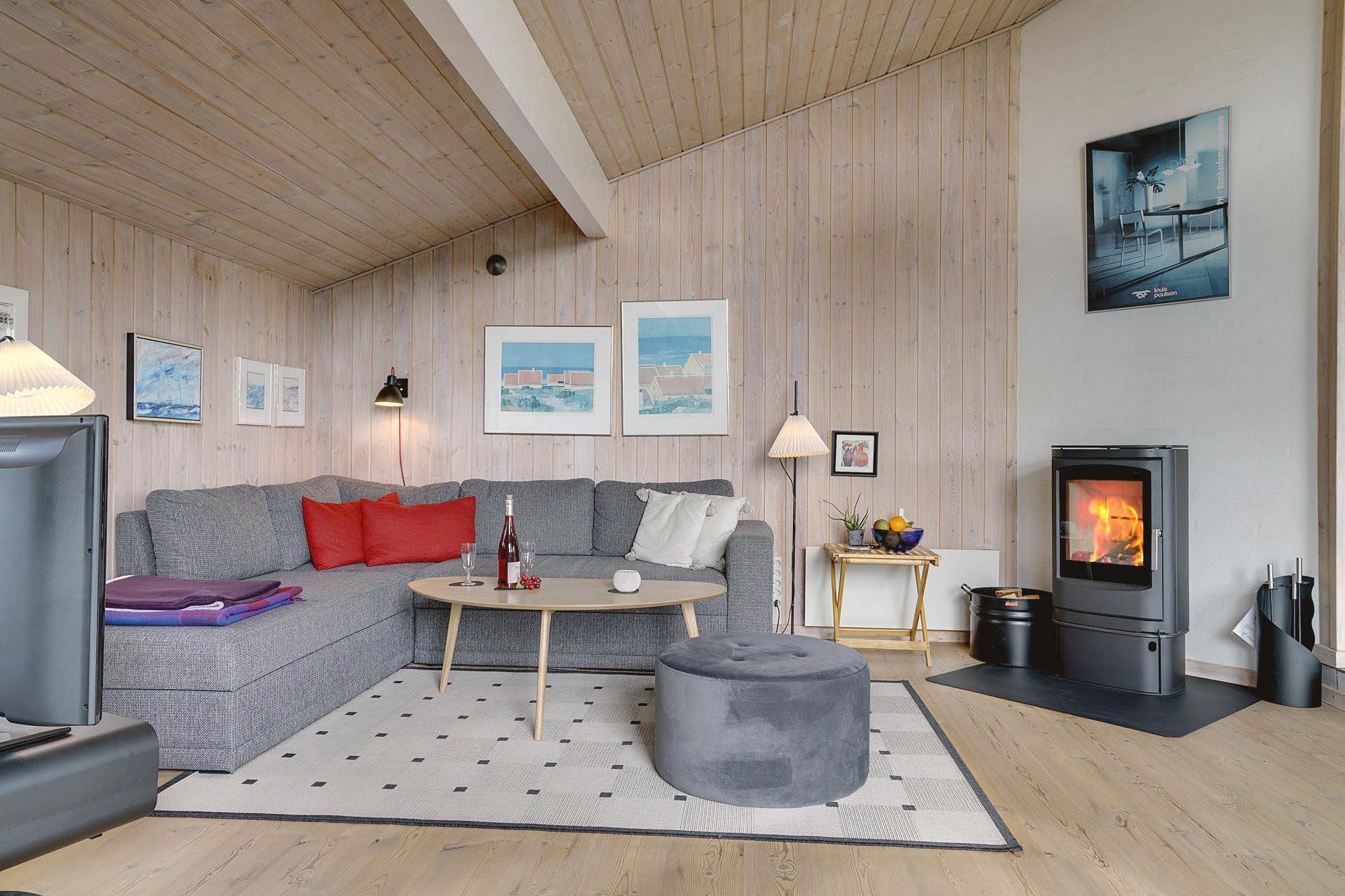Stuen ligger i forskudt plan og byder på gode kvalitetsmøbler og en brændeovn med glaslåge, der skaber varme og stemning på kølige dage.