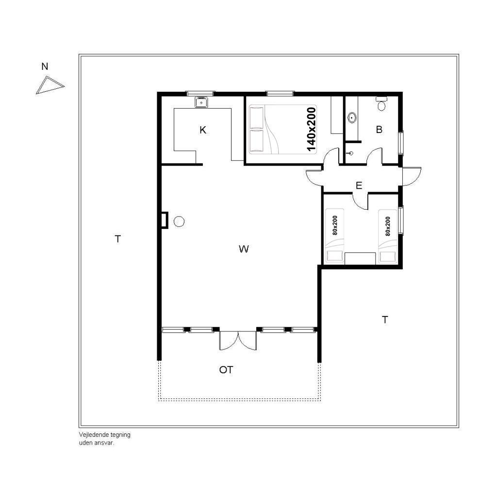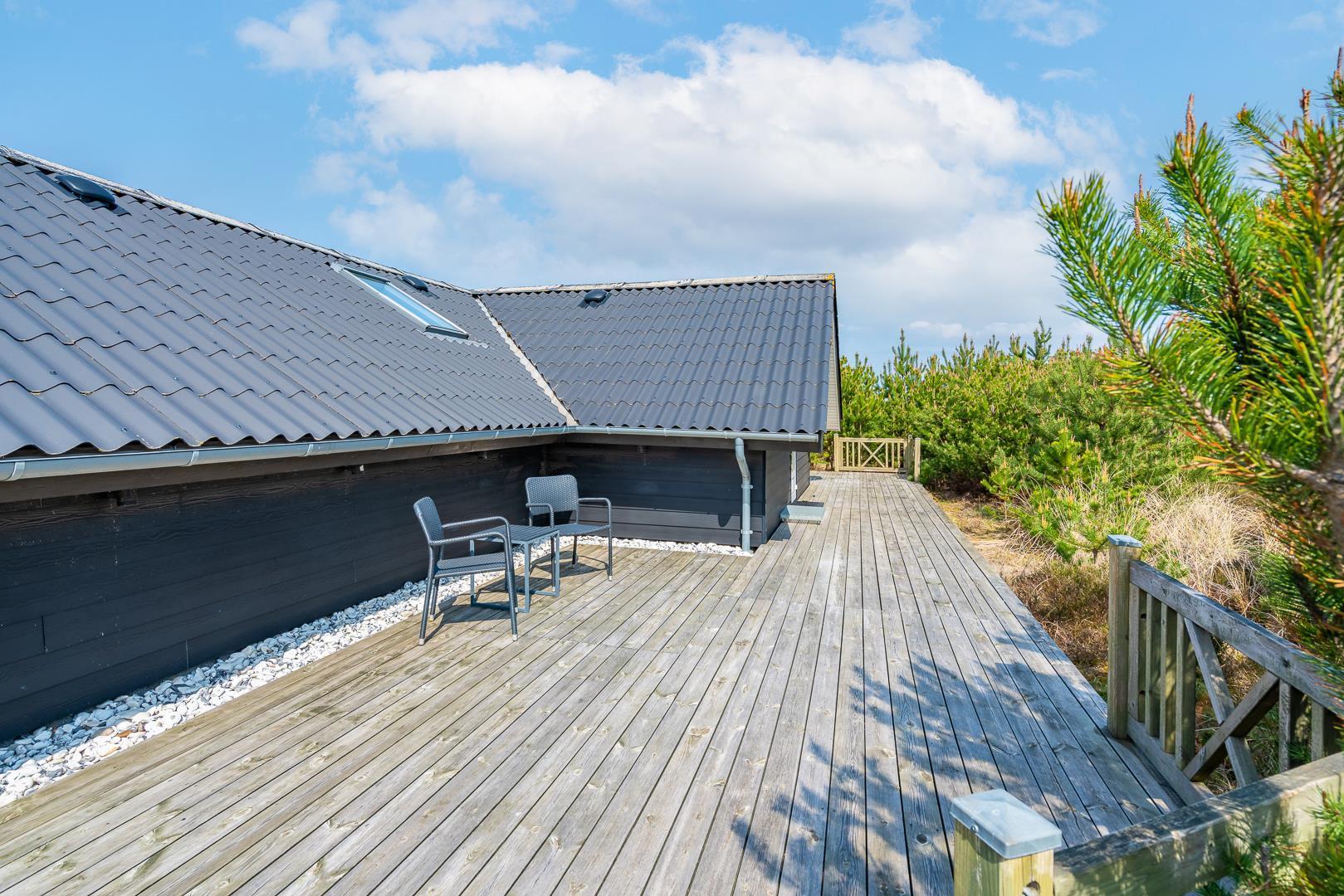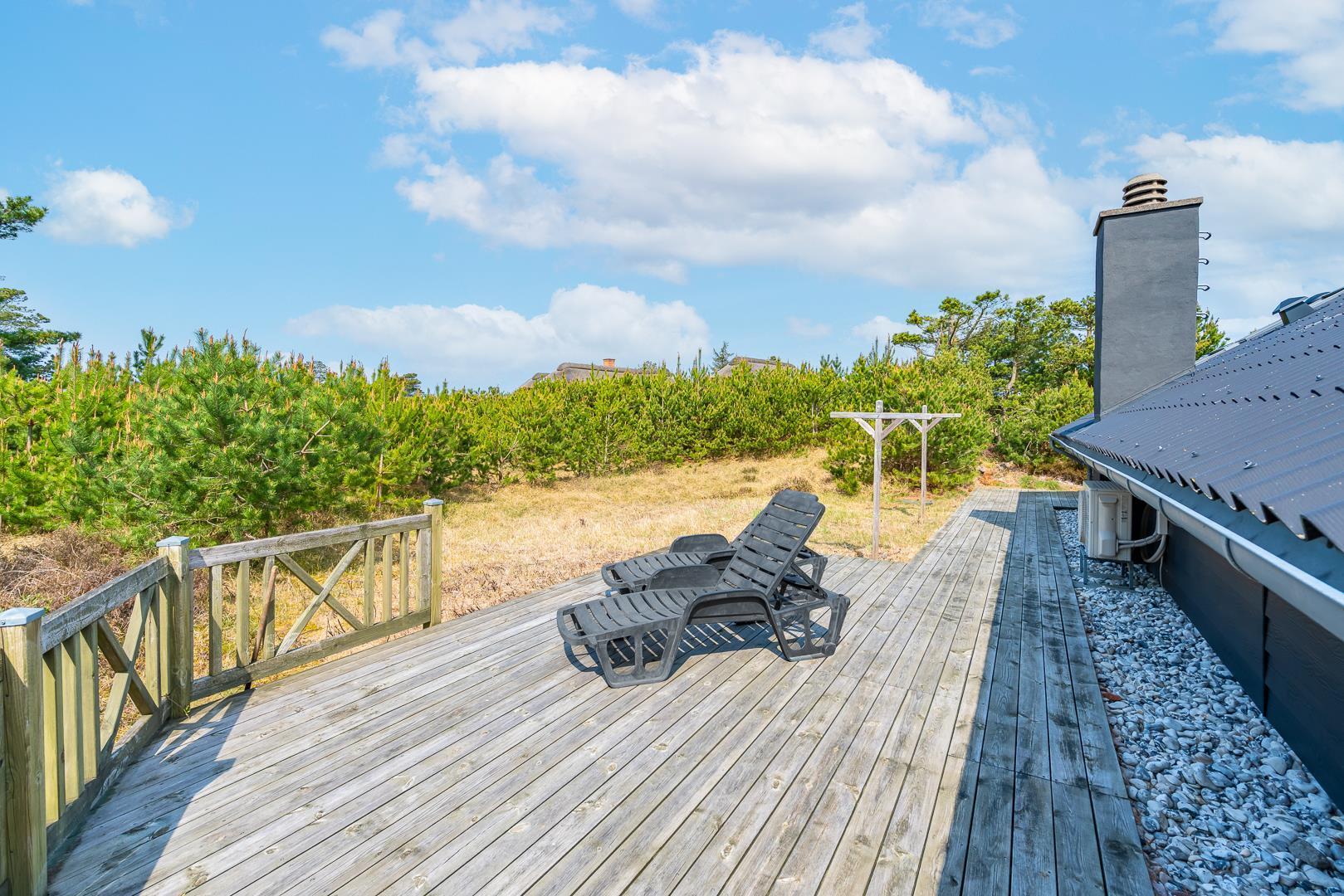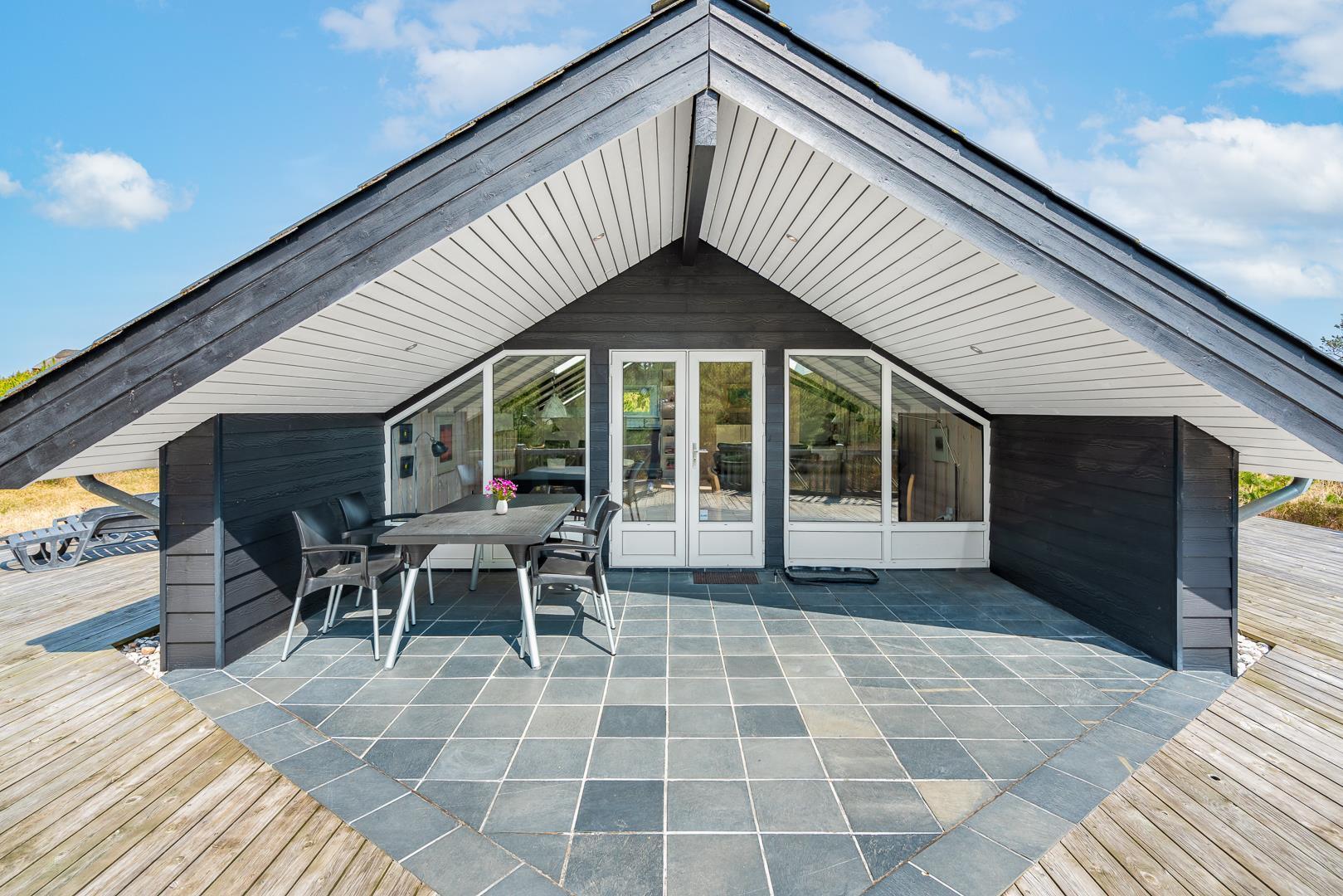 Fra stuen er der direkte adgang til en overdækket og flisebelagt terrasse. Her kan du nyde måltider eller en kop kaffe i det fri – selv når vejret ikke viser sig fra sin bedste side. Sommerhuset er desuden omgivet af en rummelig træterrasse, der indbyder til morgenkaffe i solen, afslapning i liggestolen eller grillhygge under åben himmel. Her kan ferien nydes fra morgen til aften.