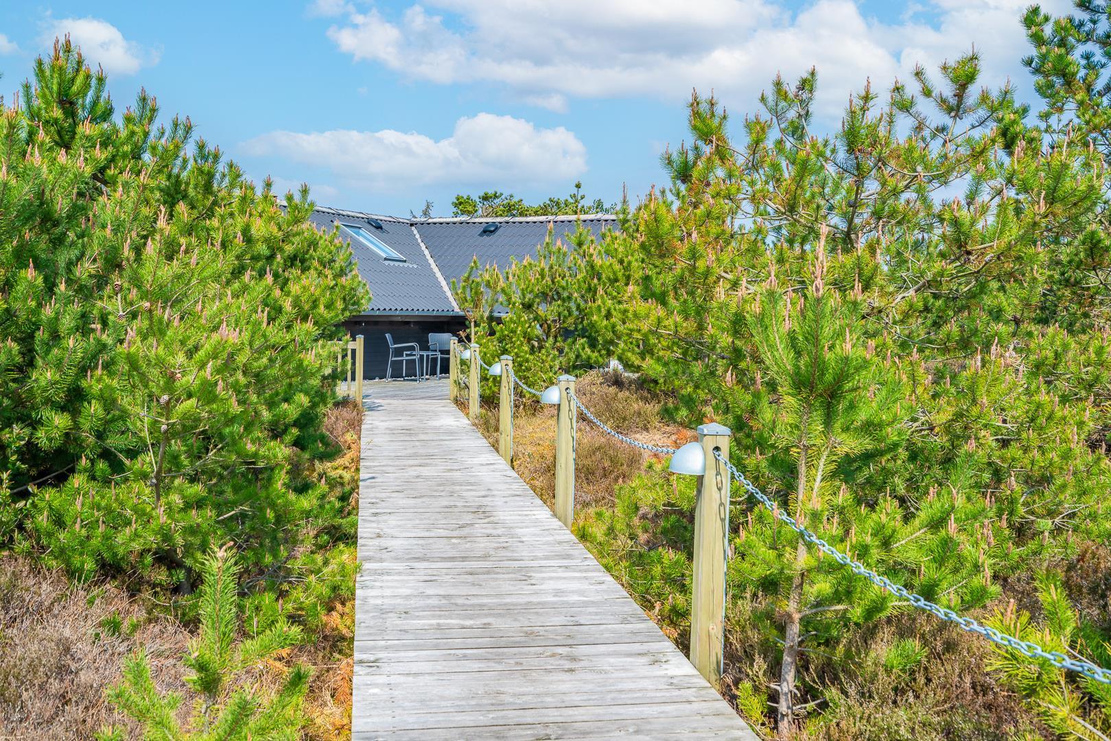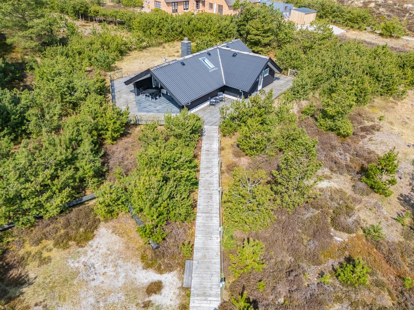 Nyd en afslappende ferie i denne charmerende oase af ro. Sommerhuset ligger fredeligt for enden af en blind vej, omgivet af tæt bevoksning og beliggende på en ugeneret klitgrund – perfekt til dig, der søger privatliv og naturskønne omgivelser.