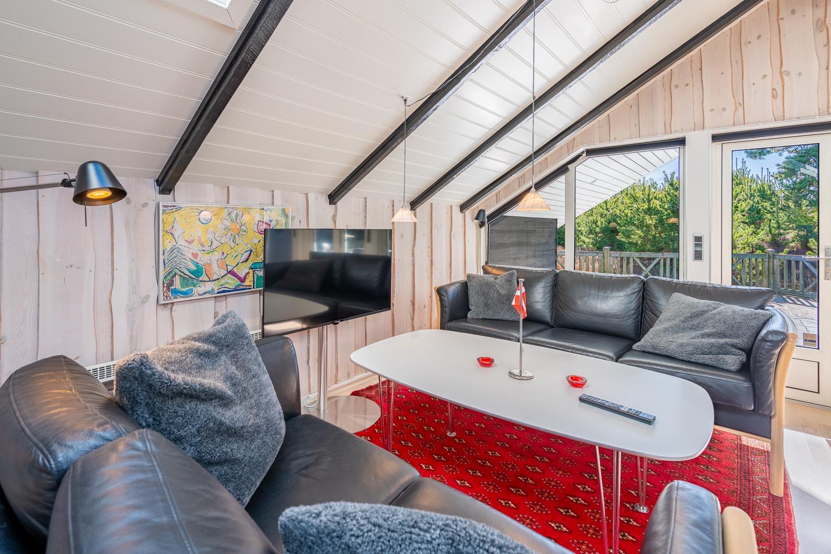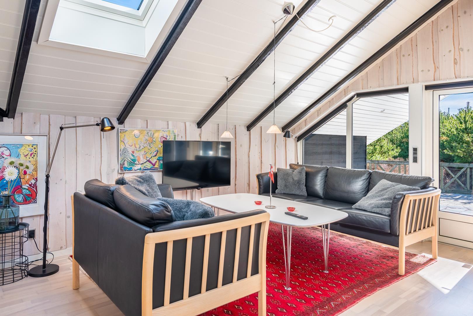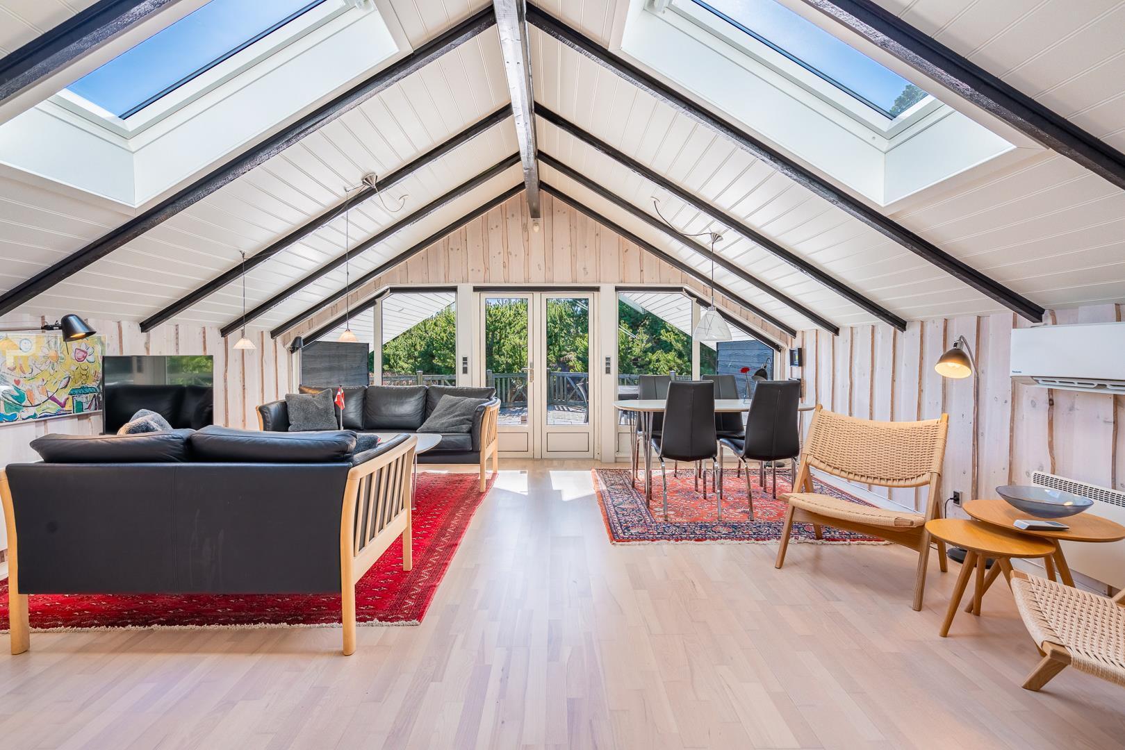 Store vinduespartier og ovenlysvinduer lukker masser af dagslys ind og skaber en lys og indbydende atmosfære. Naturen bliver en del af indretningen, og du kan nyde udsigten både inde og ude.