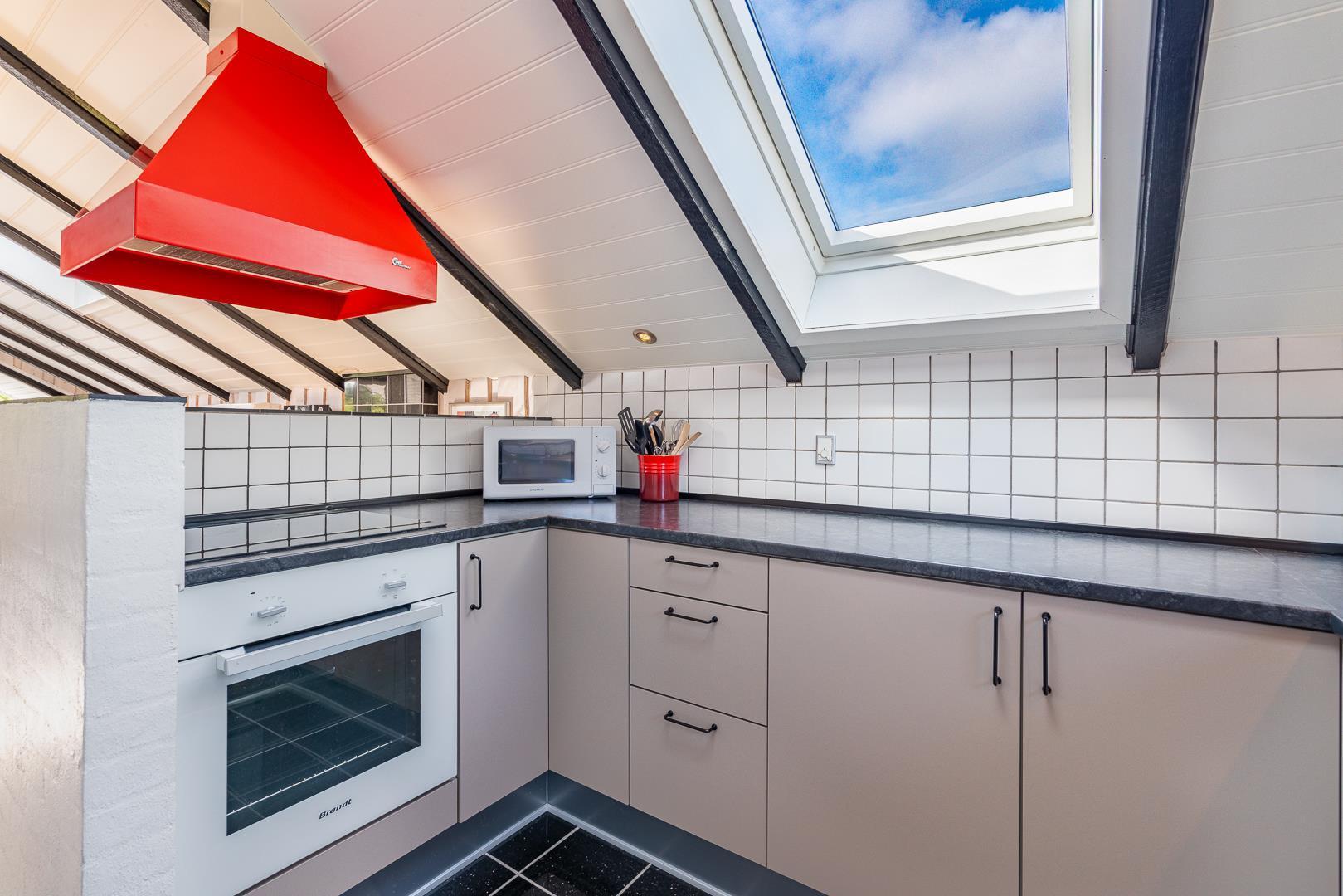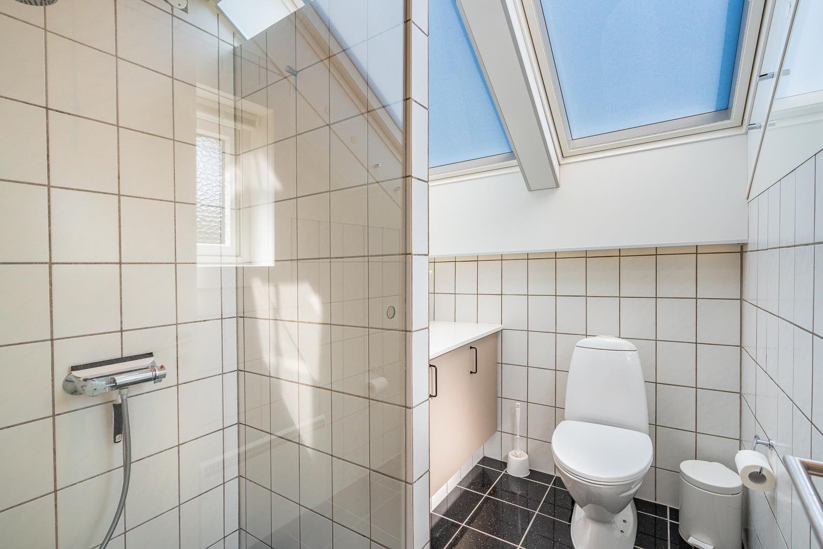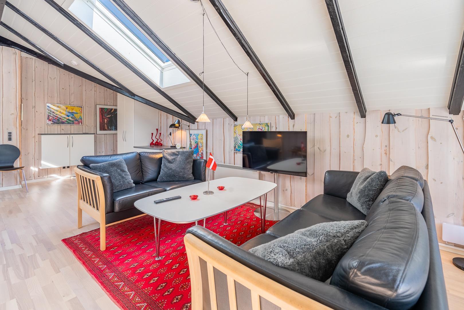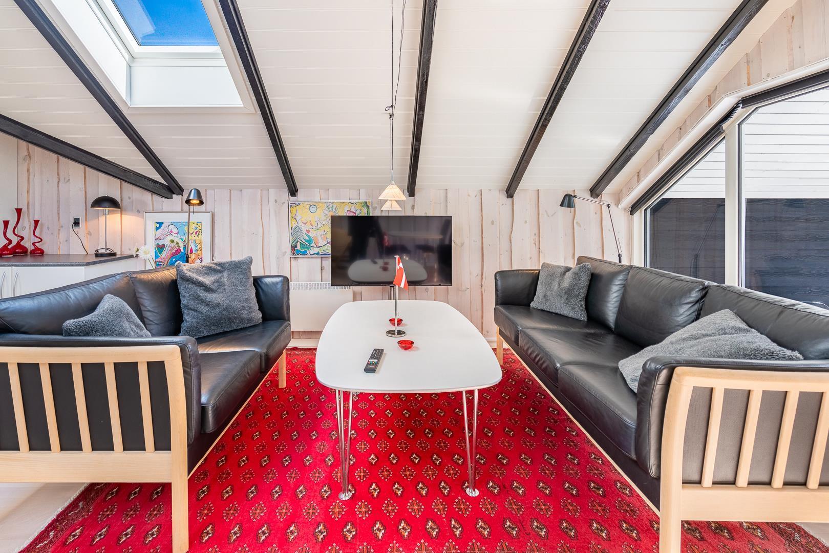 Store vinduespartier og ovenlysvinduer lukker masser af dagslys ind og skaber en lys og indbydende atmosfære. Naturen bliver en del af indretningen, og du kan nyde udsigten både inde og ude.