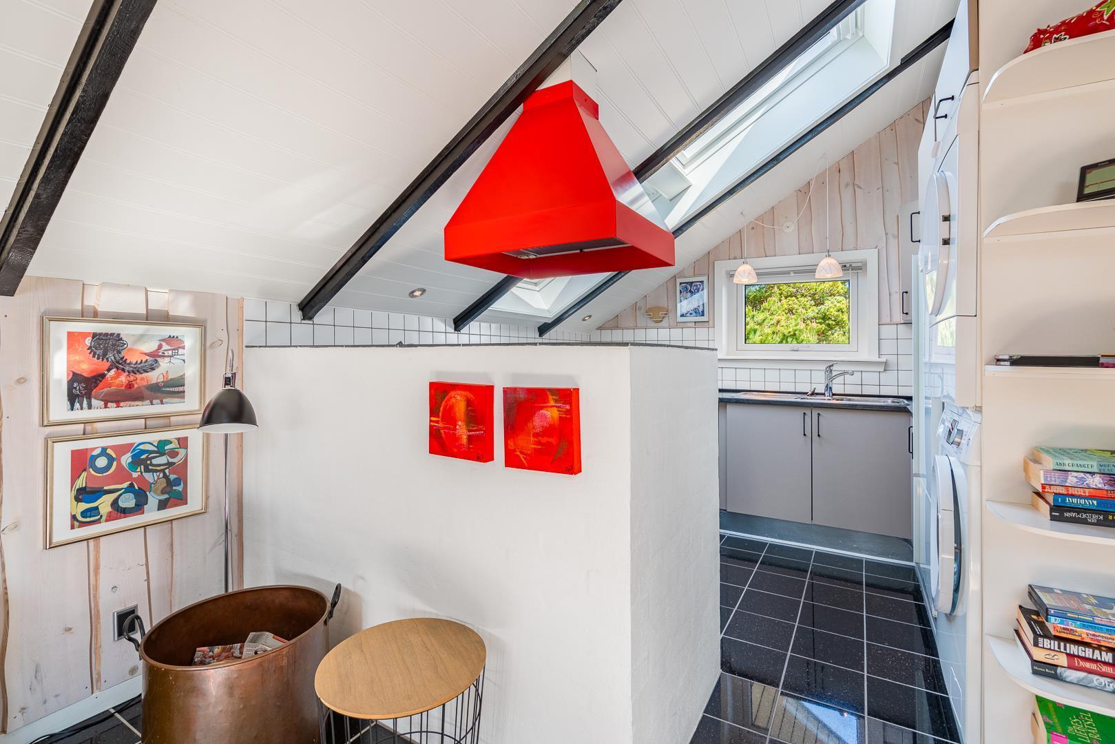 Inde i huset finder du en hyggelig stue med brændeovn, som er åbent forbundet med et veludstyret køkken. Det åbne rum giver mulighed for nærvær og samvær – selv når der laves mad.