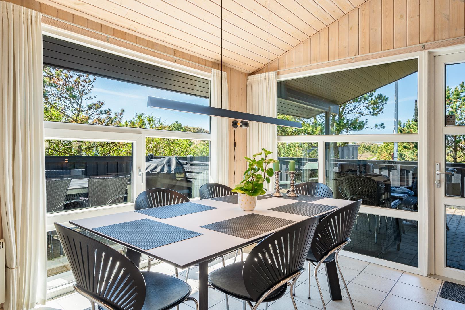 Lækkert feriehus beliggende på en pragtfuld og rolig klitgrund for enden af blind vej. Huset er meget smagfuldt indrettet med gode kvalitets møbler. Fra det lyse køkken/alrum er der direkte udgang til stor dejlig ugeneret terrasse, hvor der er altid er mulighed for at finde en god lækrog. Der er 3 gode soverum i to er der ligeledes TV. Der er stort vinduesparti som giver i godt lysindfald ind i huset. IKKE RYGERHUS
