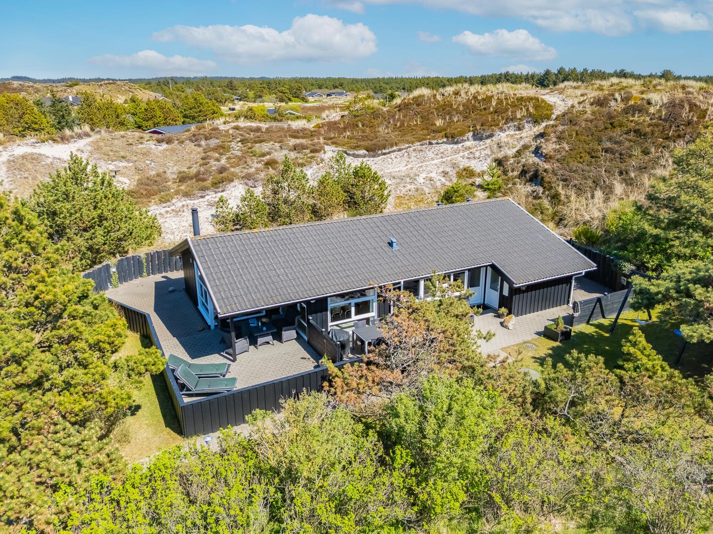 Lækkert feriehus i roligt klitområde med stor terrasse og sauna, perfekt til afslapning nær Henne Strand.
