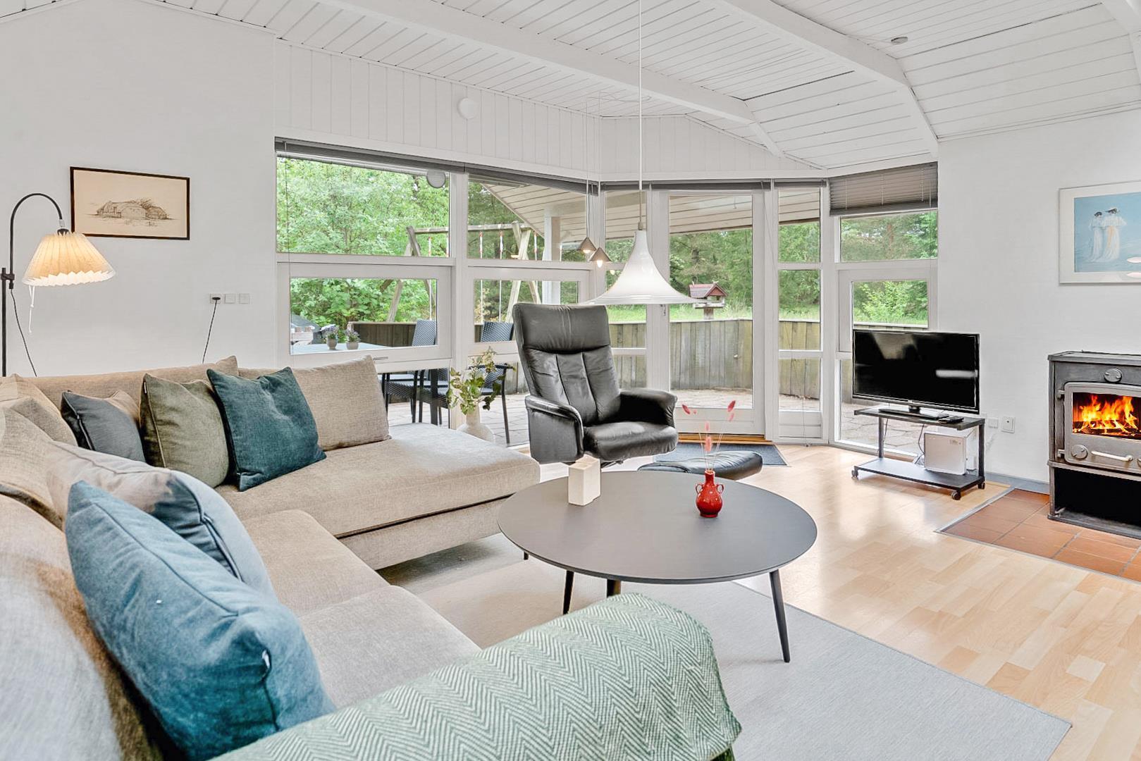 Inde i huset mødes du af et rummeligt og lyst køkken/alrum, udstyret med en hyggelig brændeovn, der skaber en varm og indbydende atmosfære. Køkkenet er rigtig fint og fra 2023 og byder på moderne hårde hvidevarer, der gør det til en fornøjelse at tilberede måltider. De store vinduer sørger for, at rummet er badet i naturligt lys og skaber en venlig og åben atmosfære.
