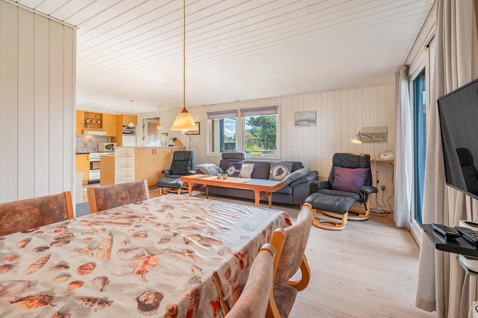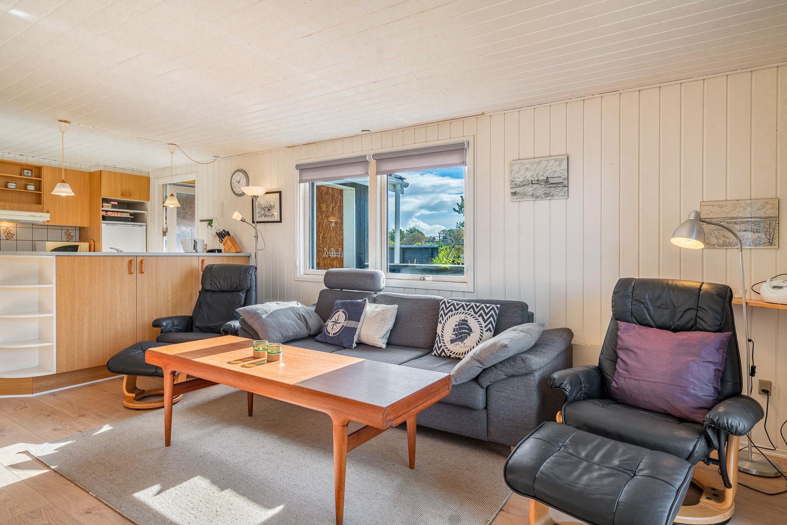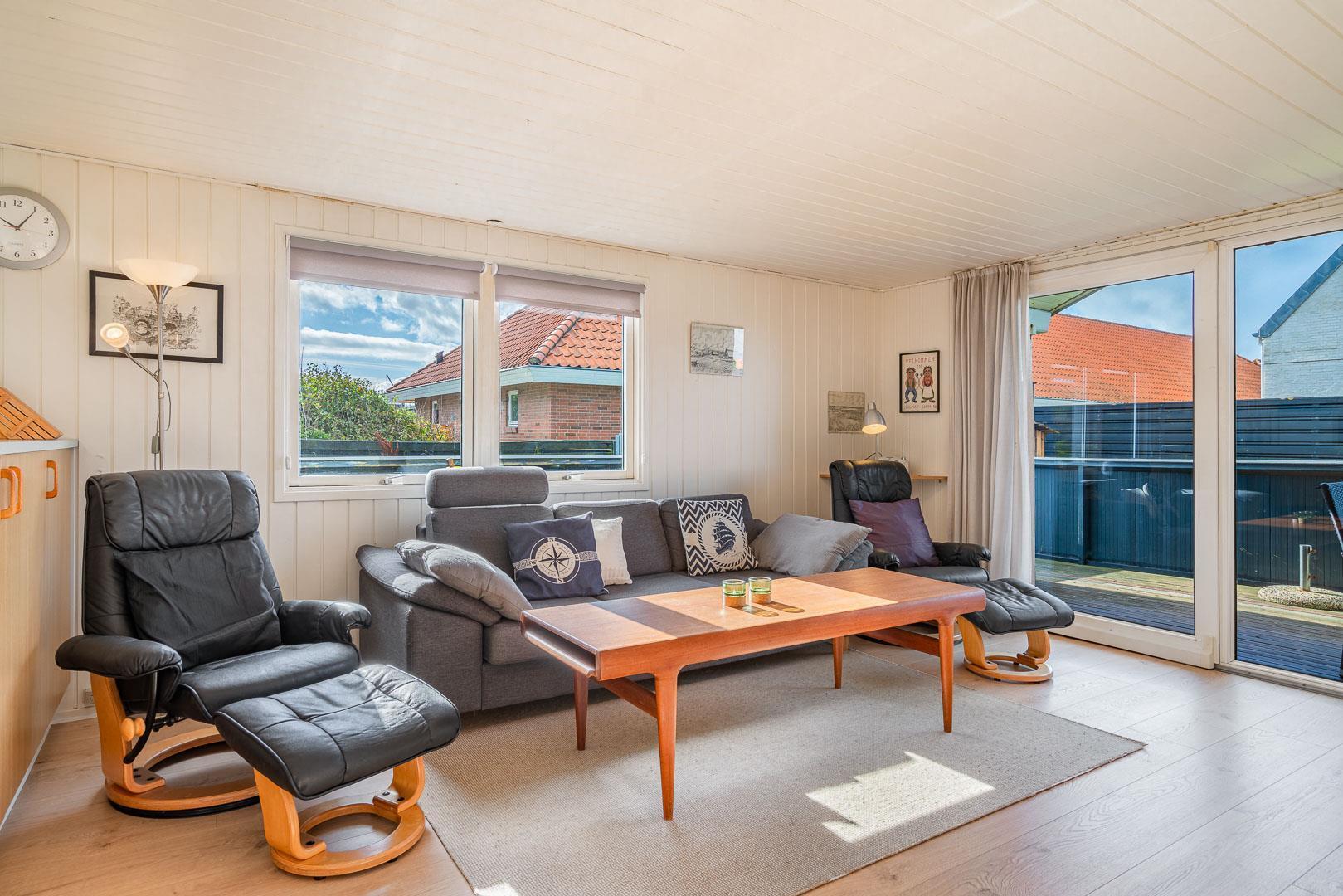 Hyggeligt og lyst feriehus i Henne Strand med sauna, lukket terrasse og tæt på stranden og butikker.