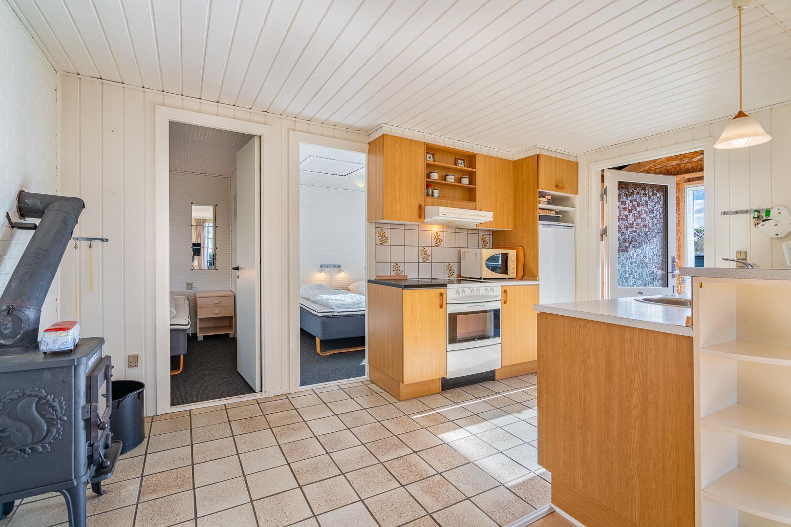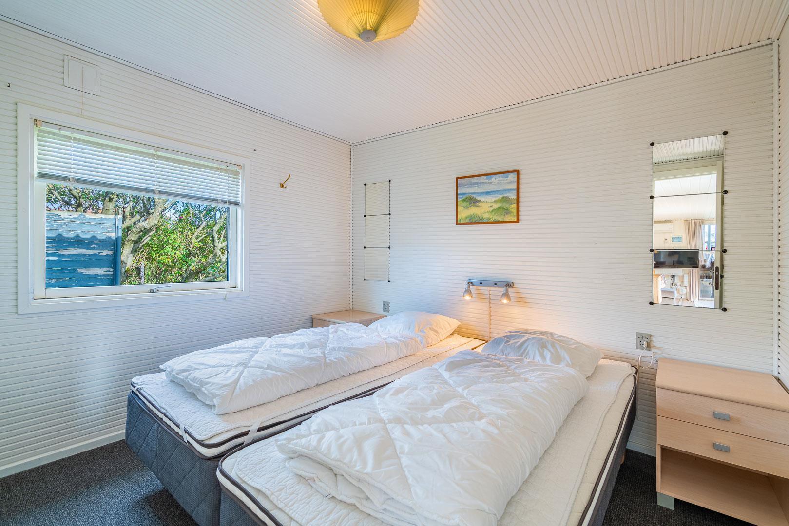 Meget velholdt, lyst og hyggeligt feriehus beliggende på en naturgrund tæt ved byen - men alligevel ugenert. Køkkenet er kombineret med stuen som er indrettet med gode møbler. Godt badeværelse med klinker og 2 gode soverum. Til huset hører dejlig lukket og læfuld terrasse. Sengestørrelser: dobbeltseng 180x200 cm. (2 madrasser), dobbeltseng 180x200 cm. (2 madrasser).