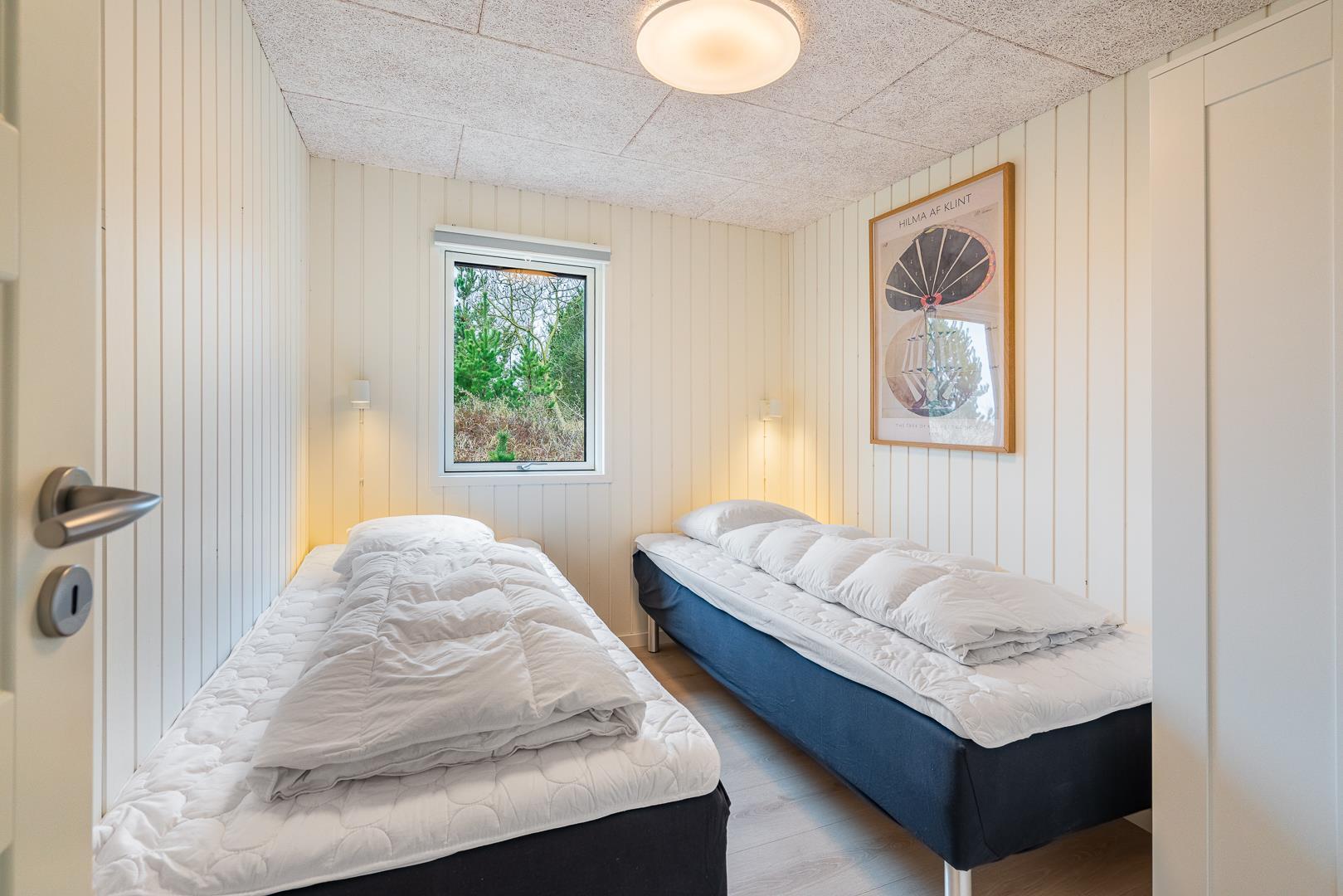 Sommerhuset har plads til 6 personer og rummer tre soveværelser: to med dobbeltsenge og ét med to enkeltsenge. Derudover er der hele to badeværelser, hvilket gør det ideelt til både familier og par, der rejser sammen. Overalt fremstår sommerhuset lyst, moderne og imødekommende – klar til at danne rammen om jeres næste ferie.