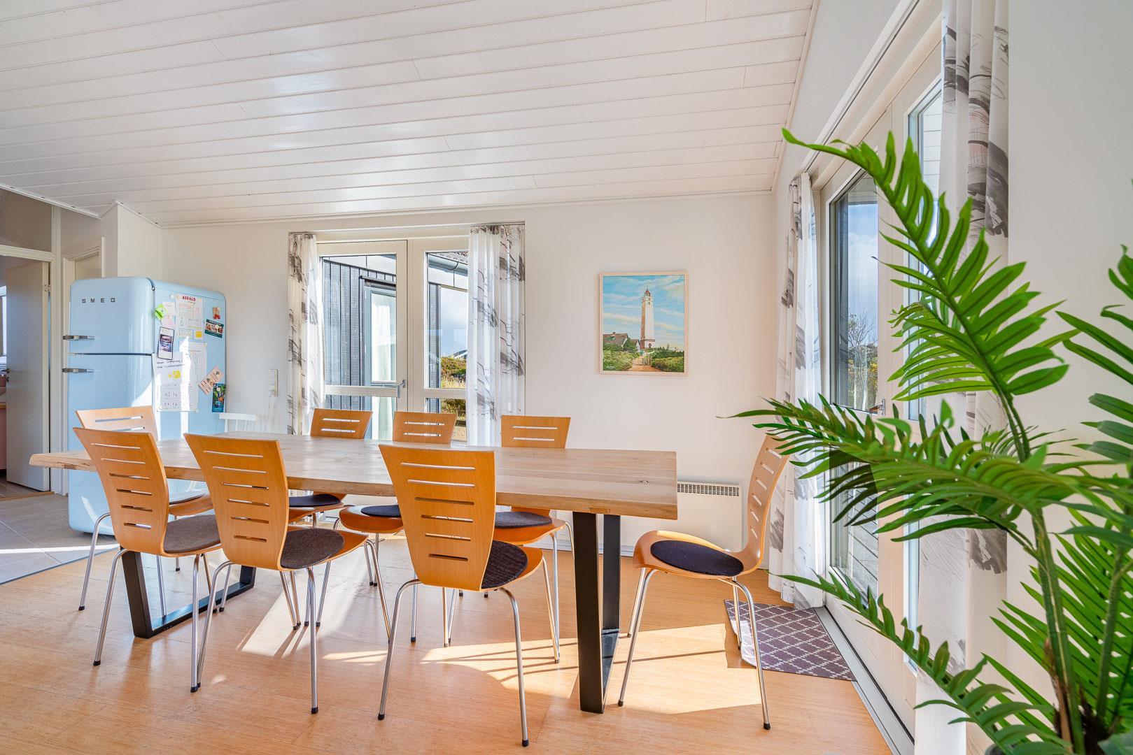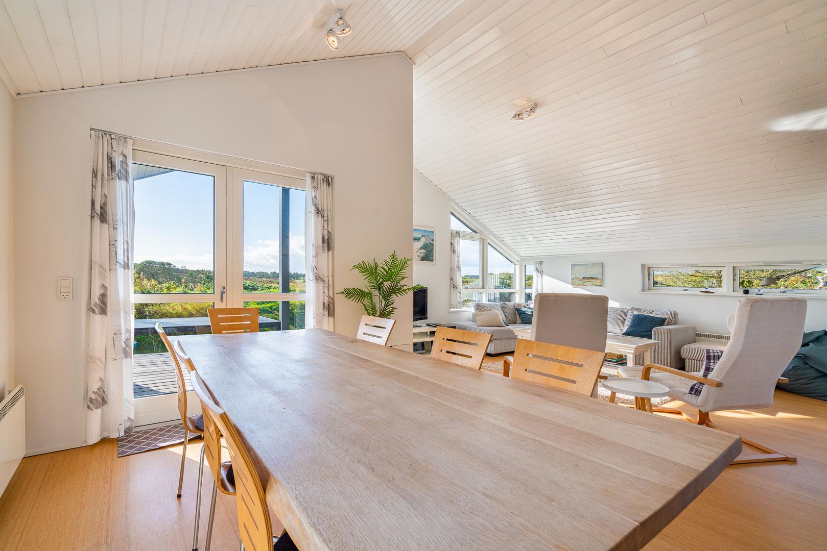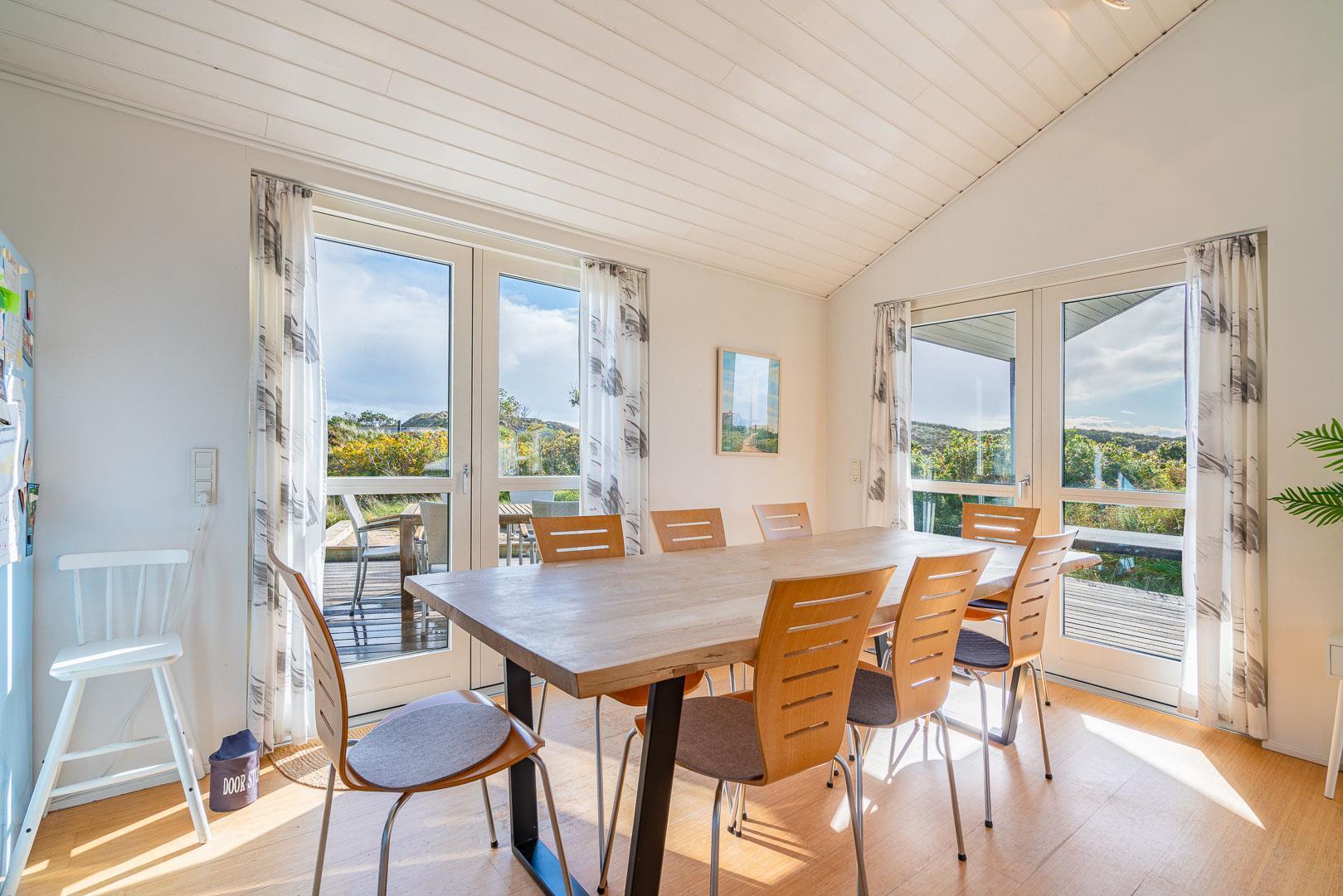 Den lyse spisestue byder på udsigt over klitlandskabet og indbyder til hyggelige måltider og rolig fordybelse.