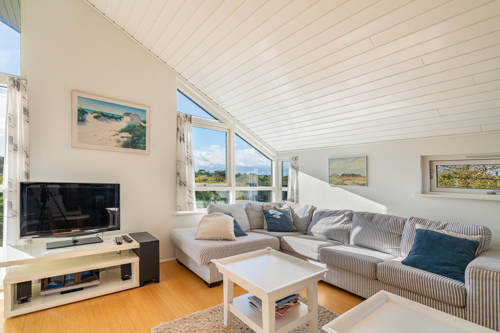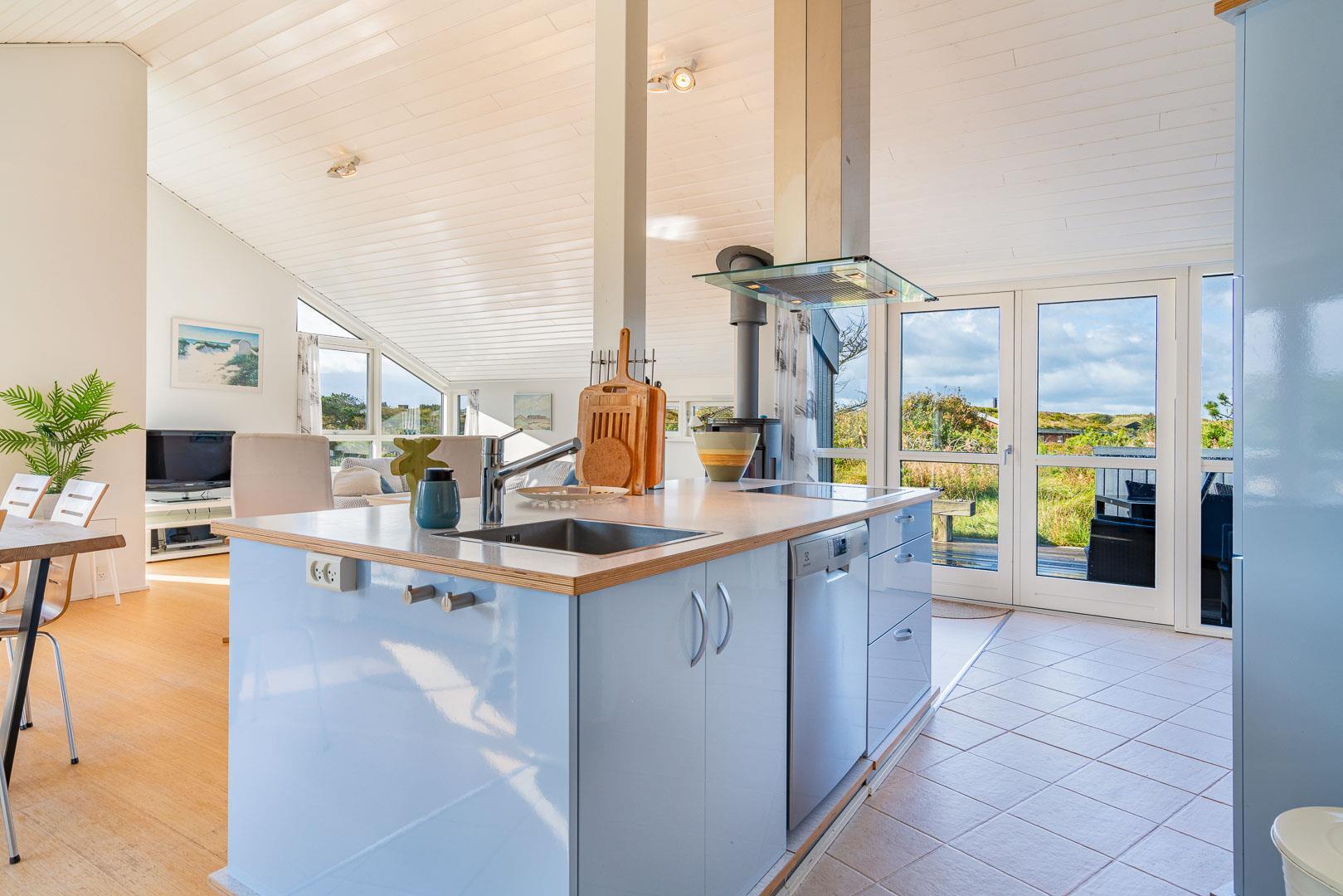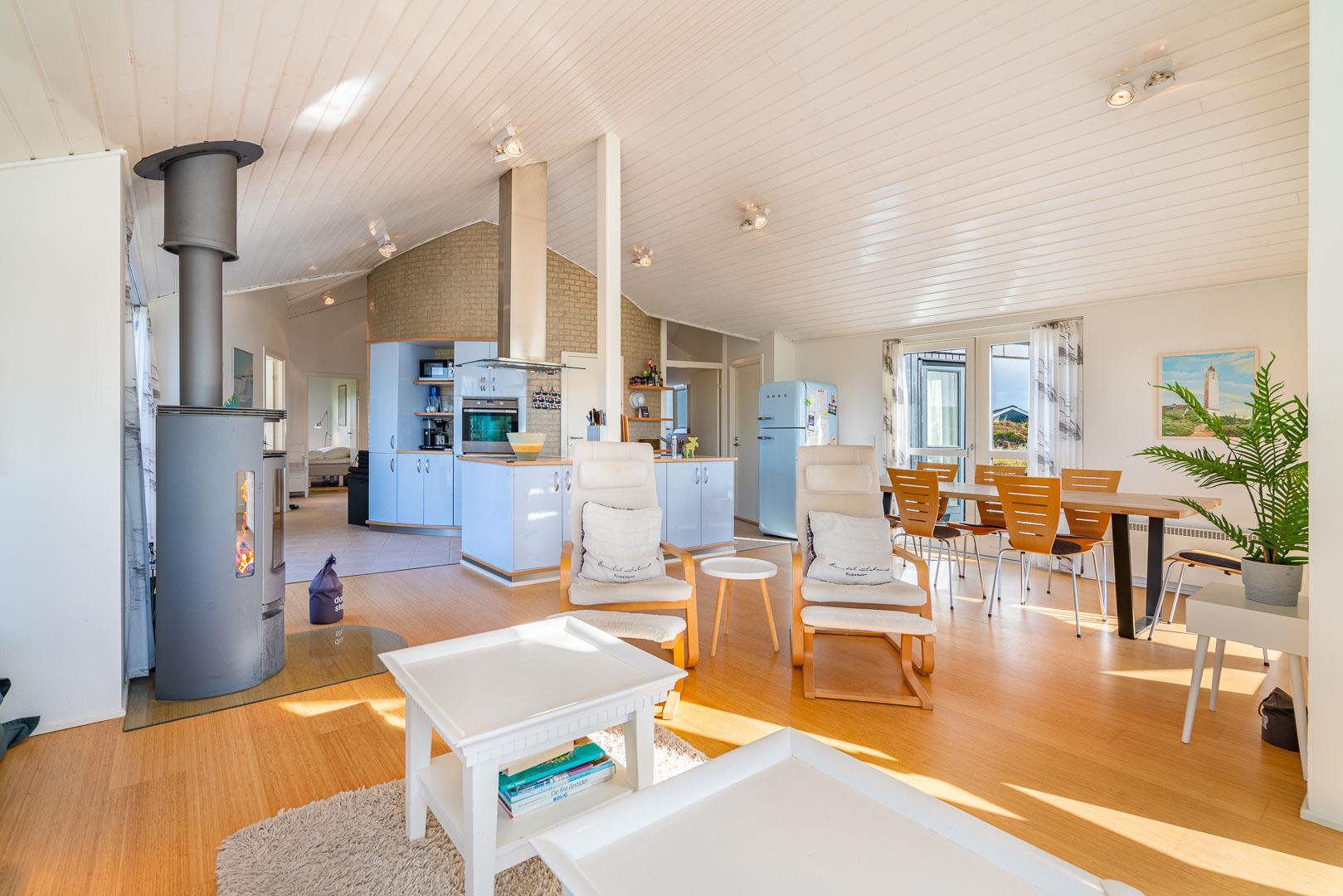 Den lyse spisestue byder på udsigt over klitlandskabet og indbyder til hyggelige måltider og rolig fordybelse.