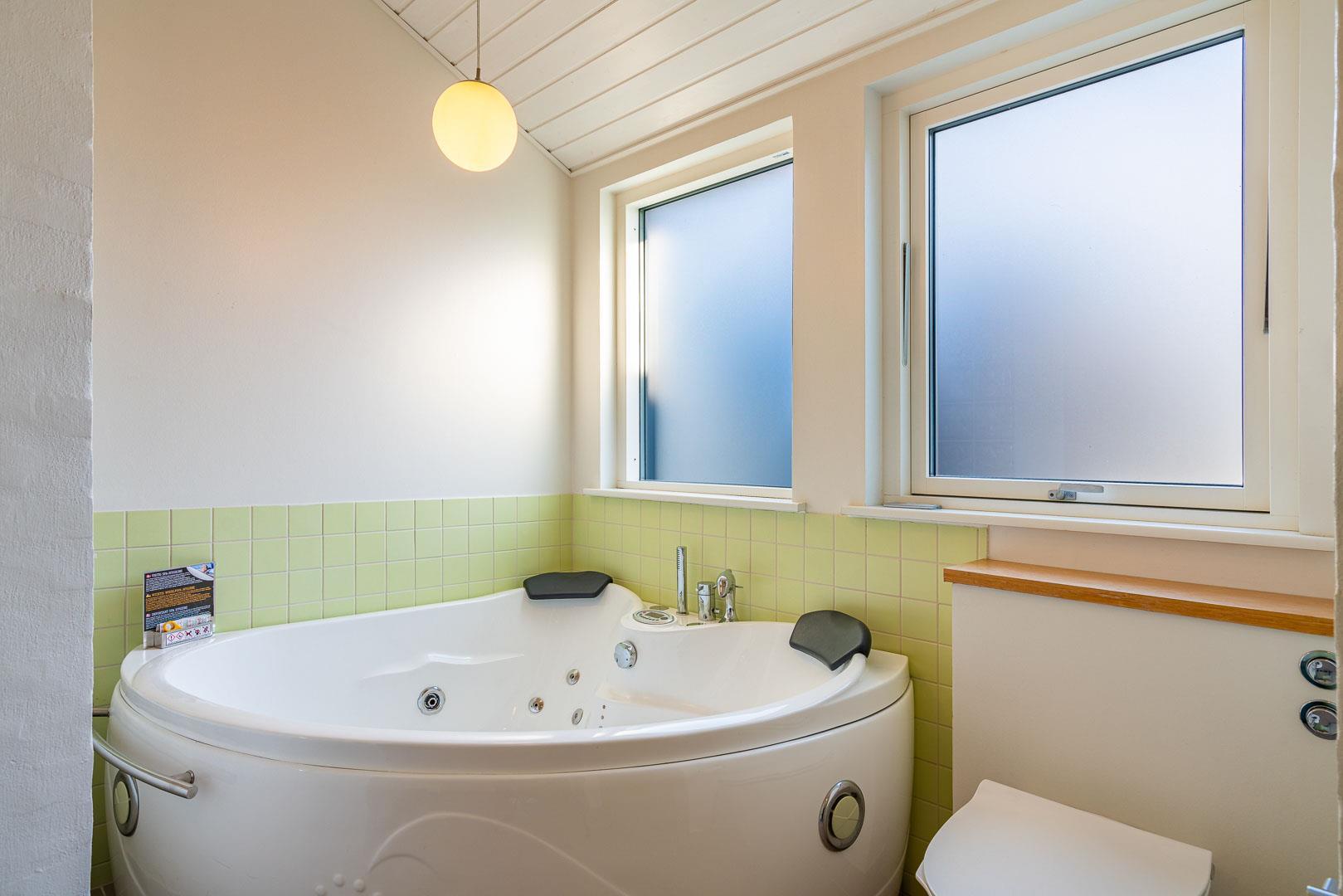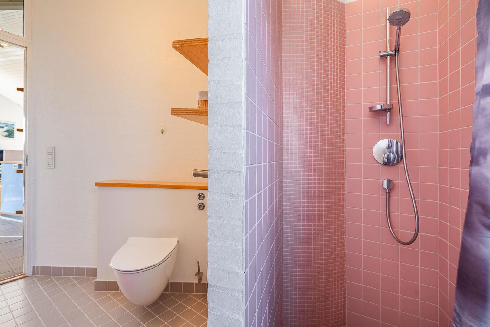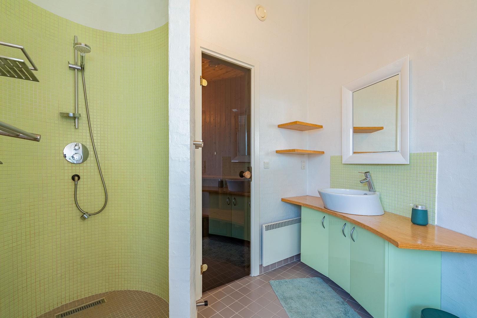 Indendørs venter to flotte badeværelser med bruseniche – det ene med både 2-personers spa og sauna for ekstra velvære.