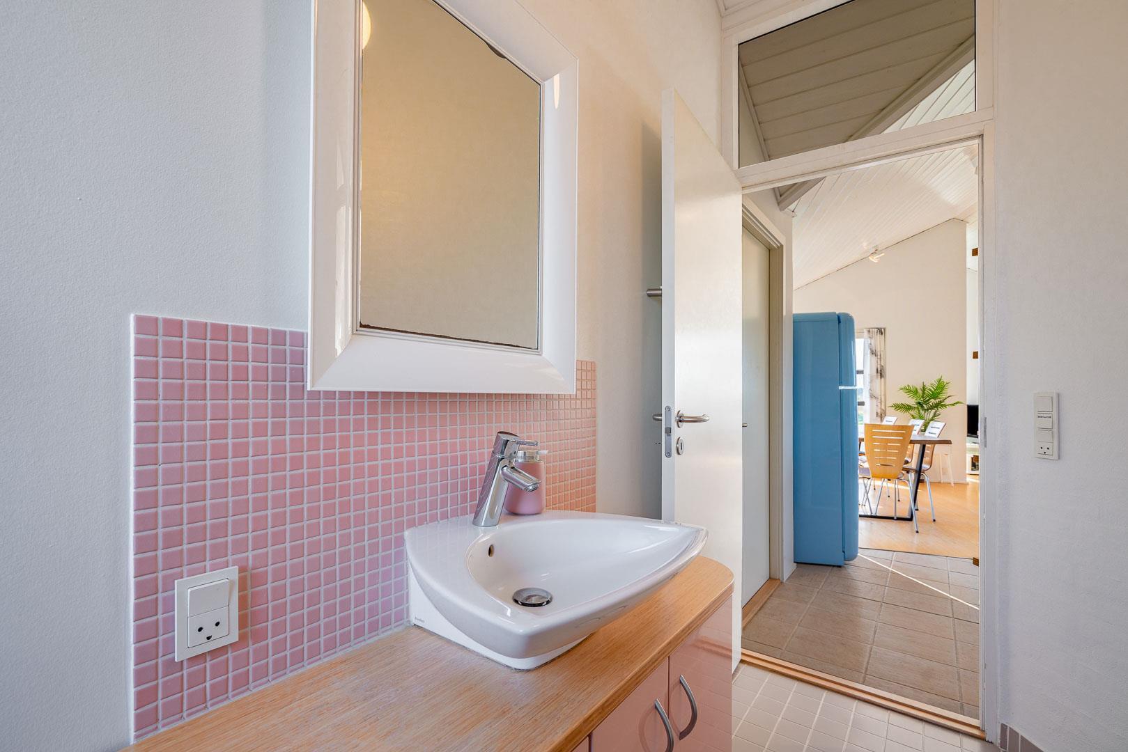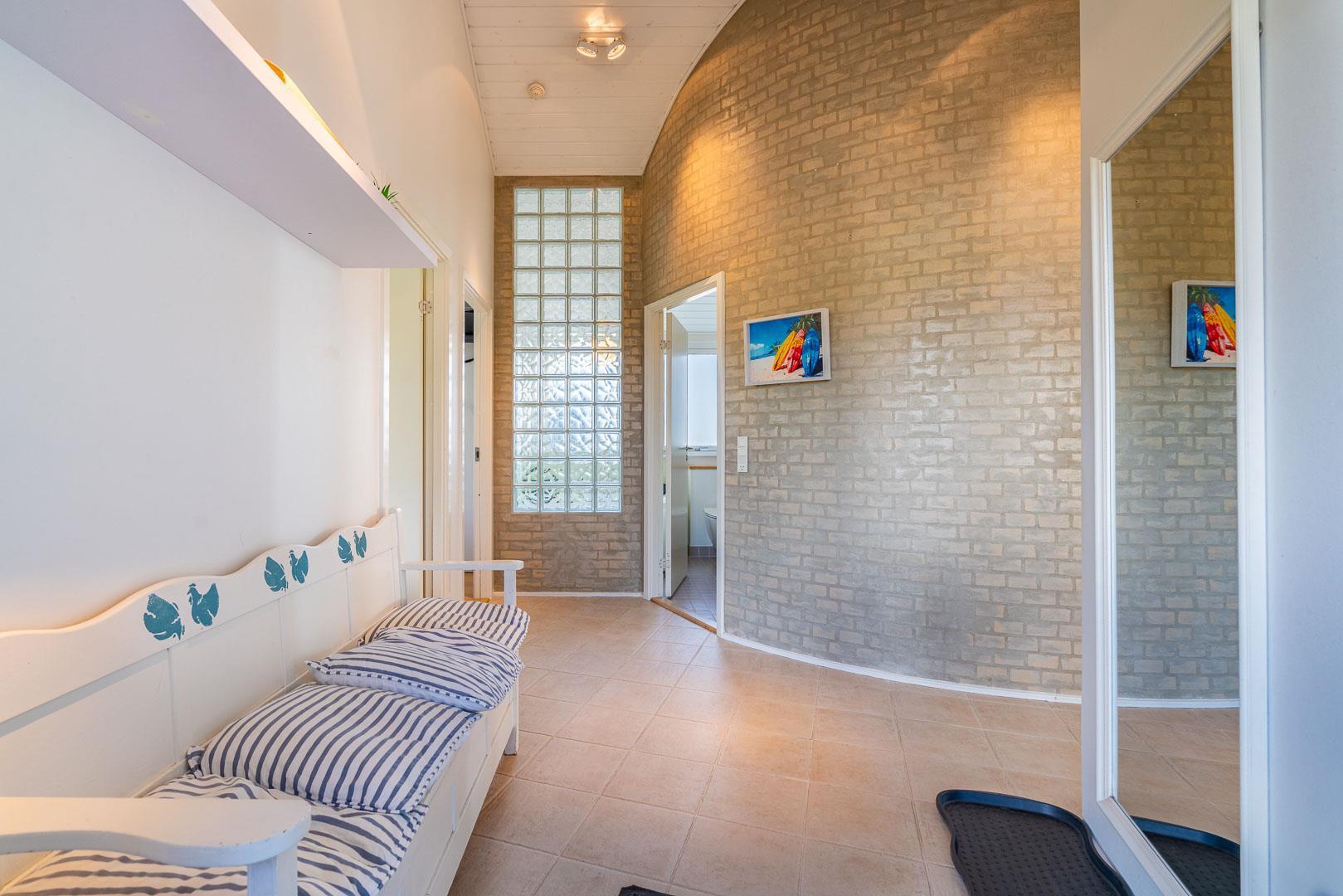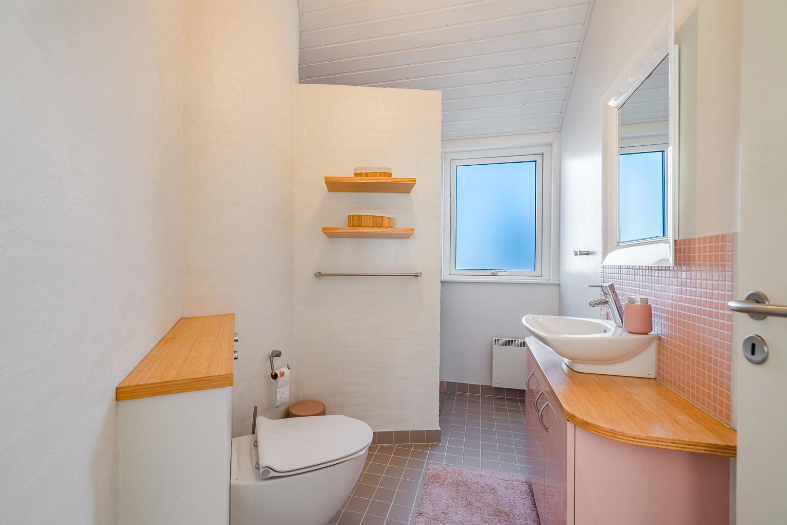 Indendørs venter to flotte badeværelser med bruseniche – det ene med både 2-personers spa og sauna for ekstra velvære.