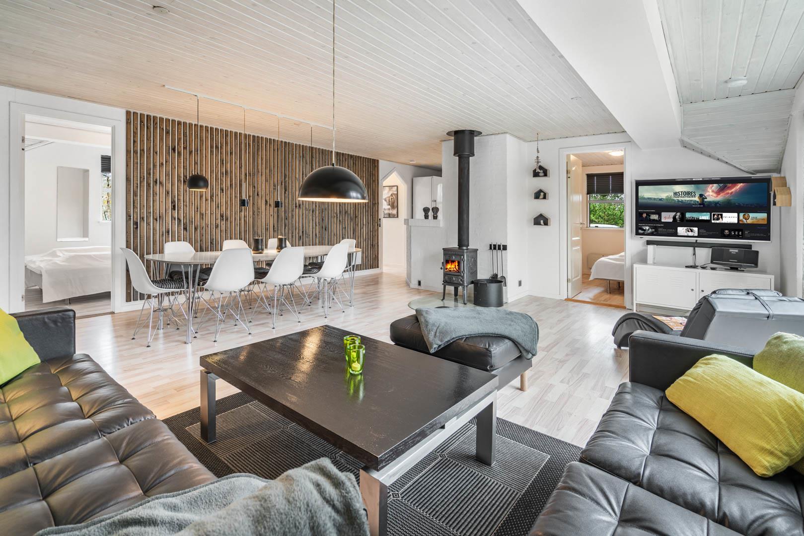 Når dagen er gået med hygge og leg, kan I smide jer med en i den rummelige, hyggelige og moderne stue og nyde varmen fra sommerhusets brændeovn. Sommerhuset er praktisk indrettet til 2 familier og der er derfor god plads til 8 personer.