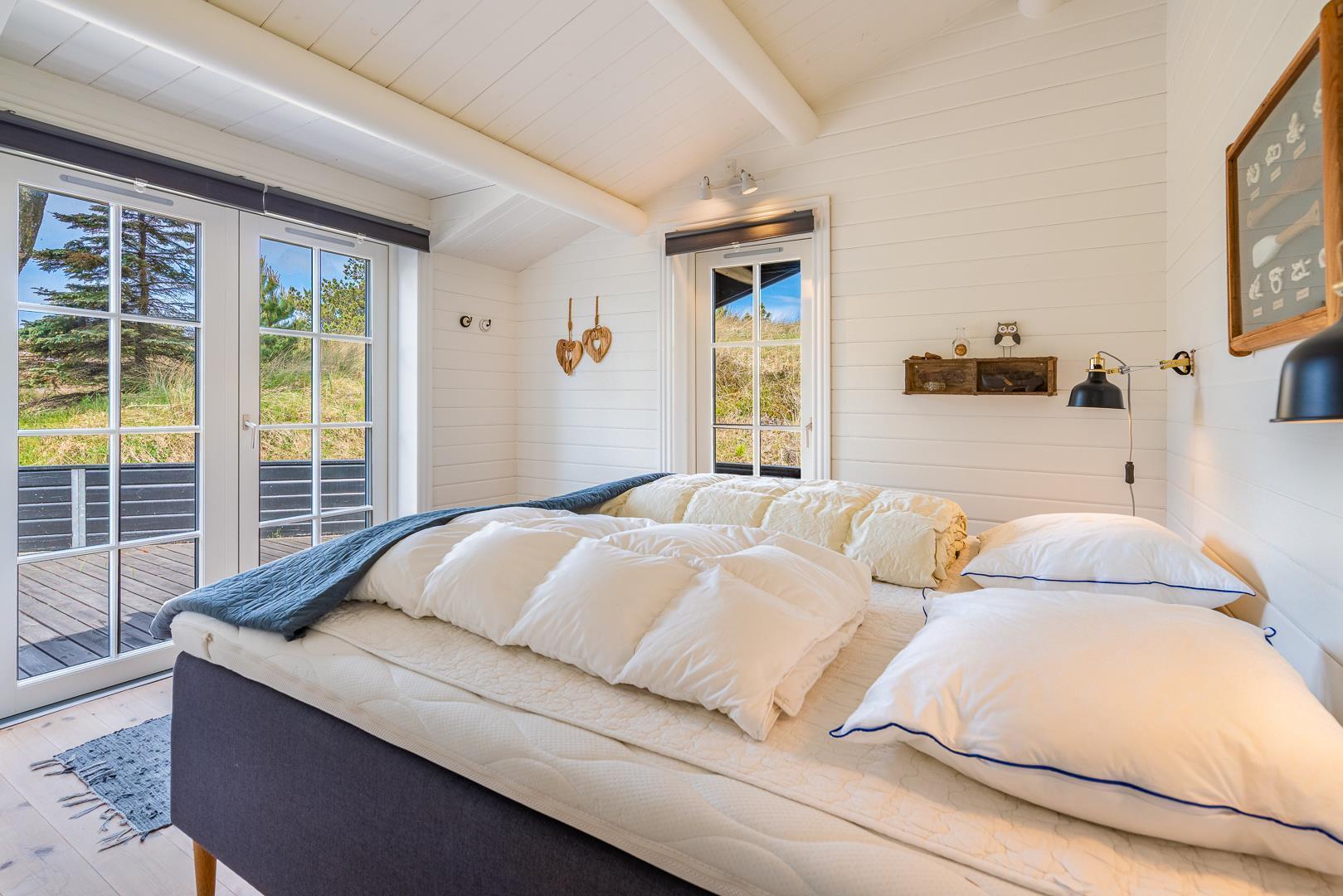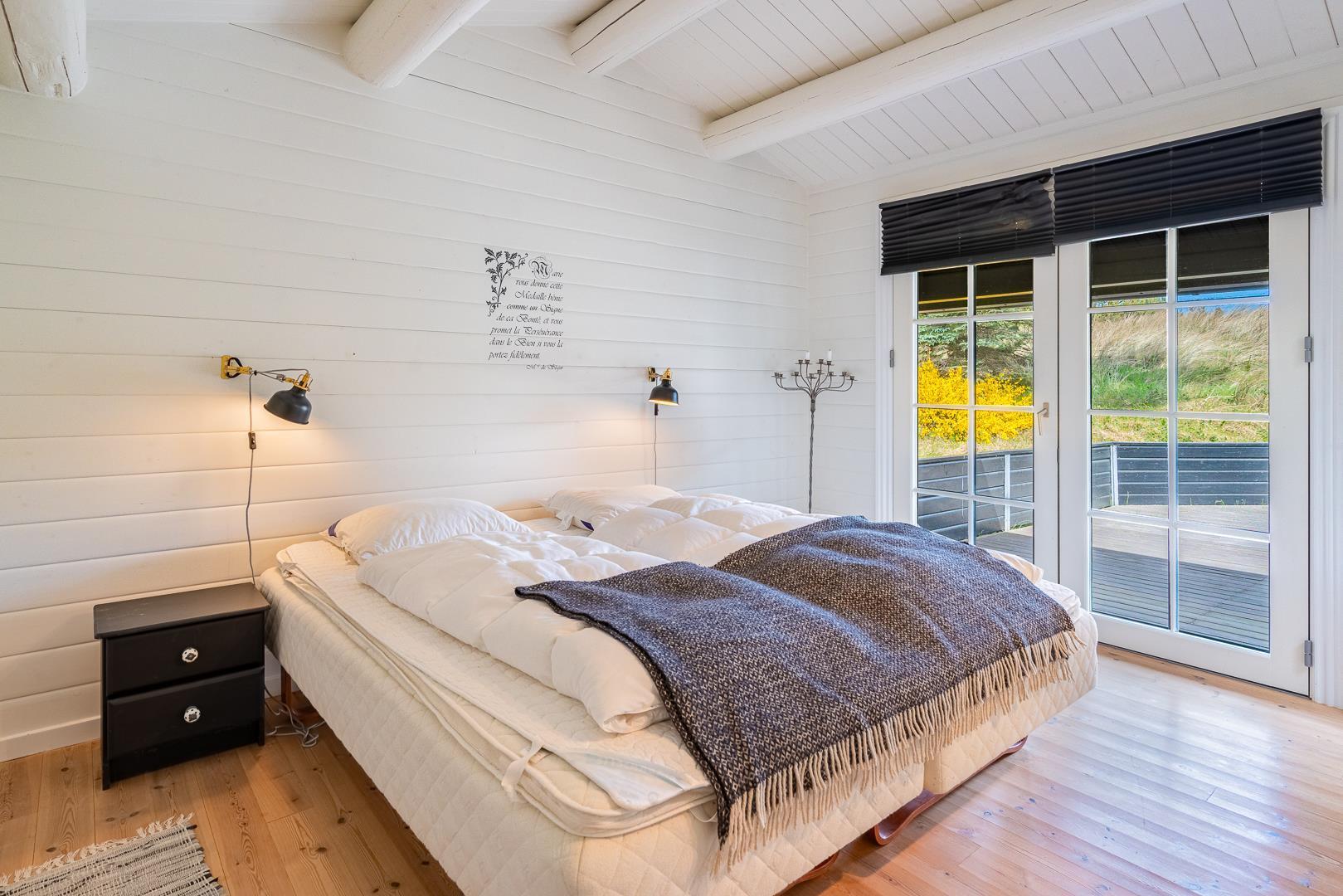 Indretningen byder på tre soverum, hvoraf to er meget rummelige og indrettet med dobbeltsenge. Fra det ene soveværelse er der direkte udgang til en skøn udendørsbruser – en luksus, der forlænger sommerfølelsen.