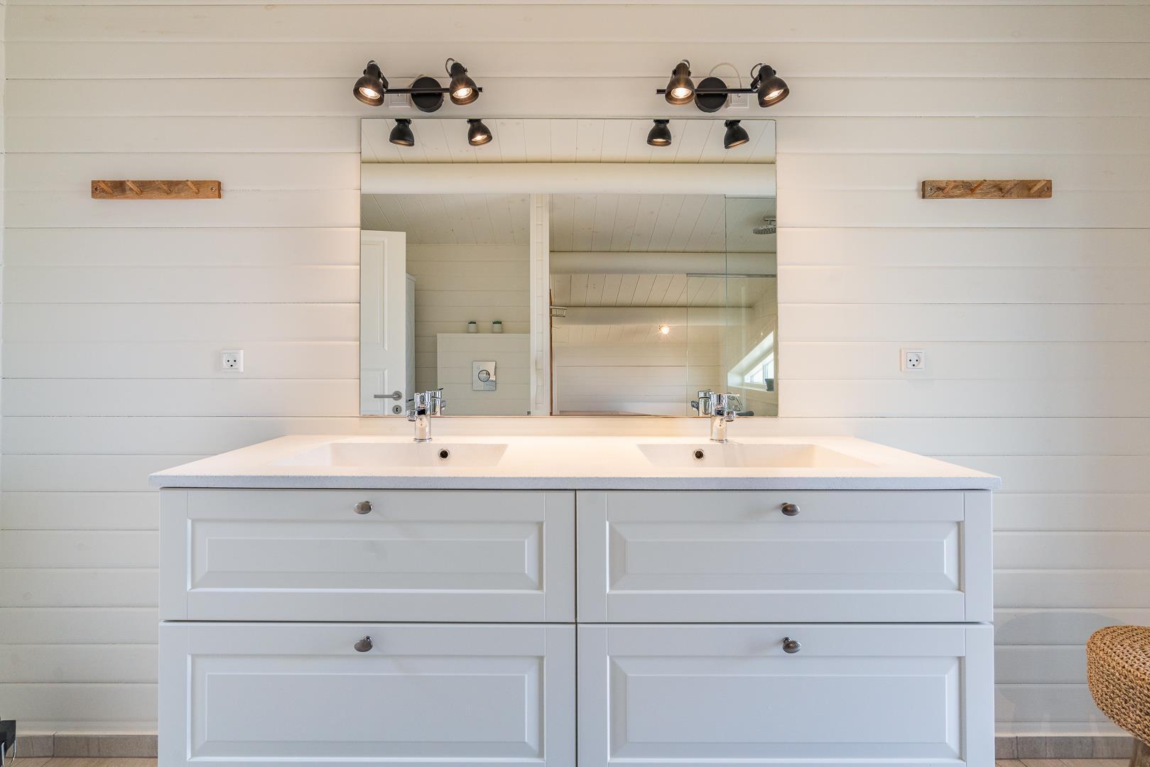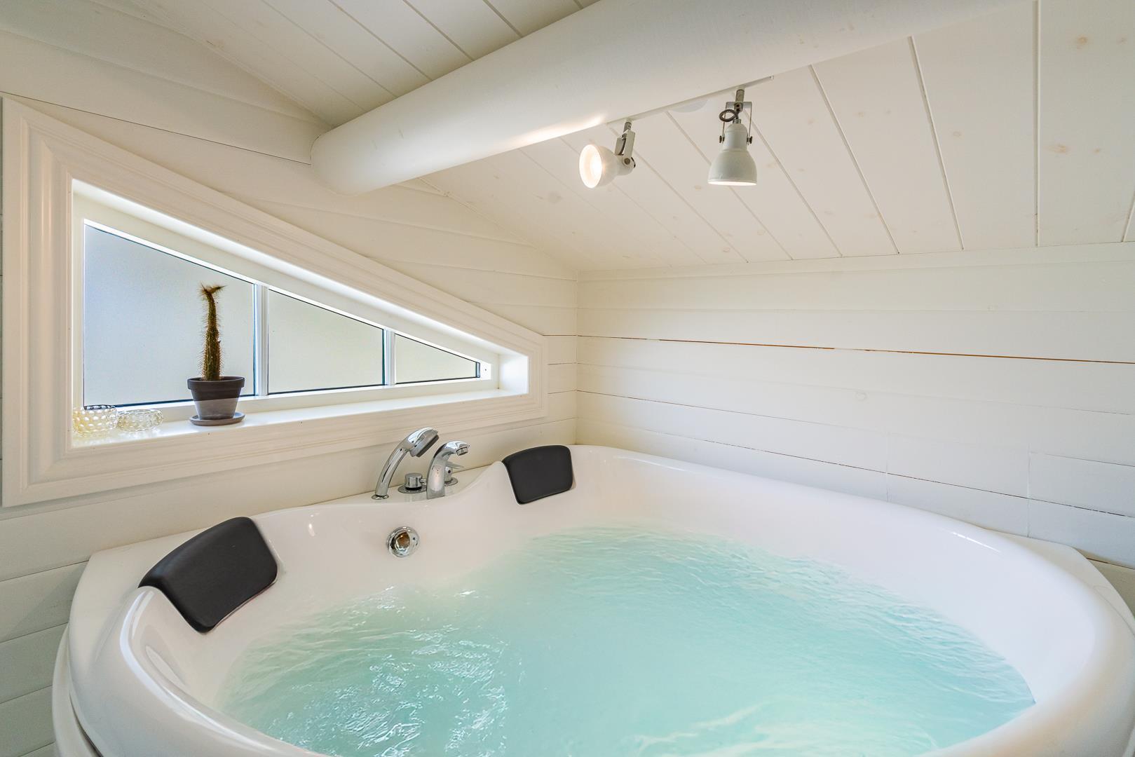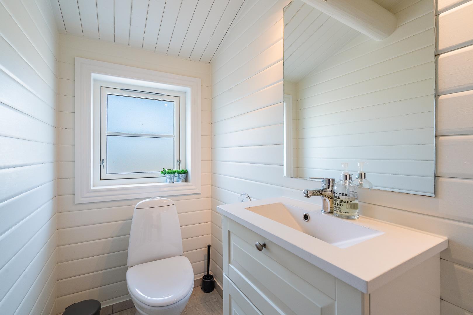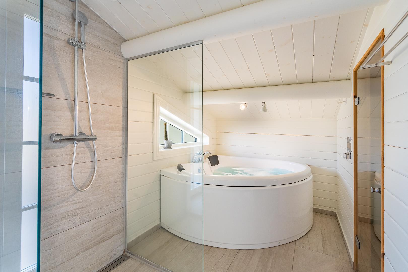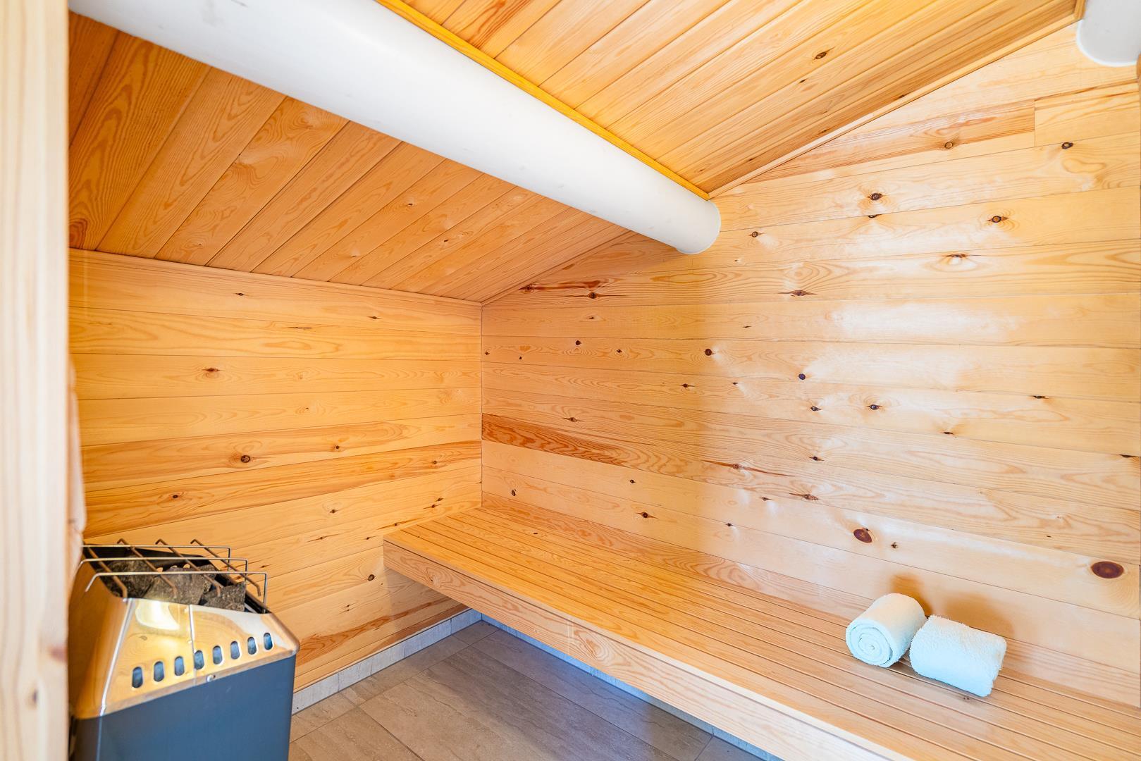 Badeværelset er udstyret med både spa og sauna, og der findes desuden et ekstra gæstetoilet for øget komfort.