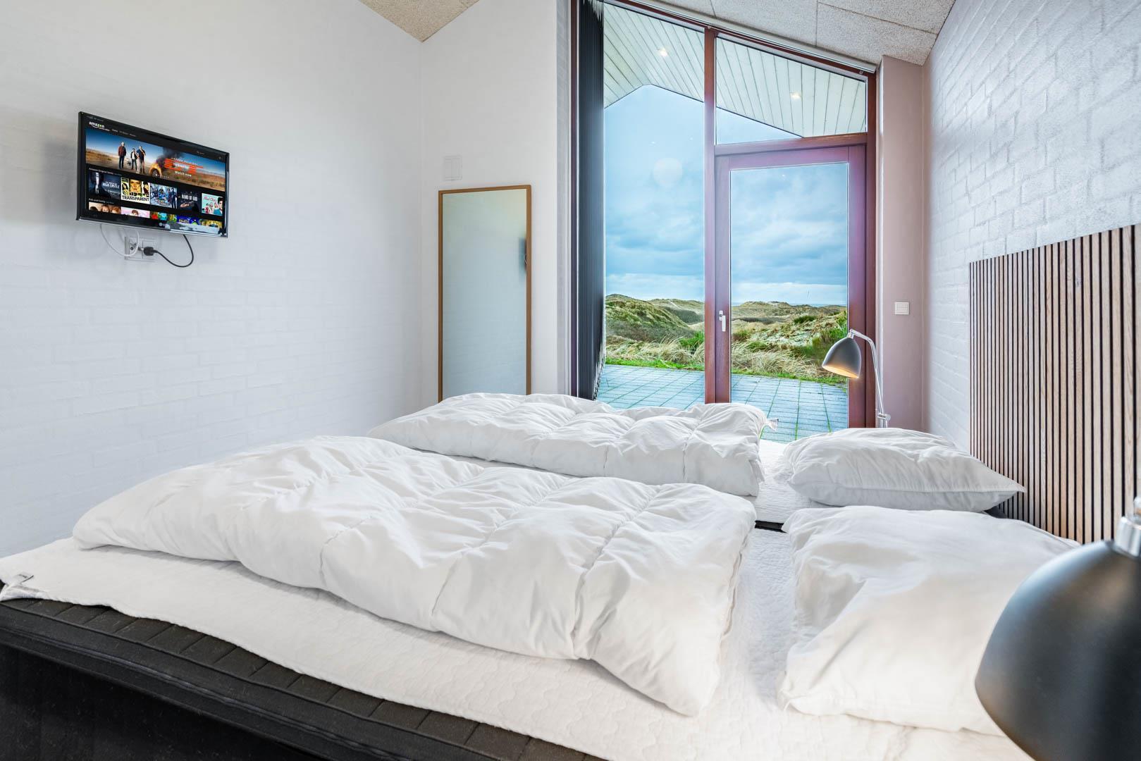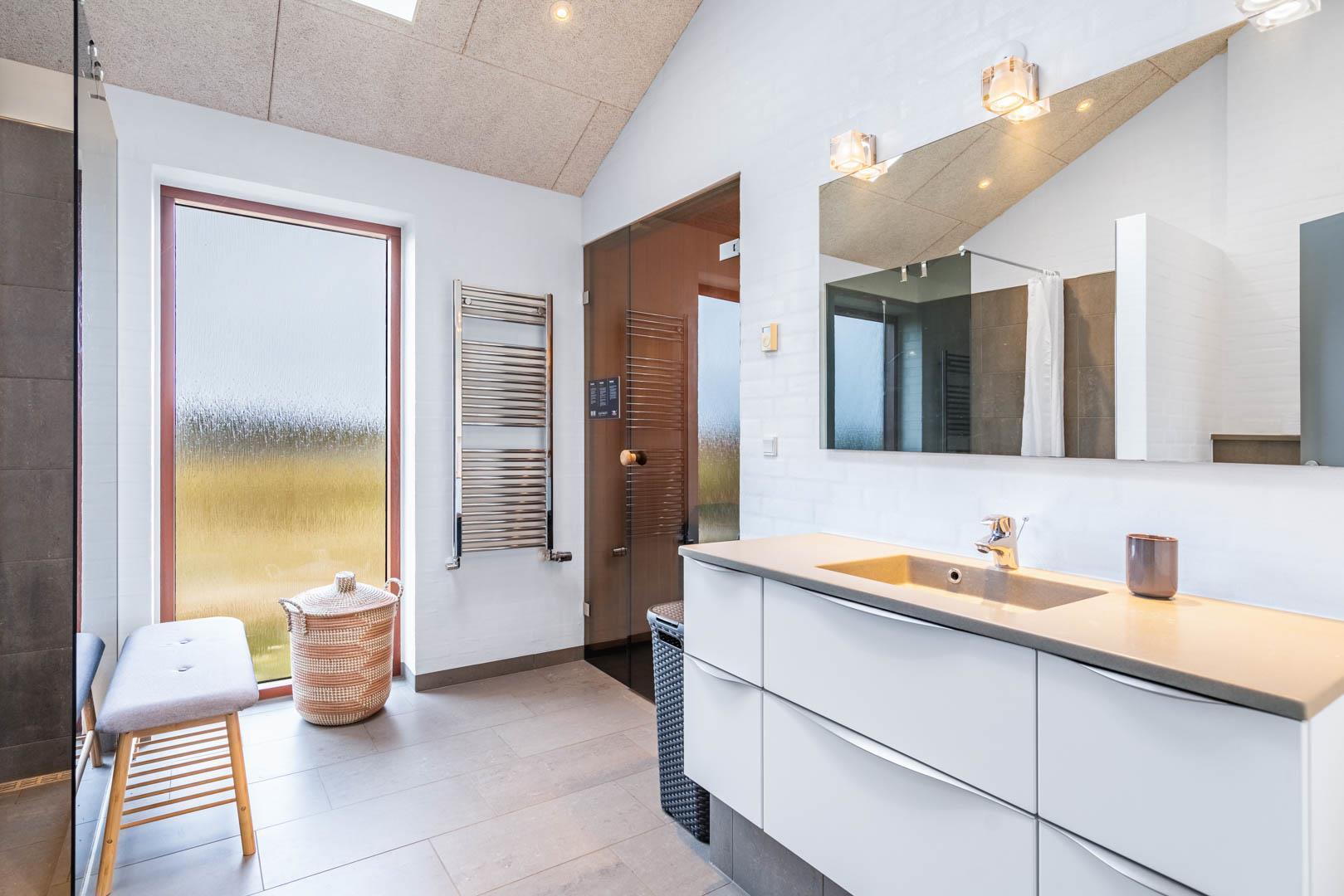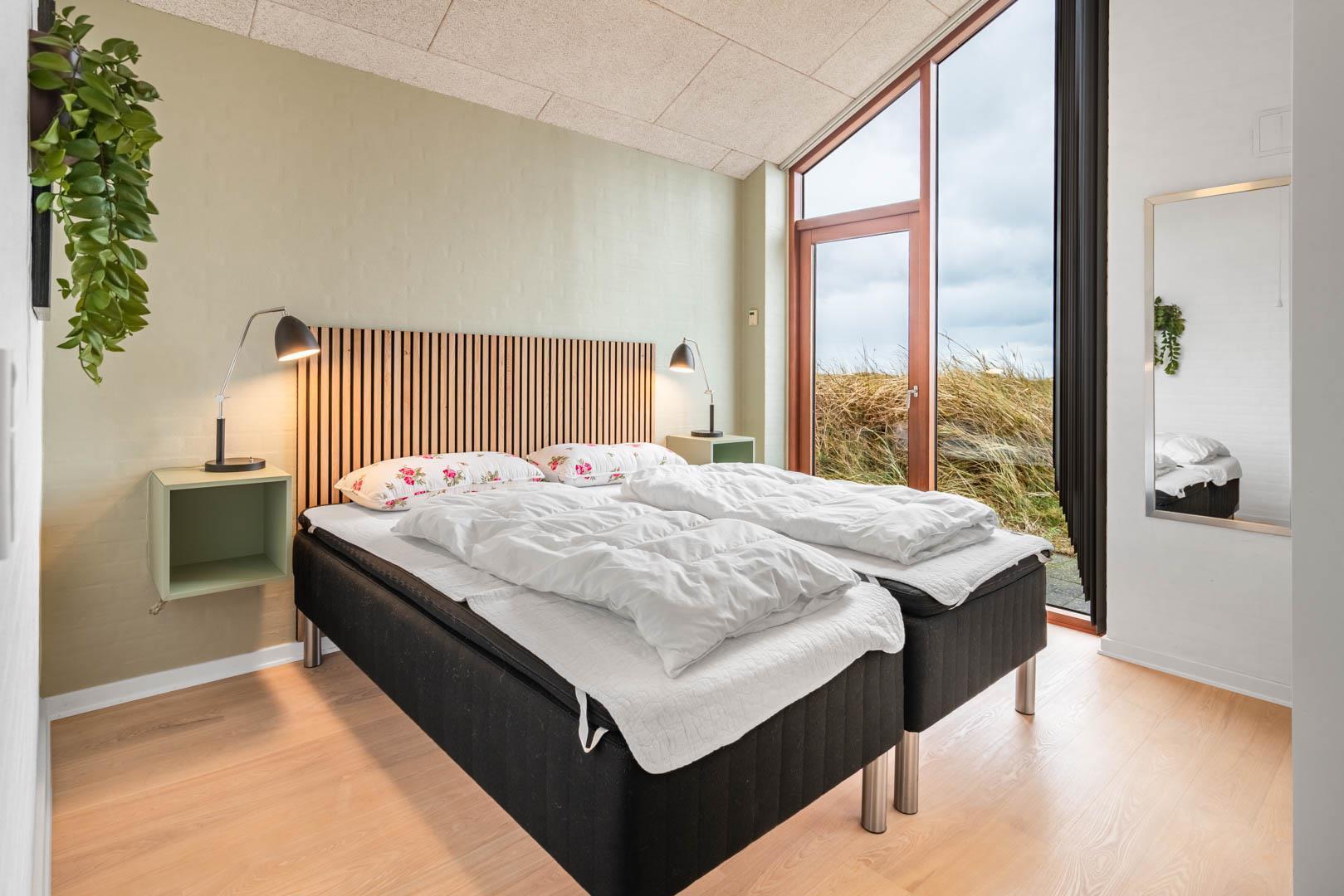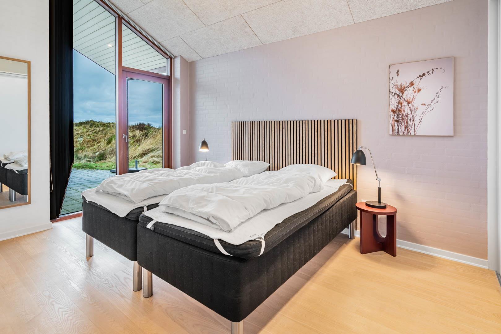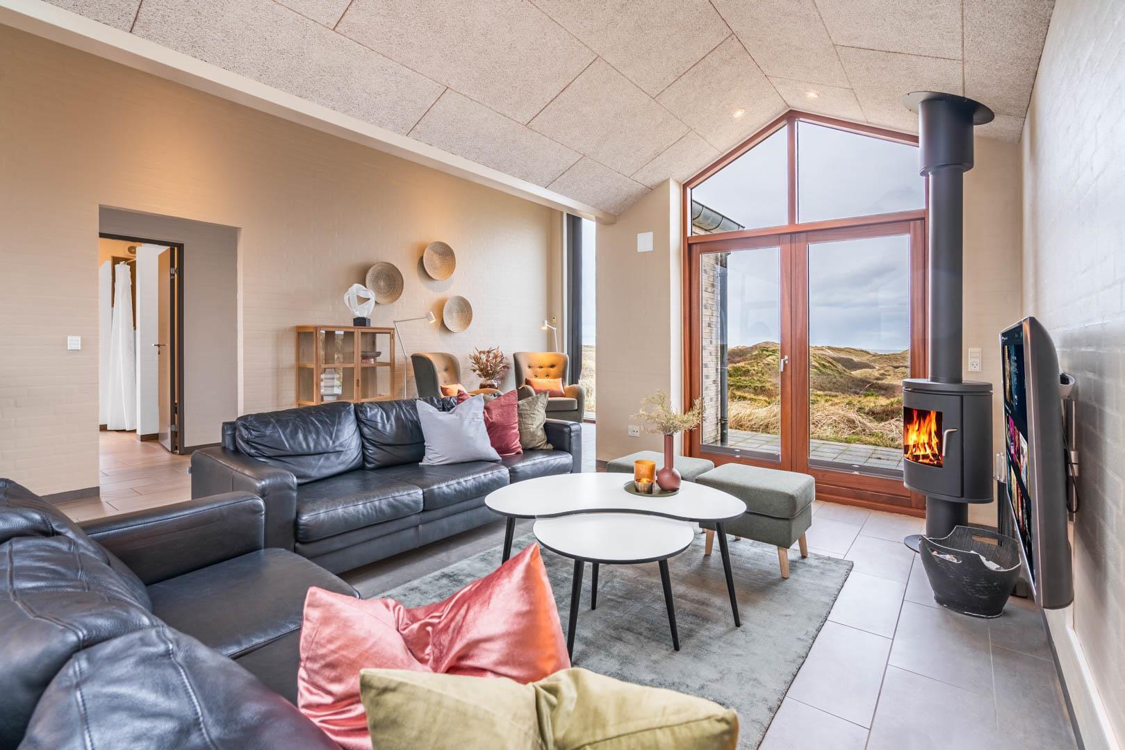 Stuen er en del af det åbne og højloftede opholdsrum, som er samlingspunktet for hyggelige stunder. Her kan I tilberede skønne feriemåltider i det lækre køkken eller spille brætspil i brændeovnens lune skær. Huset byder på seks sovepladser fordelt på tre rum med dobbeltsenge og to badeværelser, hvoraf det ene har en skøn sauna. Rundt langs sommerhusets vest-, syd- og østlige sider er der skønne terrasser, hvor I kan nyde en stille stund i solens stråler.