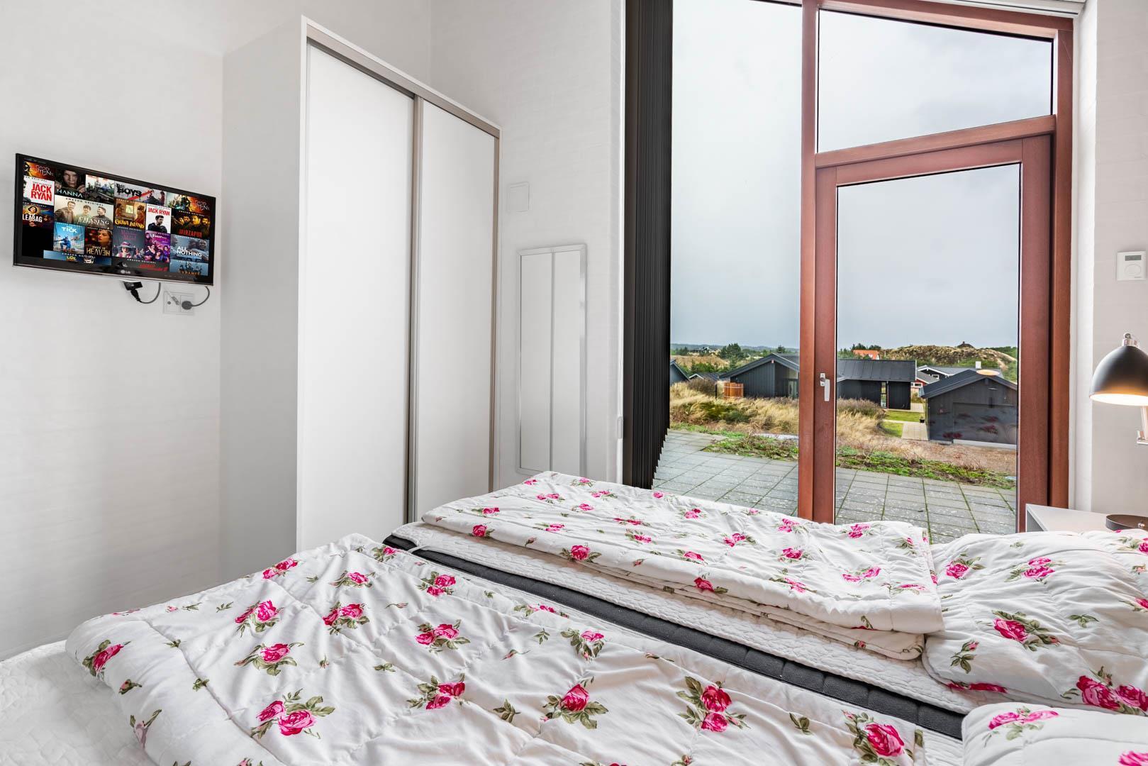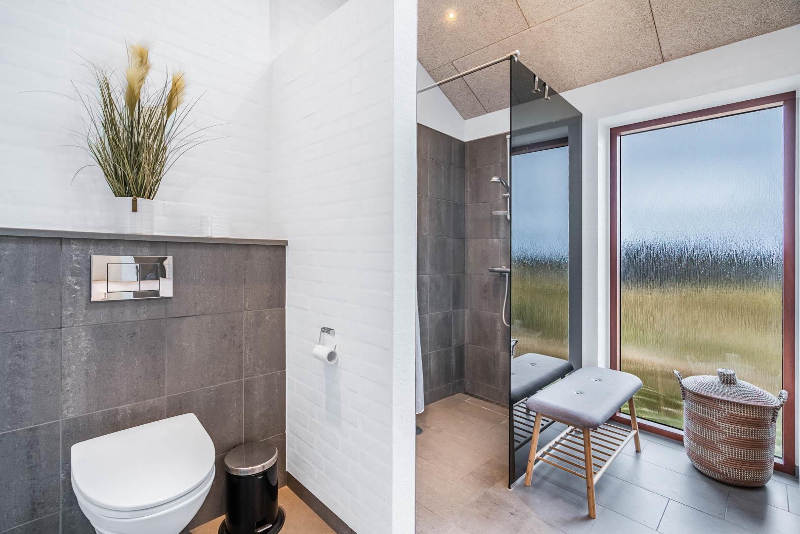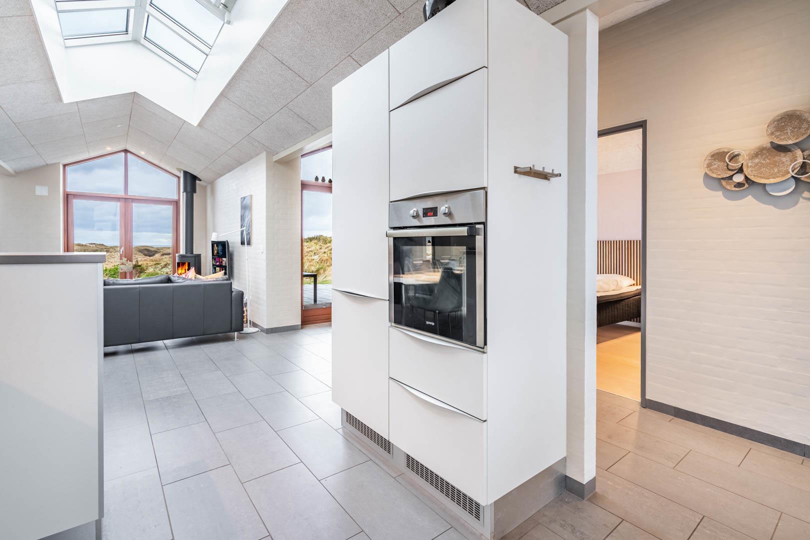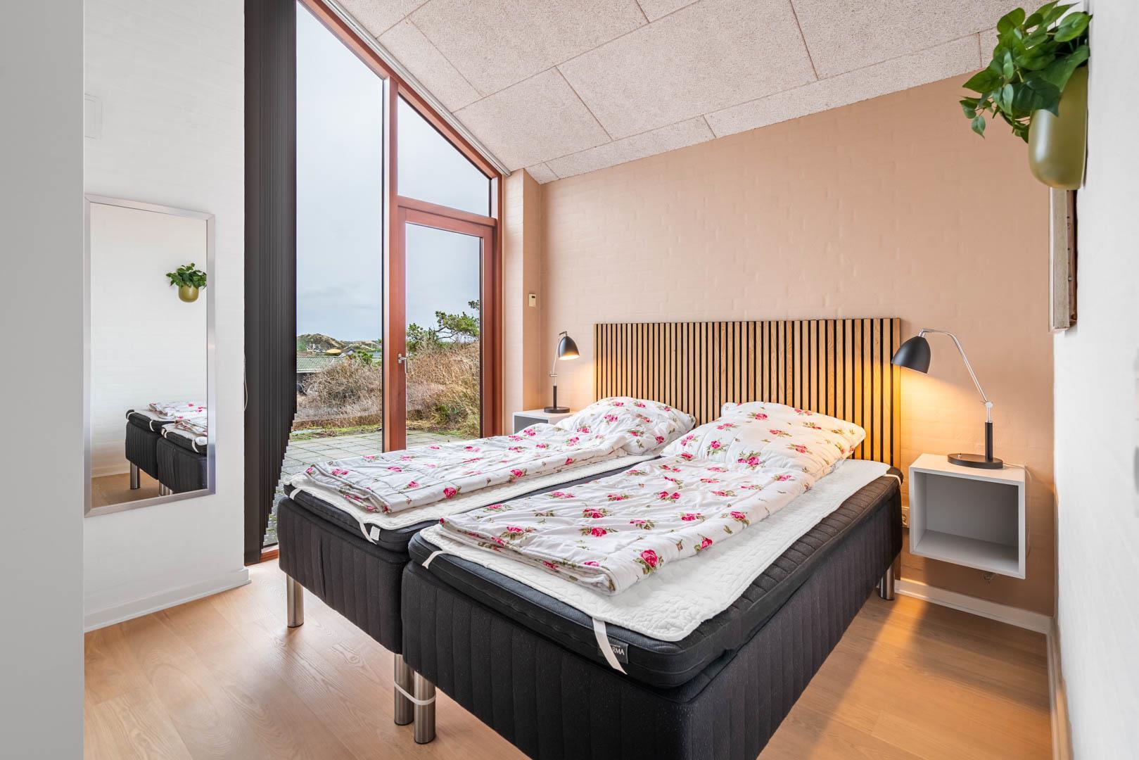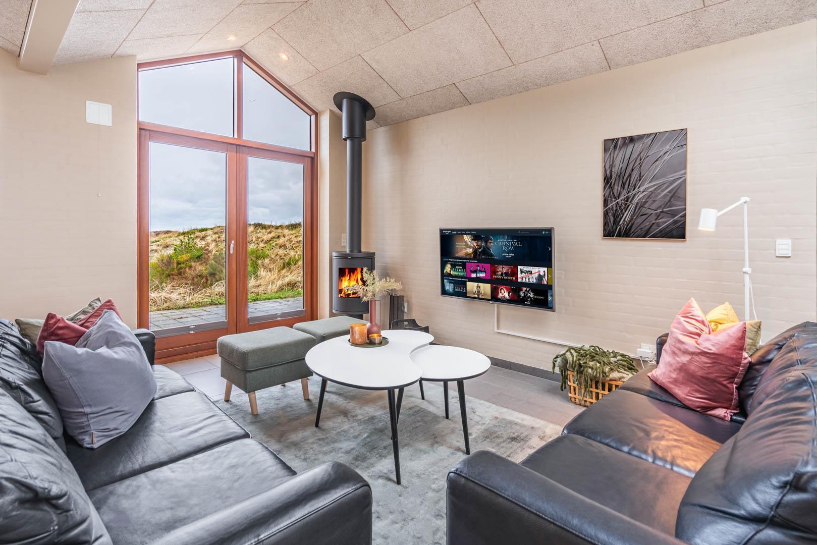 Stuen er en del af det åbne og højloftede opholdsrum, som er samlingspunktet for hyggelige stunder. Her kan I tilberede skønne feriemåltider i det lækre køkken eller spille brætspil i brændeovnens lune skær. Huset byder på seks sovepladser fordelt på tre rum med dobbeltsenge og to badeværelser, hvoraf det ene har en skøn sauna. Rundt langs sommerhusets vest-, syd- og østlige sider er der skønne terrasser, hvor I kan nyde en stille stund i solens stråler.